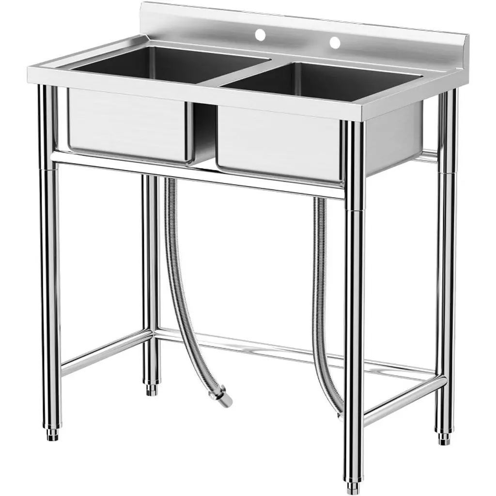 Stainless Steel Utility Sink, Commercial Prep Sink, Storage Shelf & Adjustable Legs for Kitchen, Laundry Room (Double Sink w/Faucet)