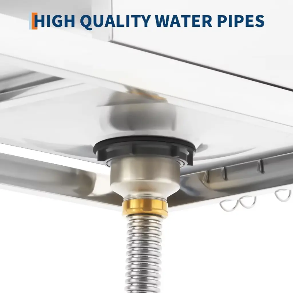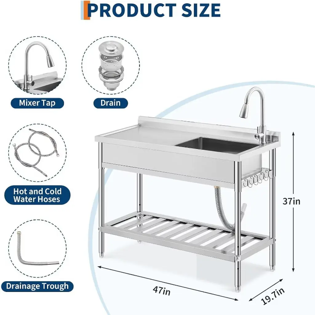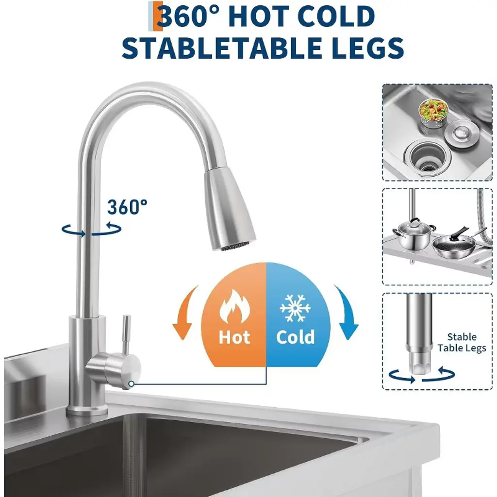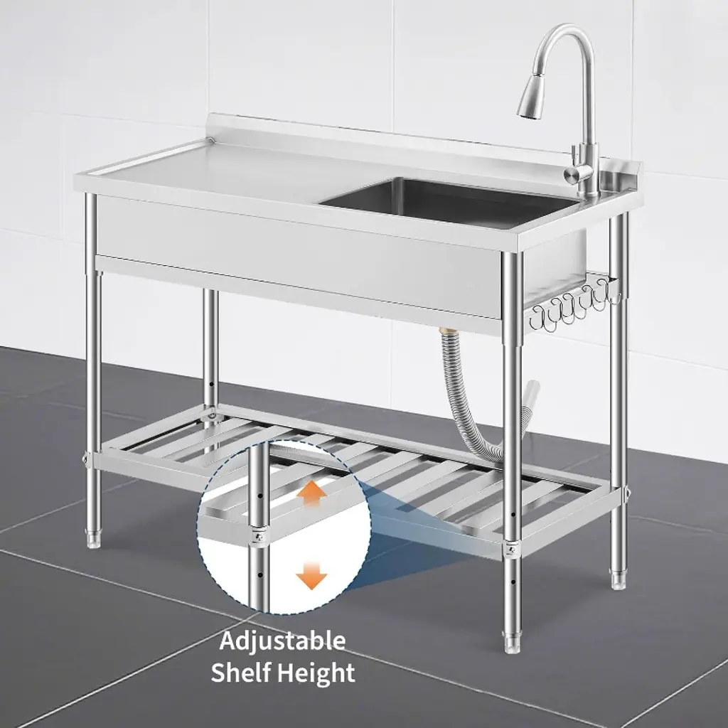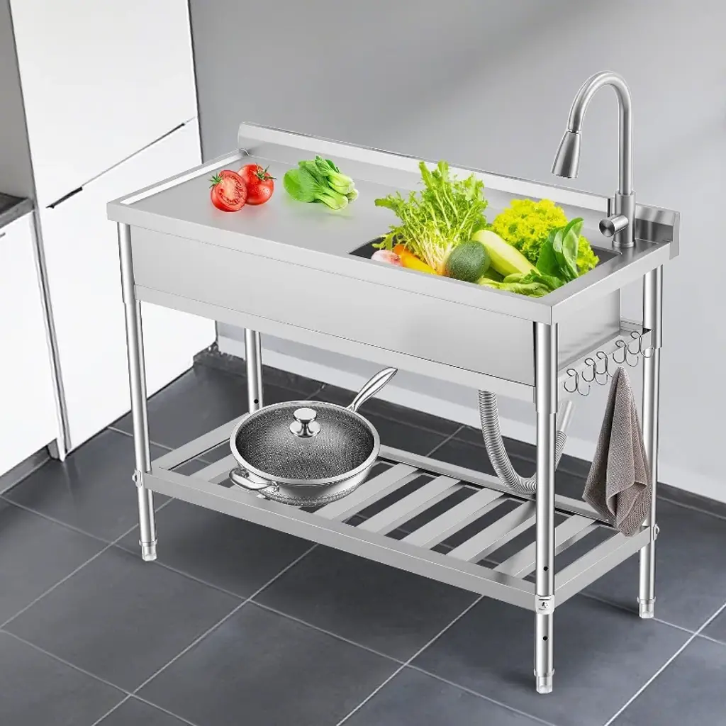 Every busy household or workspace needs a reliable spot to handle messy jobs - whether you're washing garden vegetables after a harvest, cleaning paint brushes from a weekend project, or tackling stubborn laundry stains. This commercial-grade utility sink brings professional functionality to your daily routine, designed to simplify your toughest cleaning tasks. Built with durable 304 stainless steel, this sink stands up to years of heavy use without rusting or staining. Unlike flimsy plastic tubs that crack over time, this one maintains its polished look through countless cleanups in garages, kitchens, or outdoor areas. The spacious work surface gives you room to scrub large pots or stack dishes, while the included S-hooks and bottom shelf keep cleaning supplies within easy reach - no more searching for that scrub brush when you need it. The professional 363° swivel faucet moves exactly where you need it, with precise hot and cold water controls for everything from delicate handwashing to powering through greasy tools. Adjustable legs ensure stability on uneven floors, whether you're using it in your garage, backyard, or food truck. What really makes this sink special is how it adapts to your needs. Use it as a prep station for holiday cooking, a pet washing area, or an outdoor cleaning table after muddy adventures. The integrated knife holder keeps sharp tools safely stored but accessible, while the freestanding design means no complicated installation - just connect your water lines and start using it immediately. From farm to workshop to laundry room, this versatile sink handles whatever comes its way while keeping your space organized. After years of struggling with inadequate cleaning areas, isn't it time you had a sink designed to actually make life easier?