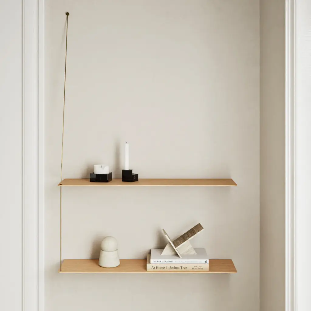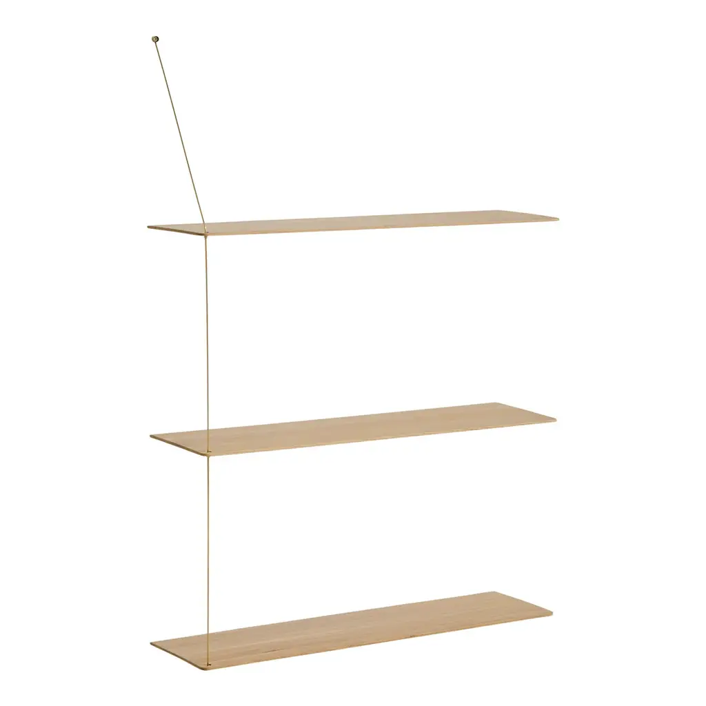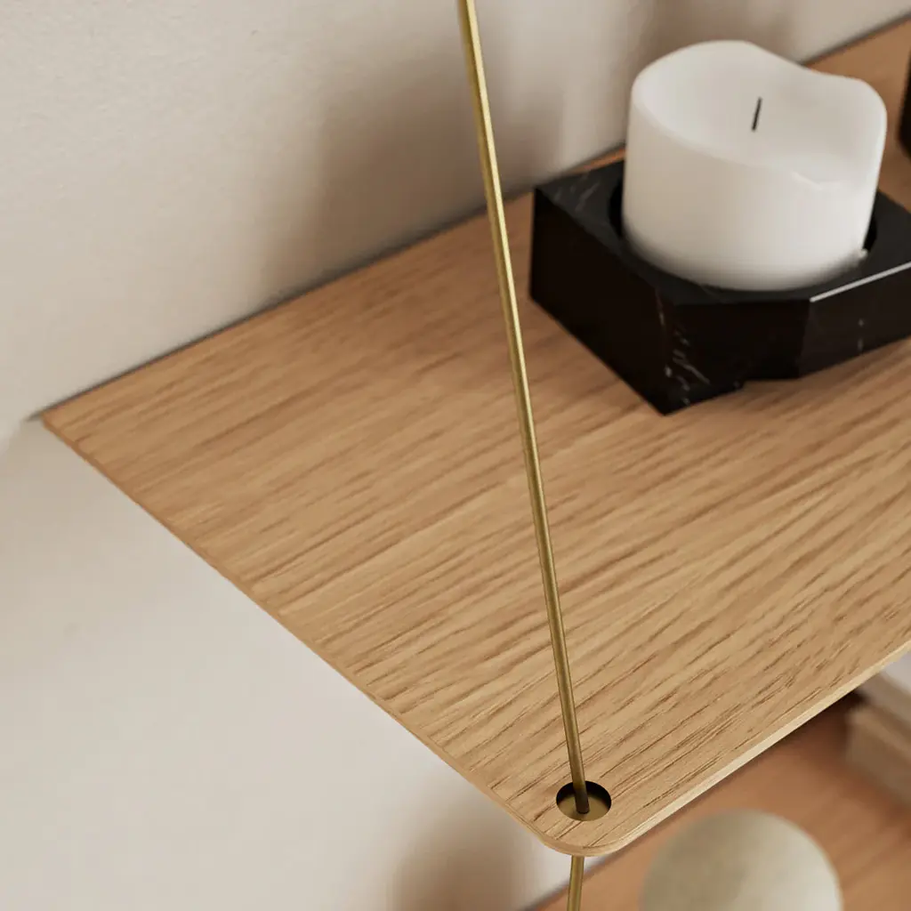 Introducing the Anniversary Edition of the Stedge Shelf with exclusive brass wires. A celebration of WOUD's 10th birthday in 2024. With the addition of brass details, this special edition exemplifies the timeless elegance of the original sophistication that marks a decade of WOUD. Being a true WOUD classic, the Stedge Anniversary Edition embraces purism and refined design through its solid oak shelves, fine edges and delicate brass wires.