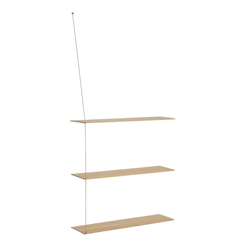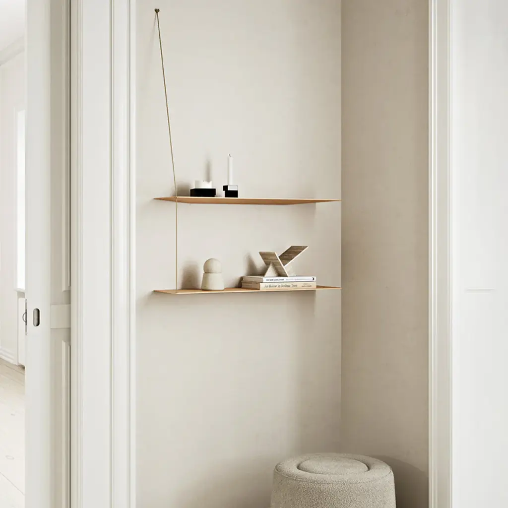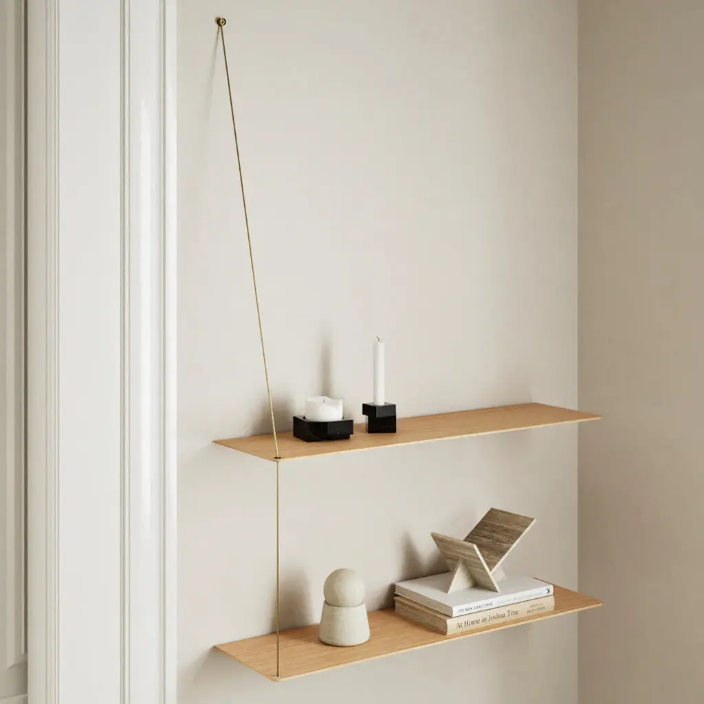 Introducing the Anniversary Edition of the Stedge Shelf with exclusive brass wires. A celebration of WOUD's 10th birthday in 2024. With the addition of brass details, this special edition exemplifies the timeless elegance of the original sophistication that marks a decade of WOUD. Being a true WOUD classic, the Stedge Anniversary Edition embraces purism and refined design through its solid oak shelves, fine edges and delicate brass wires.