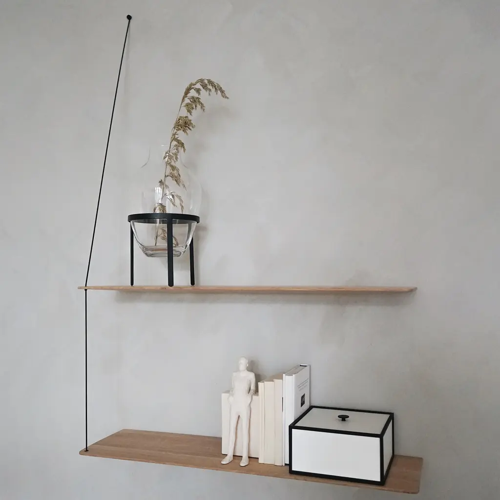 Designed to be visually light and pure with a clear structure, the Stedge Shelf from WOUD is an optical illusion, as the solid shelves appear to hang by a single thread. With its minimalist design and clean lines, this shelving system can be elongated with optional add-on shelves making it the perfect fit for at-home offices, bedrooms, and living spaces alike.Highlights