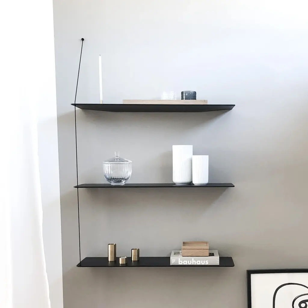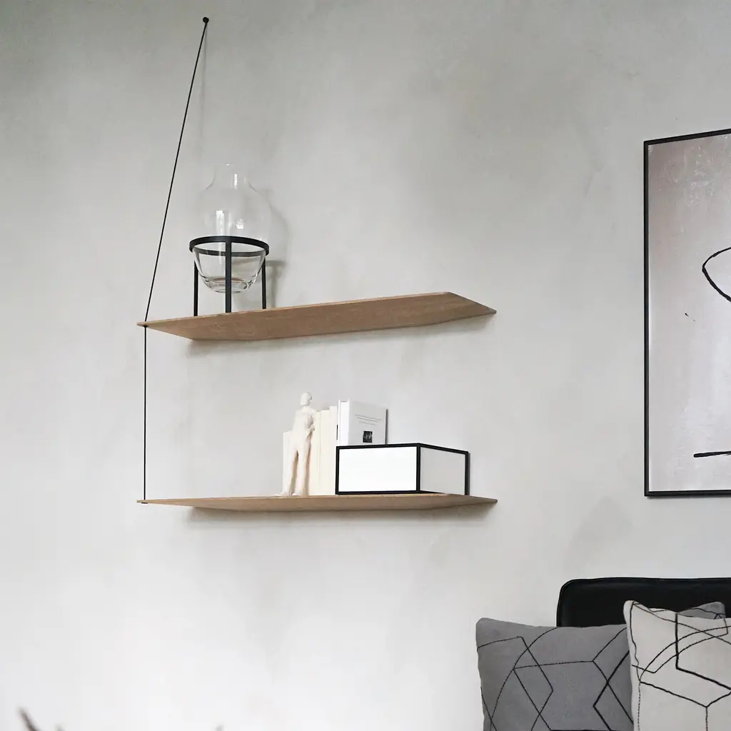 Designed to be visually light and pure with a clear structure, the Stedge Shelf from WOUD is an optical illusion, as the solid shelves appear to hang by a single thread. With its minimalist design and clean lines, this shelving system can be elongated with optional add-on shelves making it the perfect fit for at-home offices, bedrooms, and living spaces alike.Highlights