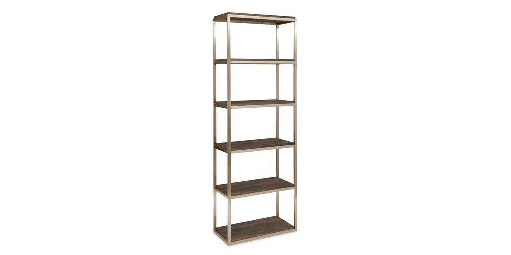 A simple, elegant addition, the Stella Shelf boasts a textured, antiqued gold iron frame adorned with dark brown hardwood shelves. Available in a 5 or 6 shelf design, effortlessly elevate and display collections, books, and memories in any room.