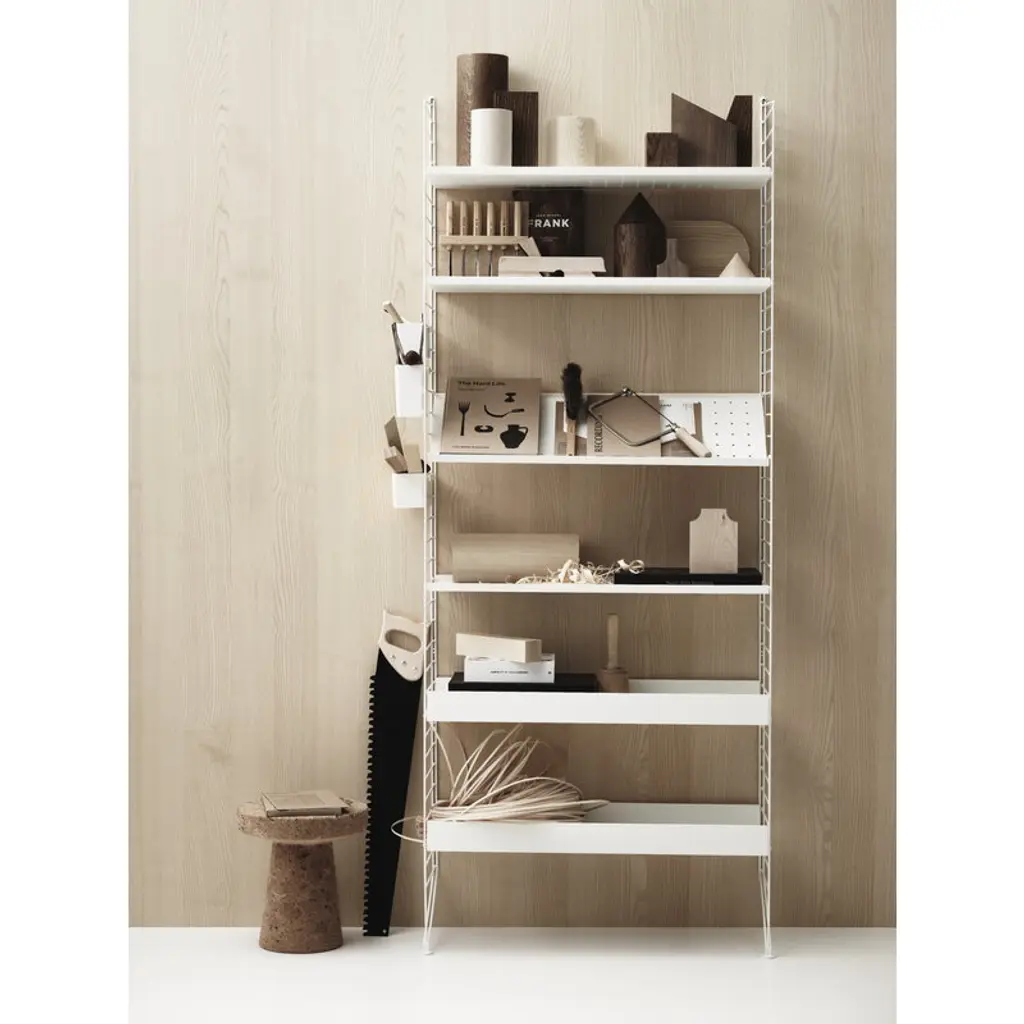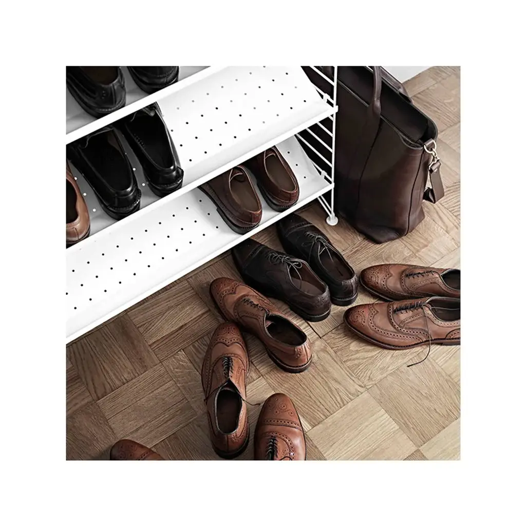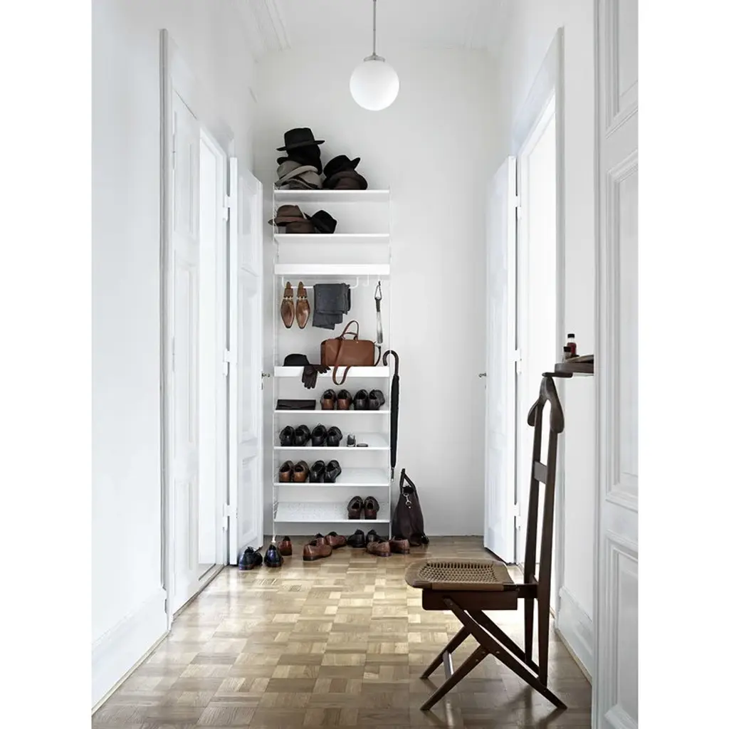 String metal shoe shelf is designed especially for storage solutions of hallways and walk-in closets. The shoe shelf combines with 11.81 in (30 cm) wide String side panels. String System is a flexible shelving system that Swedish architect Nils Strinning designed in 1949. The signature ladder-like side and floor panels can be combined with shelves, magazine shelves, desks, folding tables, chests and cabinets to form a system that best suits your needs. The timeless and minimalist design of String System is perfect for both contemporary homes and offices.