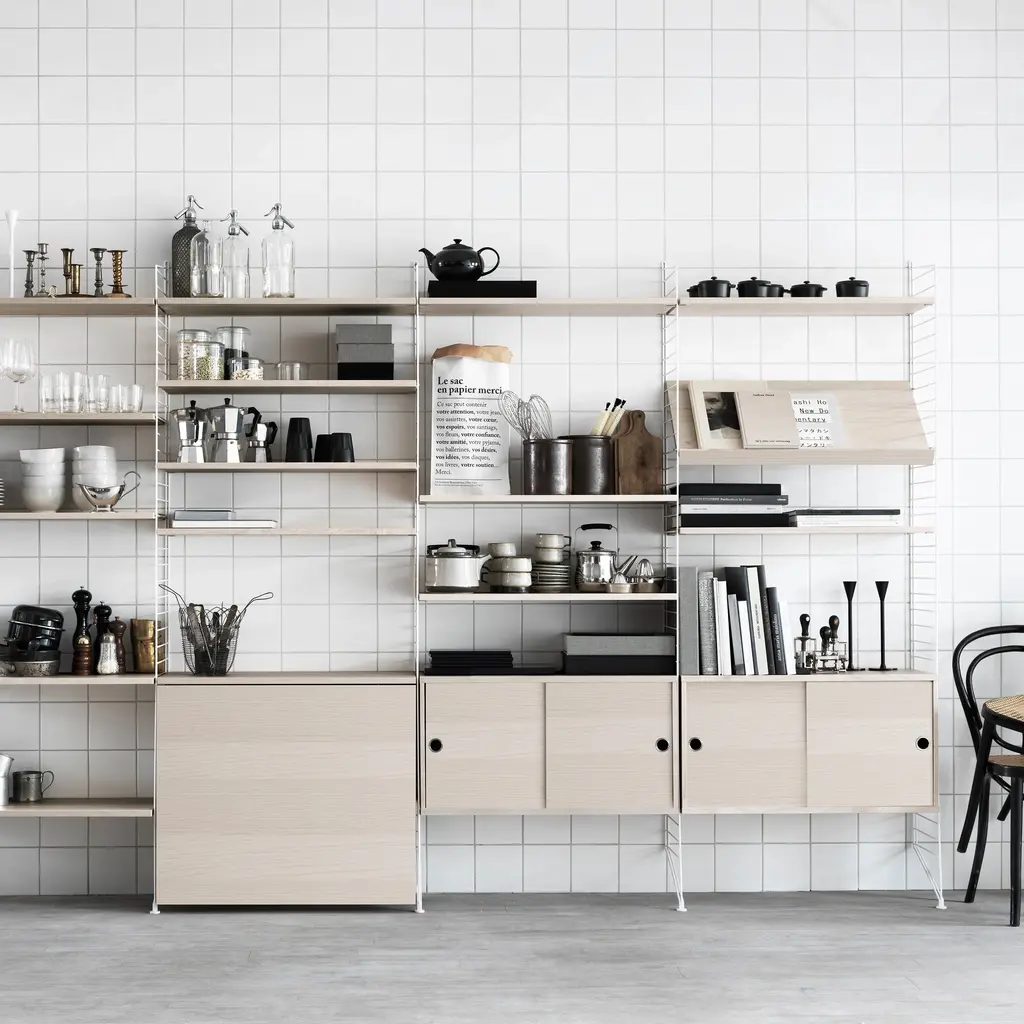 Another purposeful add-on for the String system is this angled shelf for magazines, in either lacquered wood veneer or solid colors. Besides a sheaf of periodicals, it might hold an open cookbook in the kitchen or reference work in a study. It’s yet another mark of the versatility of String’s iconic classic wire and plex panel shelving designed by Nisse and Kajsa Strinning.
