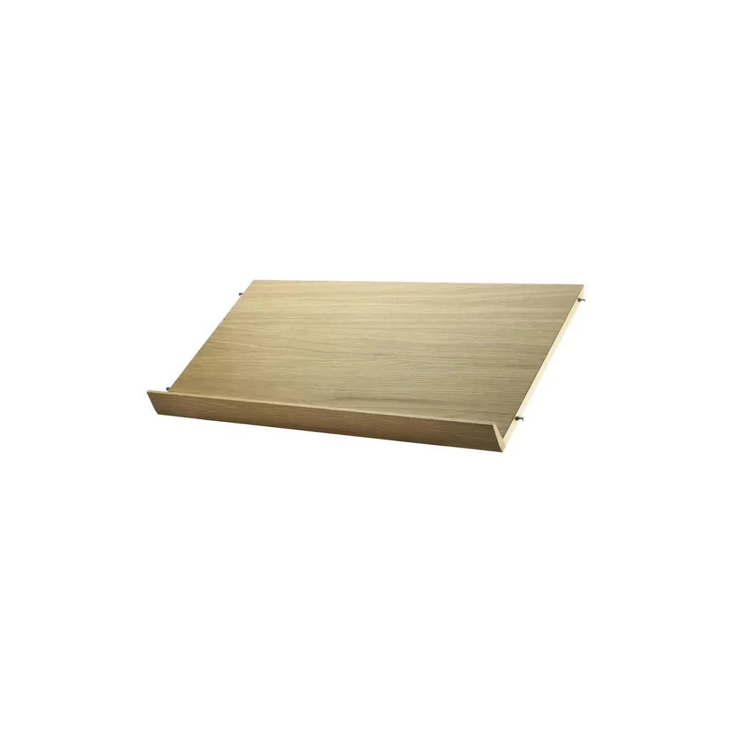 Another purposeful add-on for the String system is this angled shelf for magazines, in either lacquered wood veneer or solid colors. Besides a sheaf of periodicals, it might hold an open cookbook in the kitchen or reference work in a study. It’s yet another mark of the versatility of String’s iconic classic wire and plex panel shelving designed by Nisse and Kajsa Strinning.