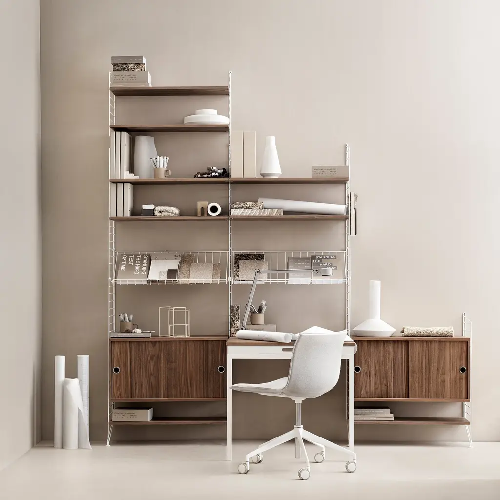 For a sheaf of magazines or perhaps to hold an open cookbook in the kitchen or show off a photo album, String offers an angled display shelf in its signature open metal wire. With a gloss powder-coat finish, it's available in 4 select hues to complement any chosen String wall unit. The thoughtful versatility of Nils and Kajsa Strinning’s iconic shelving system comes through once more with this useful addition.
