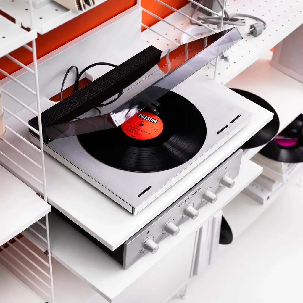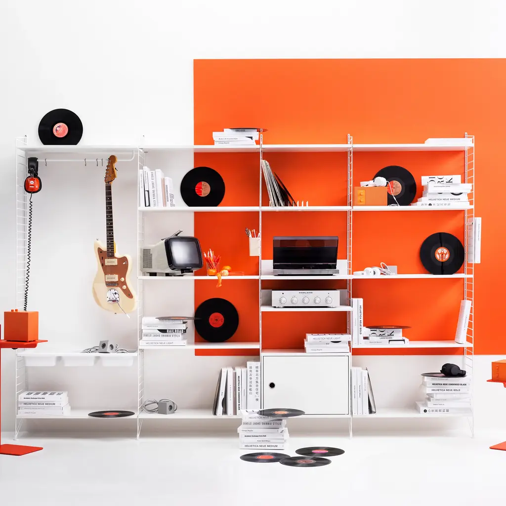 String’s aptly named Media Shelf makes a perfect spot for a vinyl-lover’s turntable setup with a rear opening to let cables and cords disappear out of sight. But It also could easily be used as a work surface, or even an easily accessible drinks serving area. With a lacquer finish, the shelf includes a stabilizing back panel along with installation brackets and fits into String’s standard wire panels.