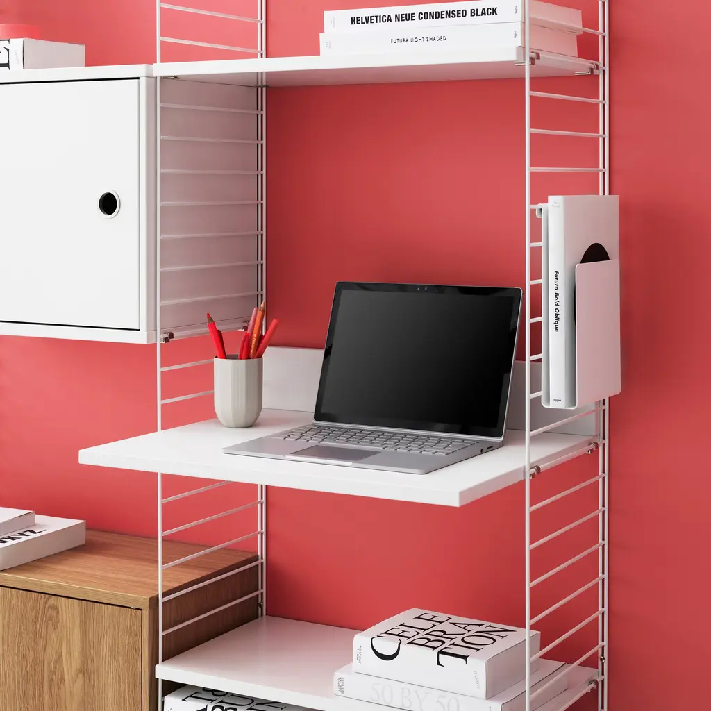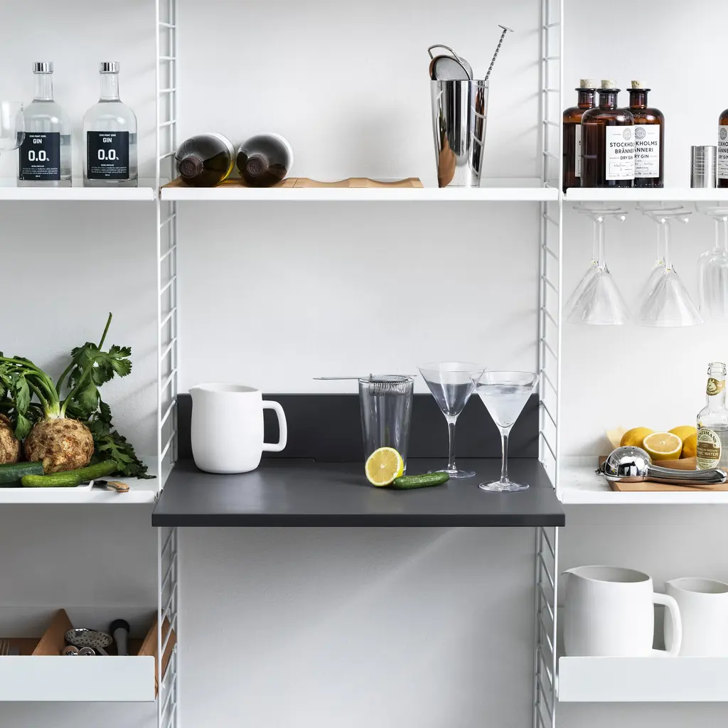 String’s aptly named Media Shelf makes a perfect spot for a vinyl-lover’s turntable setup with a rear opening to let cables and cords disappear out of sight. But It also could easily be used as a work surface, or even an easily accessible drinks serving area. With a lacquer finish, the shelf includes a stabilizing back panel along with installation brackets and fits into String’s standard wire panels.