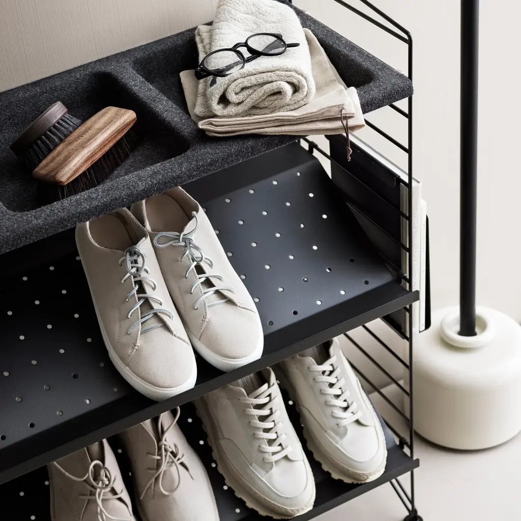 Available in a choice of 2 widths, String’s shelf for holding shoes keeps footwear securely in place with its slanted pitch. Made of fine-textured coated steel and offered in 4 color choices, it’s a useful addition to a bedroom or for closet storage. The add-on makes another fine example of the timeless versatility of Nils and Kajsa Strinning’s circa-1949 shelving system.