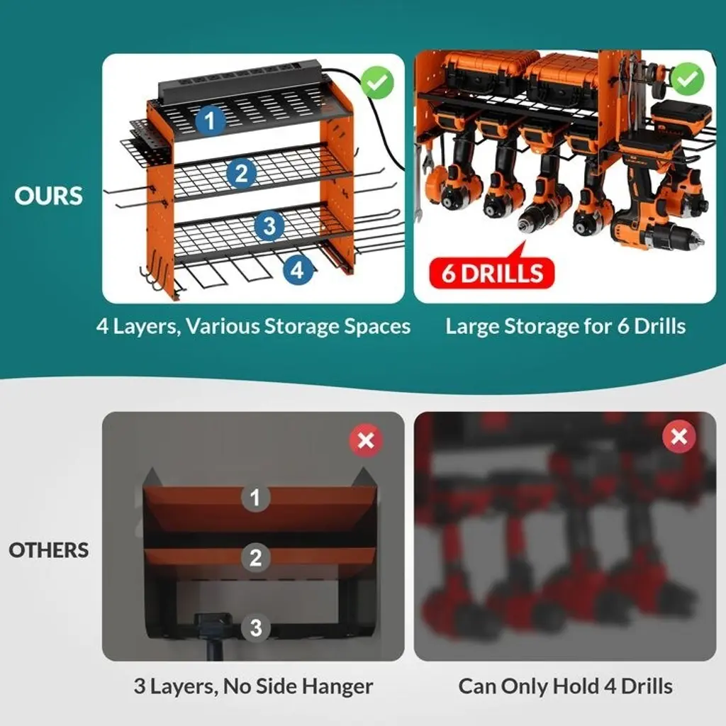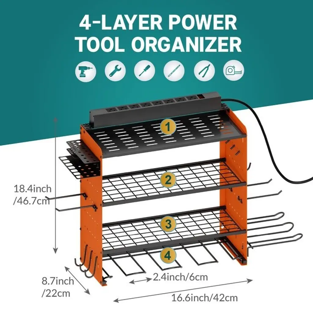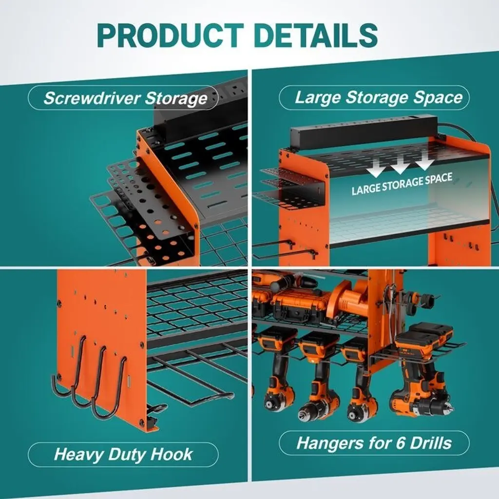 Sttoraboks Modular Power Tool Organizer, Wall Mount Garage 4 Drill Shelf Rack With Hooks, 8 Outlet Power Strip - Orange