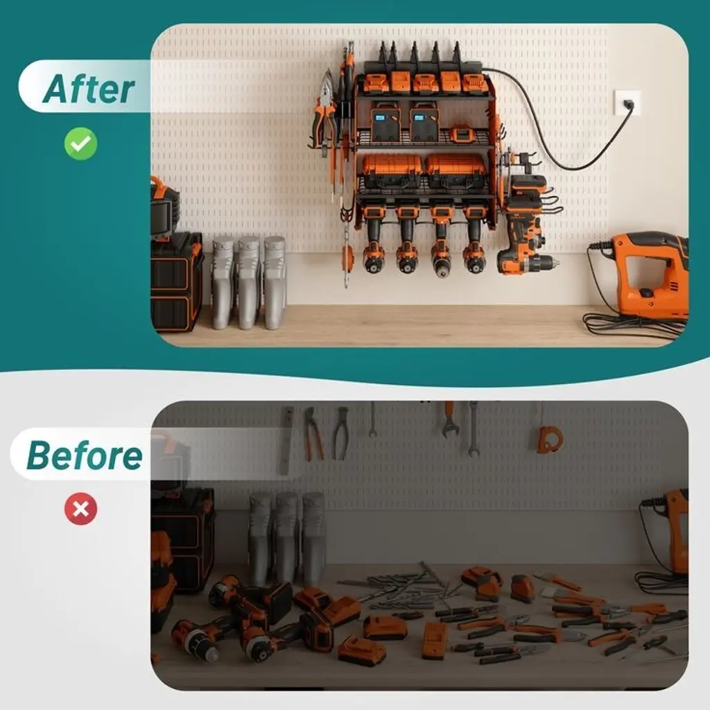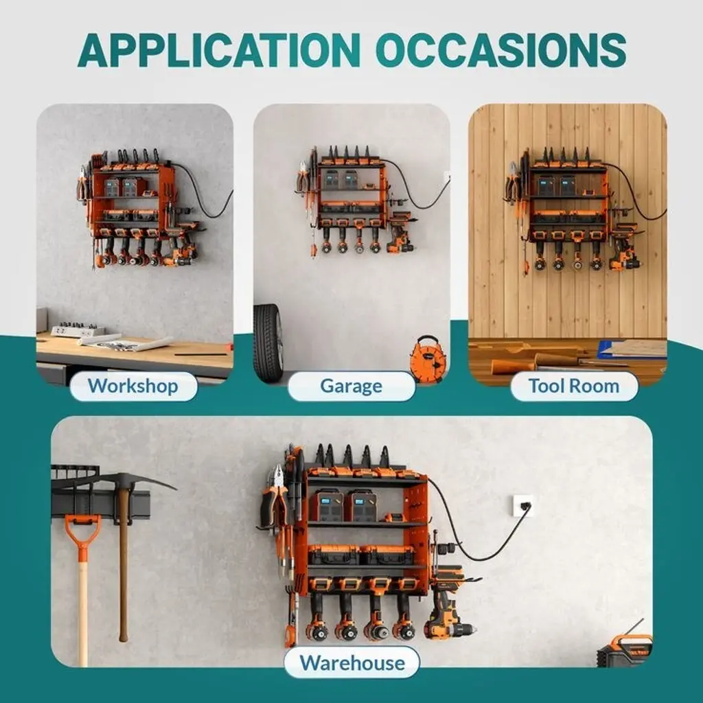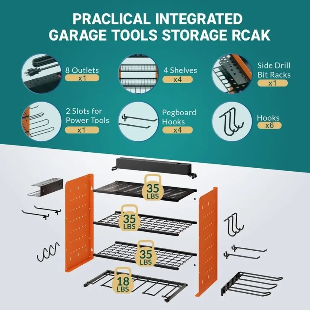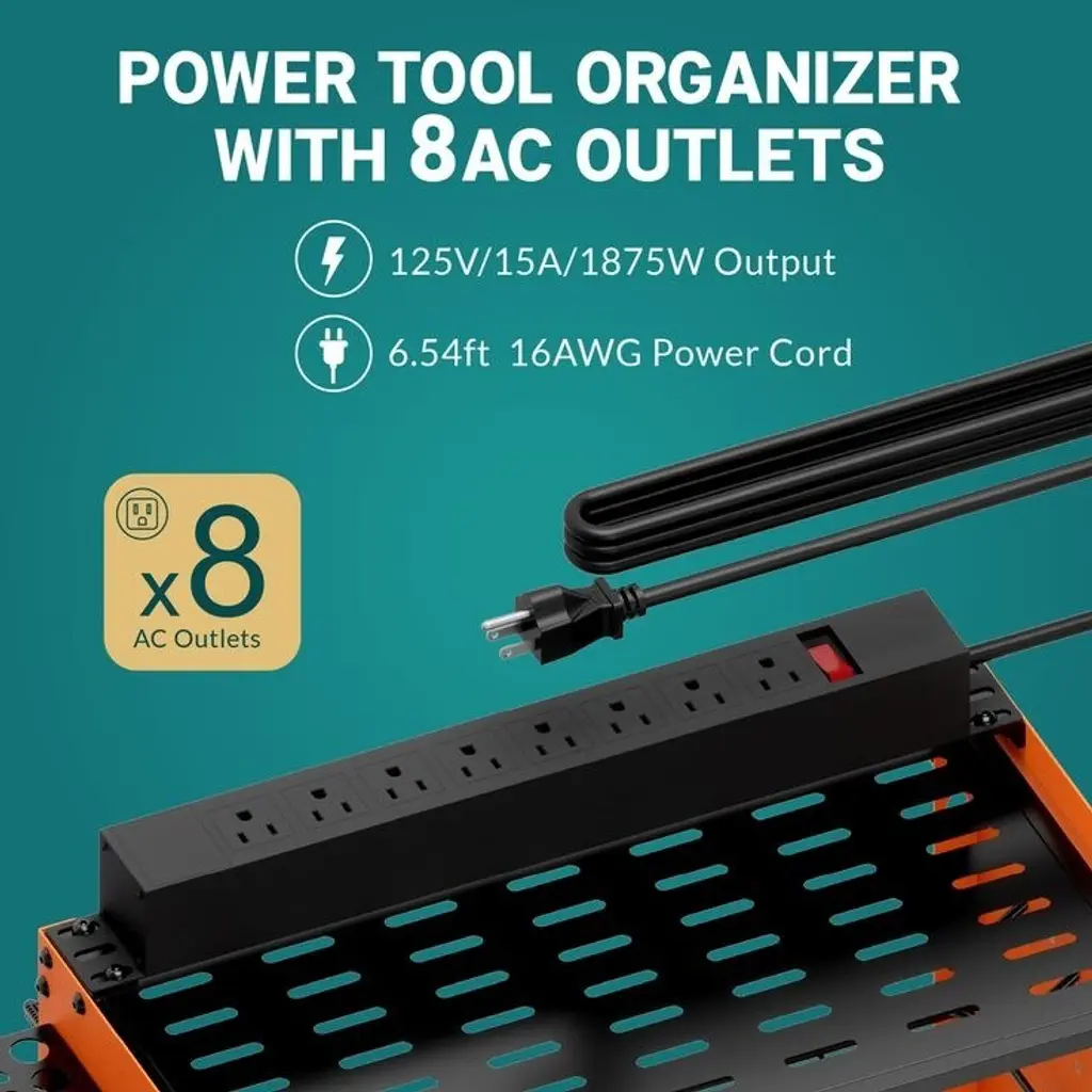 Wall-Mounted Electric Tool Organizer: Sttoraboks organizer features three spacious storage tiers, thoughtfully designed to accommodate a wide range of electric tools and their accessories. The top is outfitted with eight power outlets.Each shelf can support up to 35 pounds, completely alleviating any concerns about the rack bending, deforming, or tools falling.