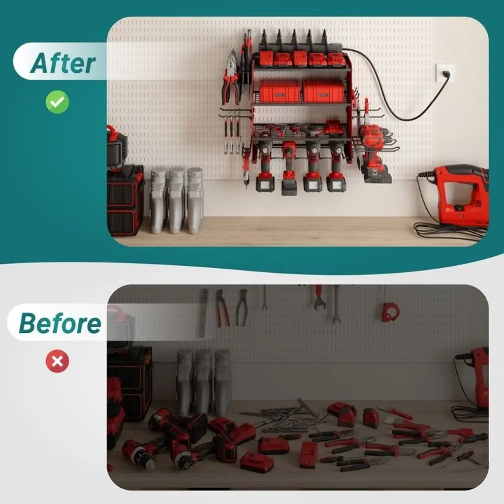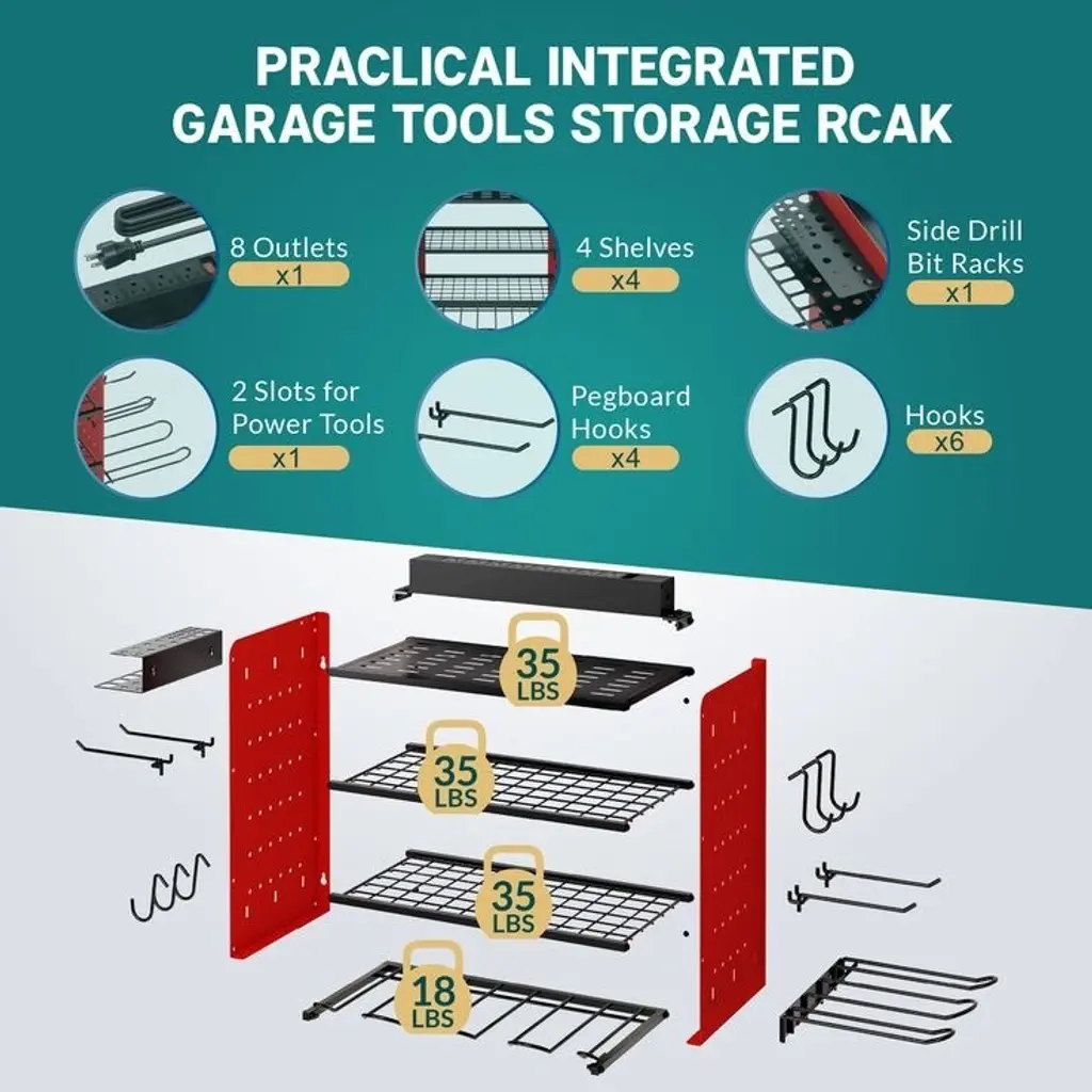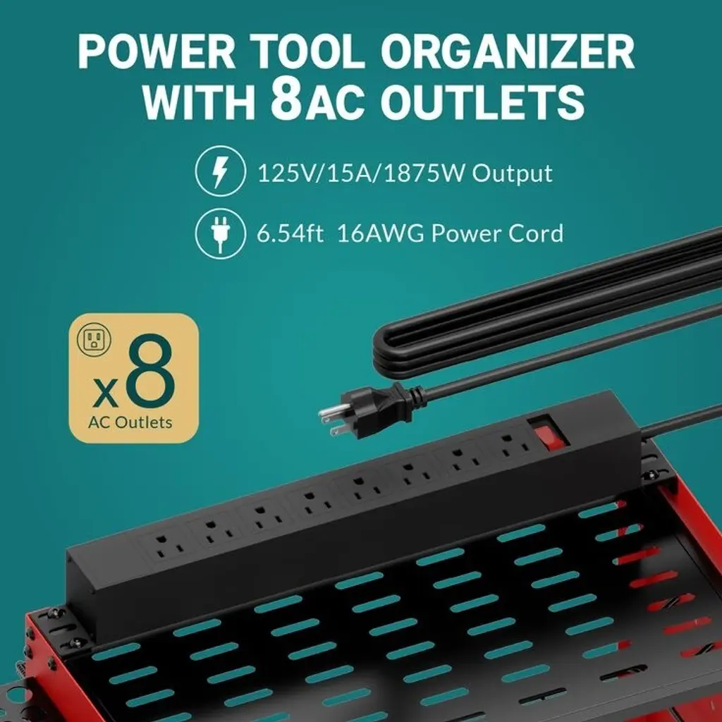 Wall-Mounted Electric Tool Organizer: Sttoraboks organizer features three spacious storage tiers, thoughtfully designed to accommodate a wide range of electric tools and their accessories. The top is outfitted with eight power outlets.Each shelf can support up to 35 pounds, completely alleviating any concerns about the rack bending, deforming, or tools falling.