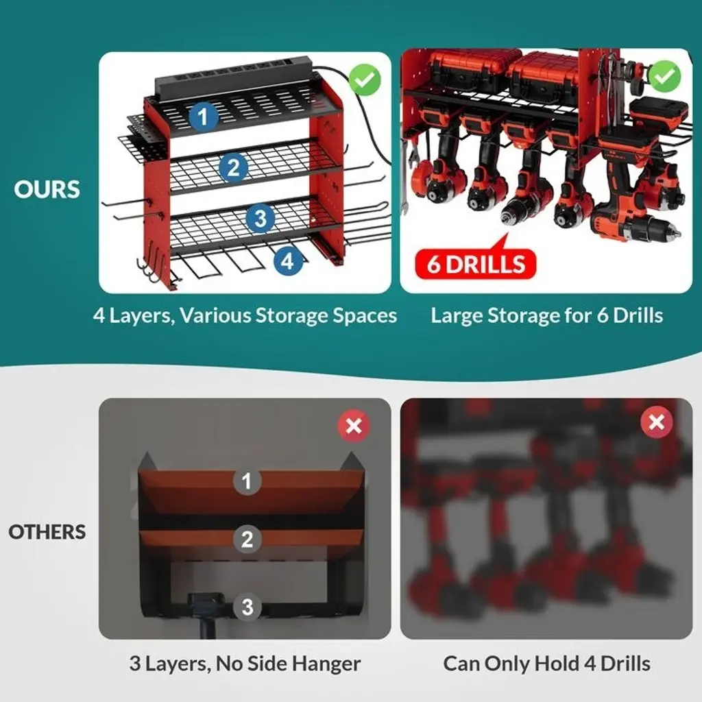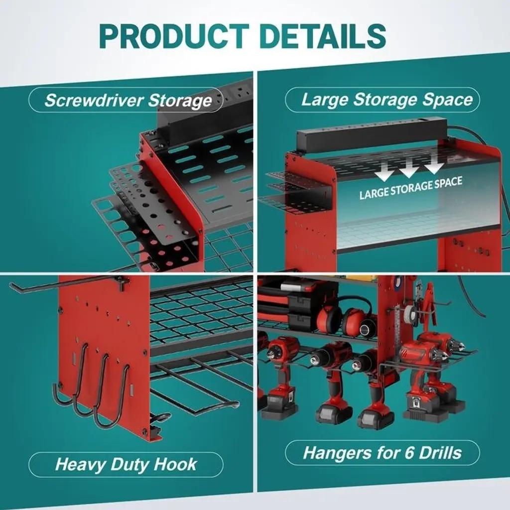 Sttoraboks Modular Power Tool Organizer, Wall Mount Garage 4 Drill Shelf Rack With Hooks, 8 Outlet Power Strip - Red