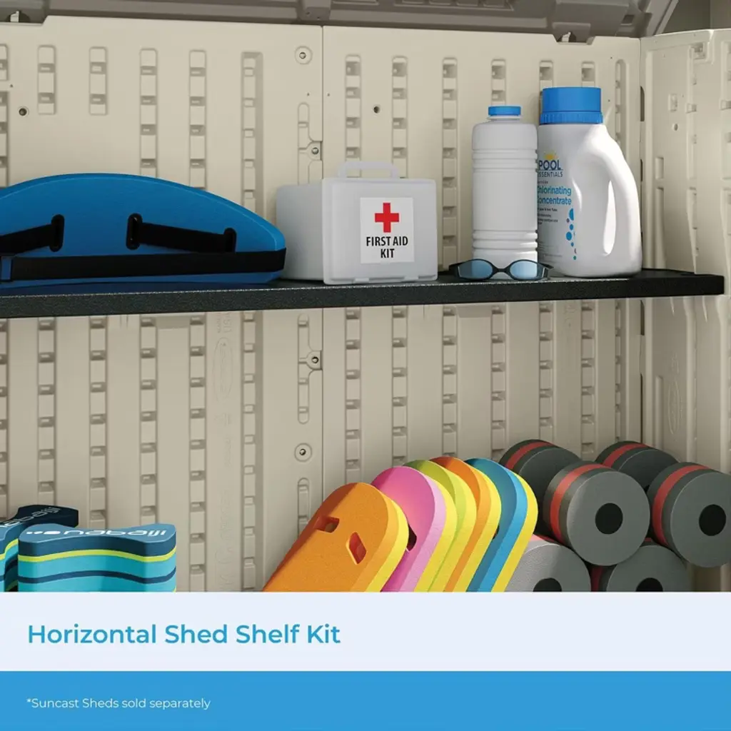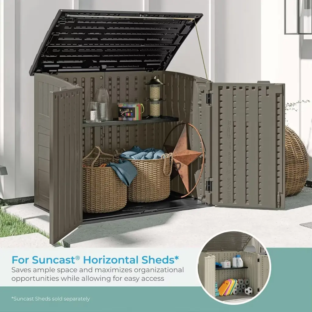 Upgrade your outdoor organization with the Suncast Horizontal Shed Shelf Kit, designed to bring smart storage solutions to your shed. Specifically built for Suncast Horizontal Sheds, this durable resin shelf helps maximize interior space without sacrificing accessibility. Whether you’re storing gardening gear, seasonal decorations, or essential tools, this shelf adds functional support while keeping everything within reach. The shelf is engineered with a 50-pound weight capacity, allowing you to store a wide range of items with confidence. It mounts securely to the shed wall and is compatible with up to 3 additional shelves (sold separately), giving you the flexibility to customize your space based on your needs. Use a shelf for compact tools or stack multiple to organize bulky gear with ease. Crafted from long-lasting resin, the shelf is built to withstand regular use and maintain structure through changing seasons. Its sleek finish pairs seamlessly with your shed interior, while its simple setup makes it an effortless addition to your storage system. The compact design optimizes every inch, making it an ideal upgrade for small or crowded sheds. Whether you're organizing a compact garden shed or a larger utility structure, the Suncast Horizontal Shed Shelf Kit provides added support, convenience, and efficiency. Designed with purpose and performance in mind, it helps turn your shed into a well-ordered storage hub.