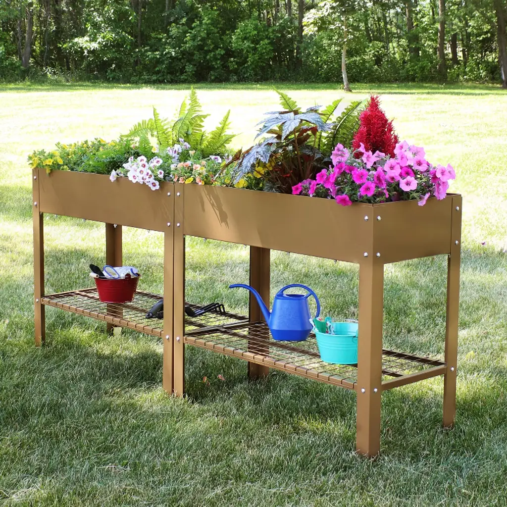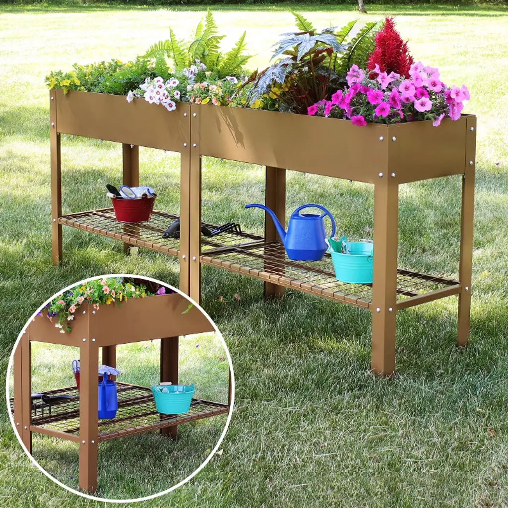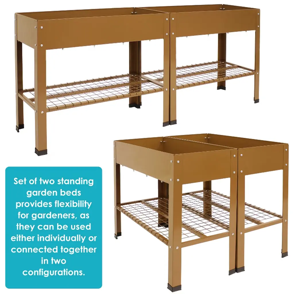 Grow beautiful flowers and bountiful vegetables without back straining or crouching down with these stylish and durable galvanized steel raised garden beds. This set of 2 standing planters can be used individually or connected together to create the best arrangement for your patio or garden. These raised garden beds are built to last with a durable steel construction and a rust-resistant, hot dip galvanized finish in classic brown for a sleek look. Plus, these raised garden beds with legs also feature a convenient lower shelf that can be used to store garden tools, gloves, and other supplies. With enough space to grow multiple plants all at the same time, this raised steel garden bed is sure to bring bright, beautiful blossoms to your home with ease. Light up your backyard or garden with this raised bed and watch your plants flourish. Everything needed to assemble this piece is included in the box.• RAISED PLANTER BOXES: Each raised garden measures 35.75" W x 16" D x 31.75" H and weighs 25 lbs. The inner garden bed measures 35.5" W x 15.75" D x 7" H. The shelf measures 30.5" W x 16" D and is 9.75" high off the ground. The garden bed has an overall weight capacity of 110 lbs and the bottom shelf can support up to 65 lbs. The overall unit has a weight capacity of 175 lbs.• QUALITY CONSTRUCTION: These stylish raised garden beds with legs are made from durable steel with a sleek, brown hot dip galvanized finish for lasting rust resistance and an elegant look. It also features eight rubber feet caps.• CONVENIENT CONFIGURATIONS: These elevated garden beds can be used individually or connected together. When connected side by side, they create a garden bed that measures 35.75" W x 32.25" D x 31.75" H. When connected end to end, they create a garden bed that measures 71.75" W x 16" D x 31.75" H.• LOWER STORAGE SHELF: Easily store gardening tools and supplies on the shelf beneath the raised planter box.• WORRY-FREE PURCHASING: Sunnydaze Decor backs its products with a 1-year manufacturer's warranty.