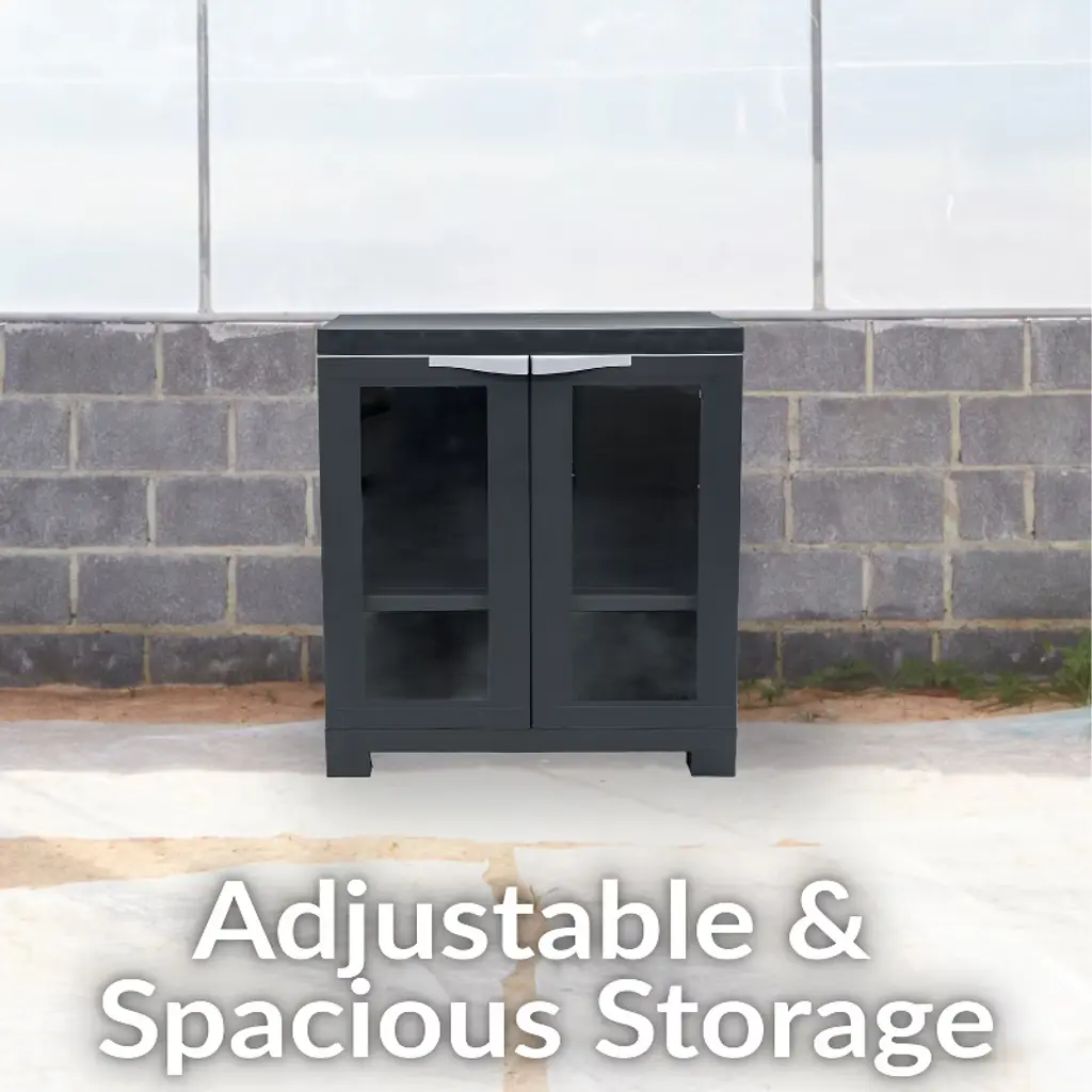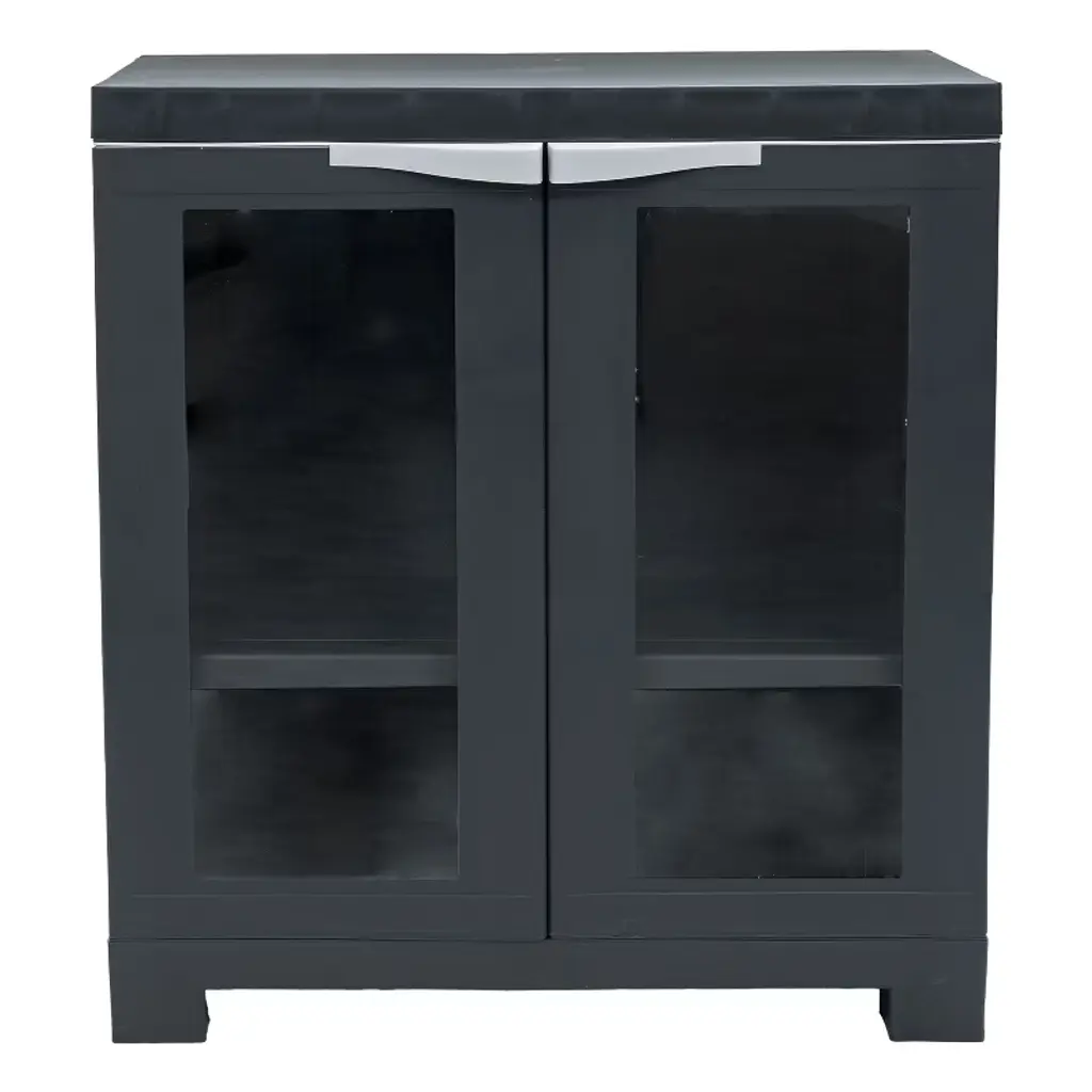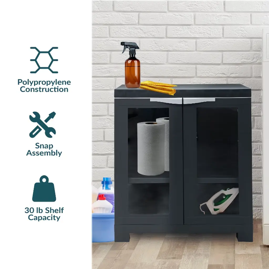Organize all spaces in the home with this heavy-duty resin office storage cabinet with doors. Designed for indoor use, this plastic utility storage cabinet provides a convenient place to keep tools, office supplies, games, cleaning supplies, and more in the mudroom, office, closet, garage, or shed. The resin storage cabinet is made from durable polypropylene plastic material. Polypropylene is durable and won't crack or peel over time. The smooth surface and material make this cabinet easy to clean; just use a solution of mild detergent and water to wipe away dirt. This cabinet can accommodate almost any common household item thanks to the adjustable shelf. The shelf can be adjusted in 4" increments to fit most storage needs. The opaque design of the cabinet keeps its contents out of sight for a clean, clutter-free look in any room.• CONVENIENT STORAGE: The plastic storage cabinet with doors is a convenient storage option for a closet, office, or garage. The cabinet measures 23.25" W x 13.75" D x 25.5" H overall and weighs 9.8 lbs. The adjustable shelf measures 21" W x 11.75" D x 1" thick and can be adjusted in 4" increments. The shelf holds 30 lbs, and the top of the cabinet holds 30 lbs. The doors each feature a 7" W x 17.75" H window to view the contents of the cabinet.• HEAVY-DUTY MATERIAL: Made from durable polypropylene, this freestanding garage cabinet is built to last. The windows are made from durable and shatterproof plexiglass to keep items protected and within view. Polypropylene is a heavy-duty material that is easy to clean. Just use a soft cloth, warm water, and a mild detergent to wash away dirt.• VERSATILE STORAGE SOLUTION: Use the storage cabinet with glass doors and shelves to contain tools, supplies, and more in the garage, or place it in a living room to organize books, board games, puzzles, and more. The cabinet is also great for storing office or cleaning supplies in a closet or home office space.• ADJUSTABLE SHELF: Easily store a variety of items in this plastic cabinet with doors by adjusting the shelf to fit most needs. The window-front doors of the cabinet keep the contents in view for quick and easy access to items. The see through doors also make the cabinet a great option for displaying collectible items or decor.• WORRY-FREE PURCHASING: Sunnydaze Decor backs its products with a 1-year manufacturer's warranty.