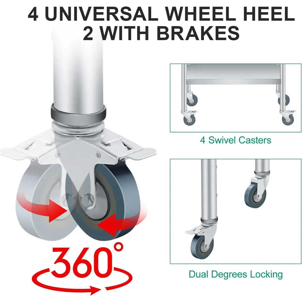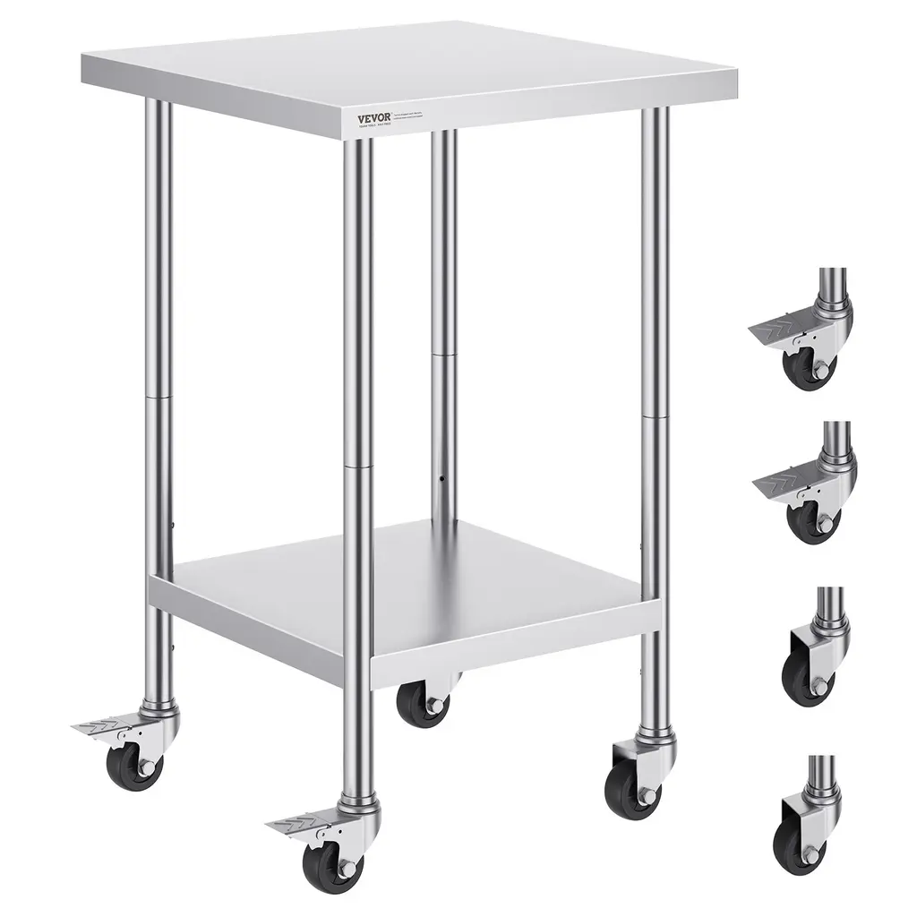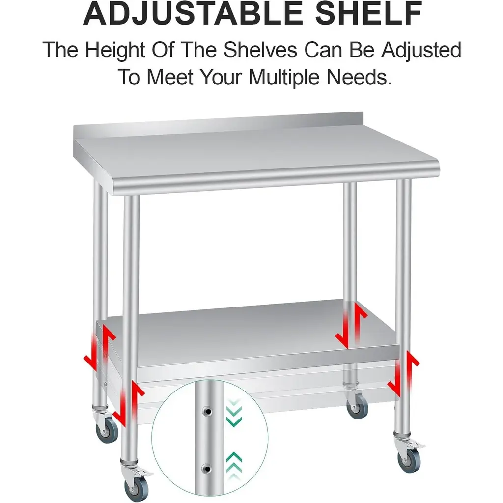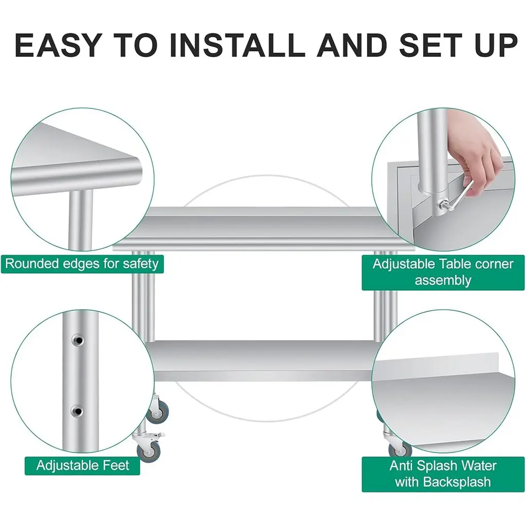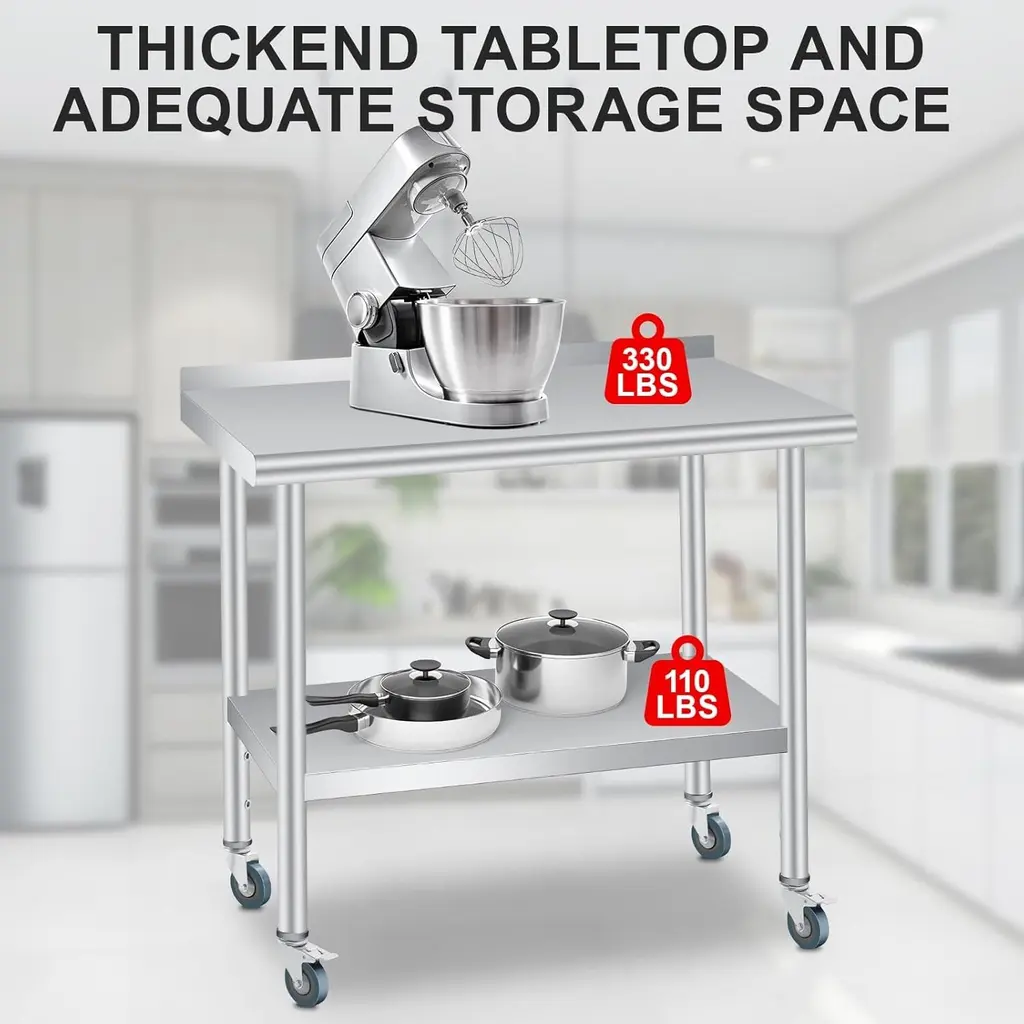 1. Super Thick & Durable Stainless Steel Construction Built with 0.8MM super-thick, rust-resistant heavy-duty stainless steel, this table is easy cleaning, and long-lasting durability in commercial kitchens, restaurants, Garden, Patio or home use.2. Enhanced Safety & Organization Featuring rounded edges to prevent injuries and a non-marring feet holder, this kitchen prep table maximizes workspace efficiency while keeping your area clutter-free and organized.3. Heavy-Duty Load Capacity This stainless steel prep table supports up to 330 lbs on the top surface and 110 lbs on the adjustable bottom shelf (with 3 height settings), providing robust vertical storage for heavy appliances, tools, or bulk ingredients.4. Versatile Multi-Scenario Use Perfect for food prep, garage workshops, or warehouse storage, this table delivers reliable performance in any environment with its scratch-resistant surface and sturdy design.5. Quick Assembly & Hassle-Free Setup Equipped with pre-drilled holes and clear instructions, this table assembles easily within minutes.