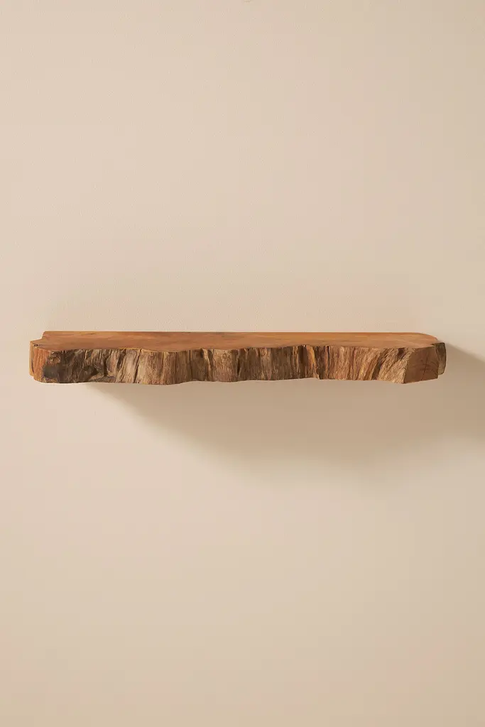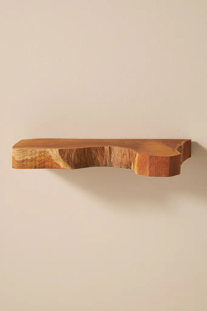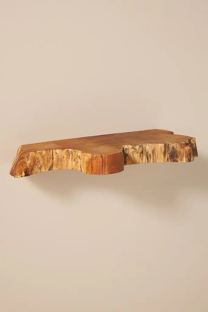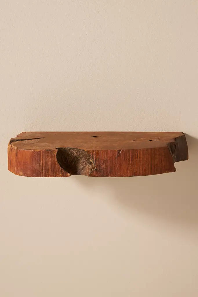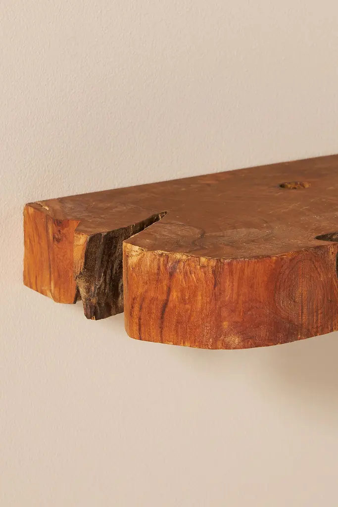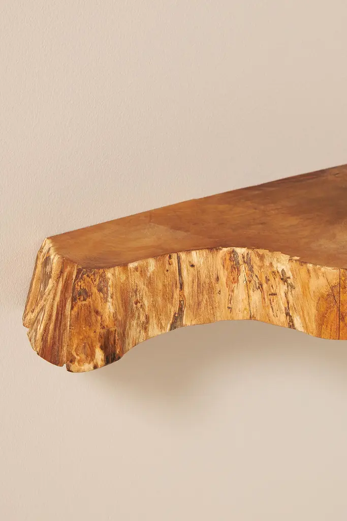 Showcasing the curves and natural grain of reclaimed teak wood, this shelf offers a nature-inspired accent to any wall.