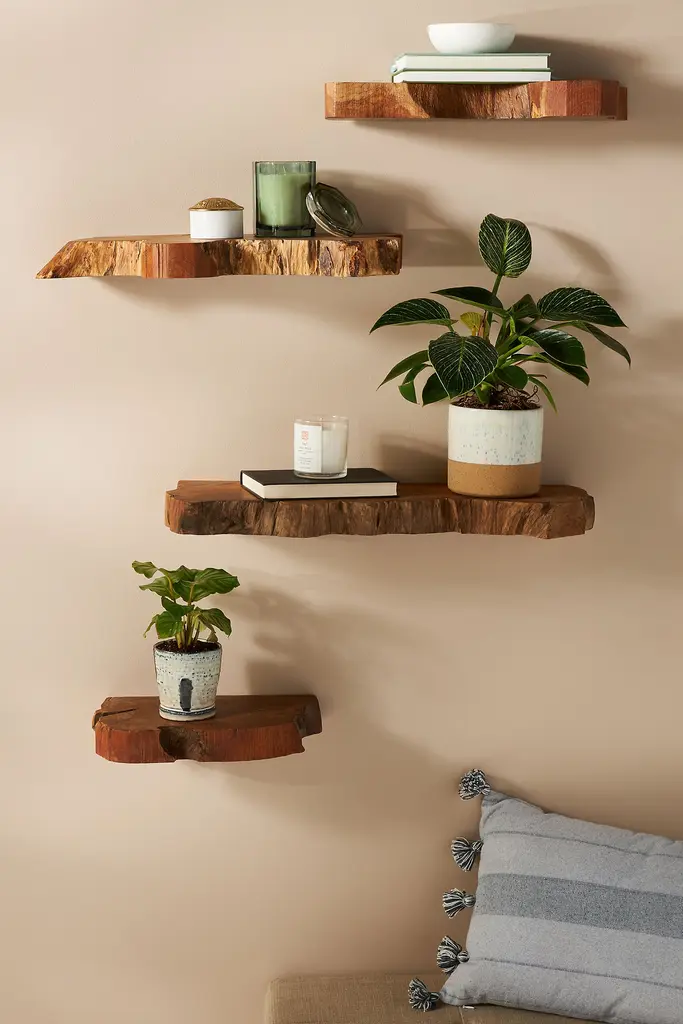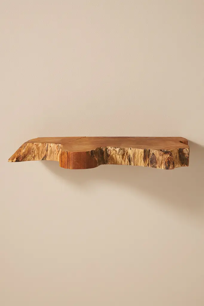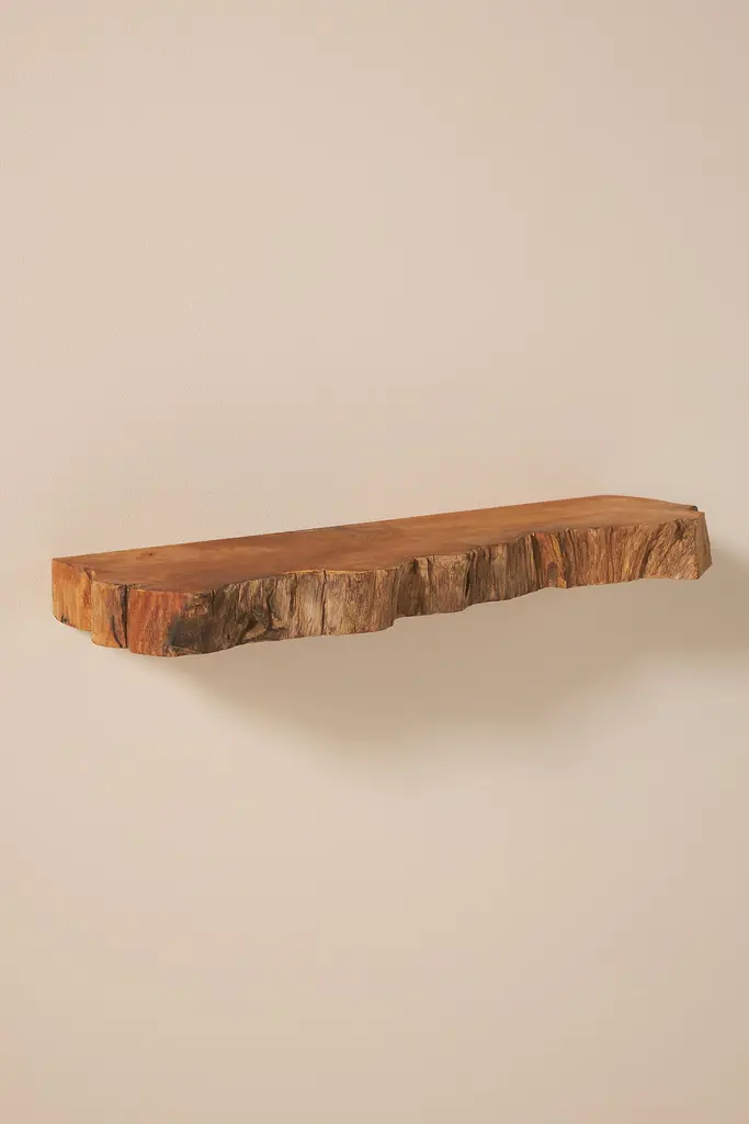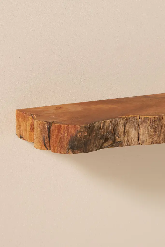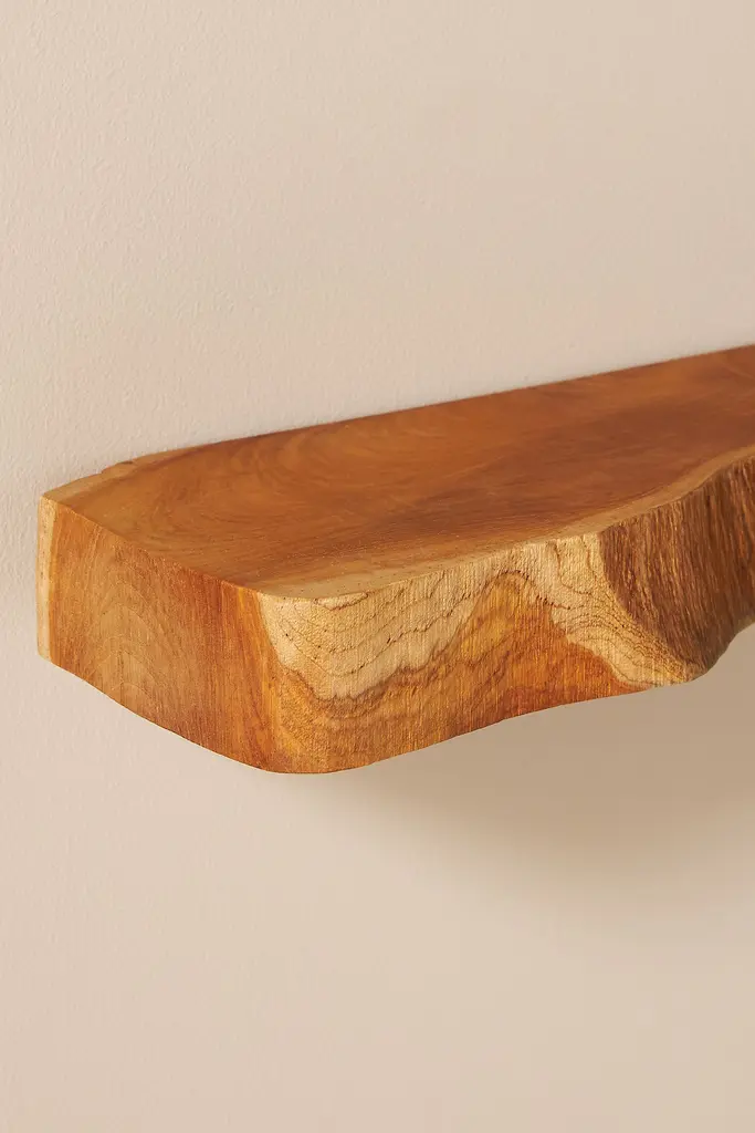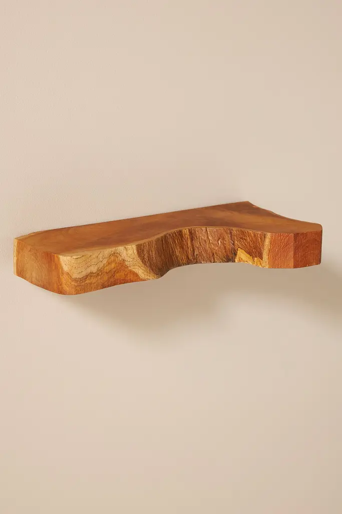 Showcasing the curves and natural grain of reclaimed teak wood, this shelf offers a nature-inspired accent to any wall.