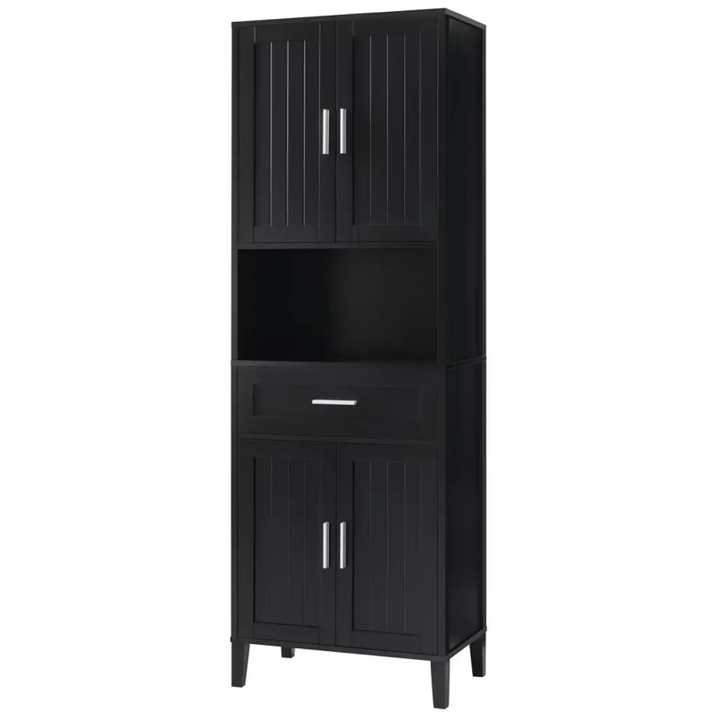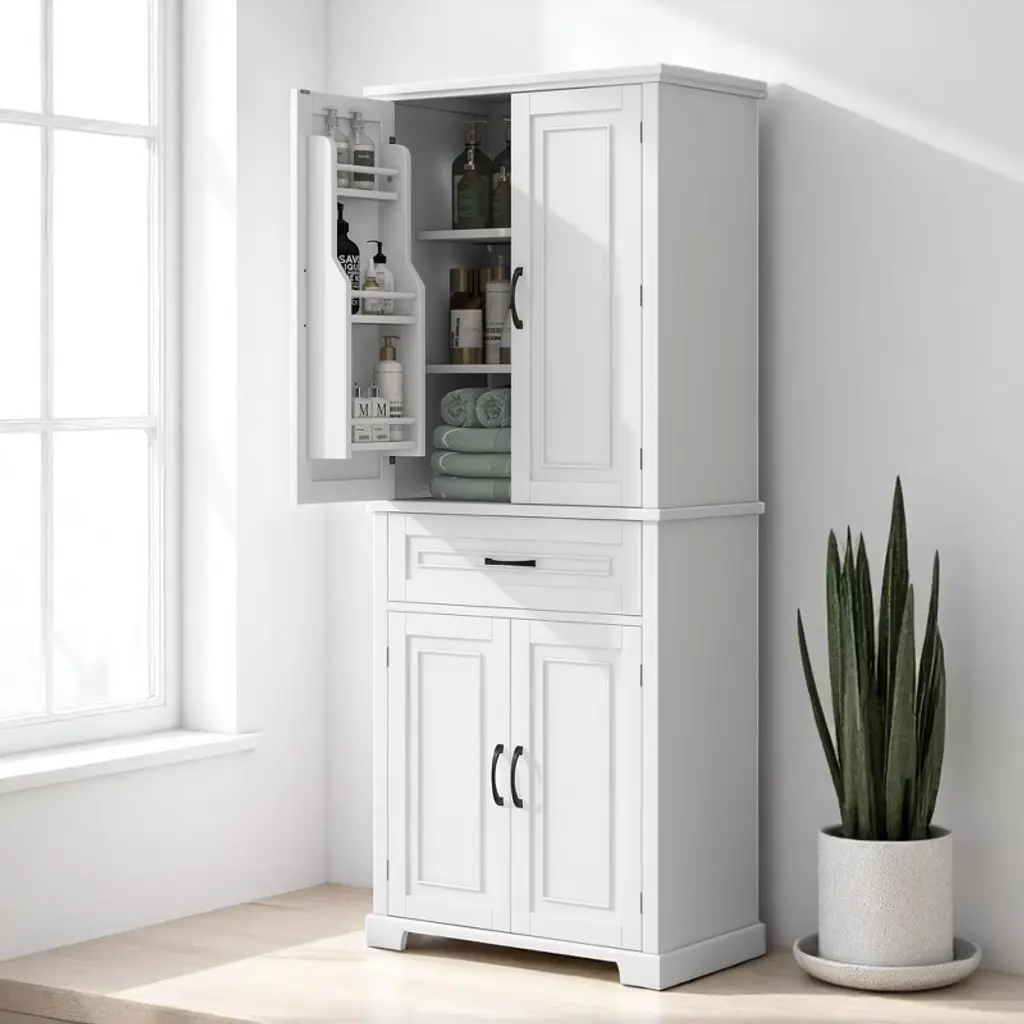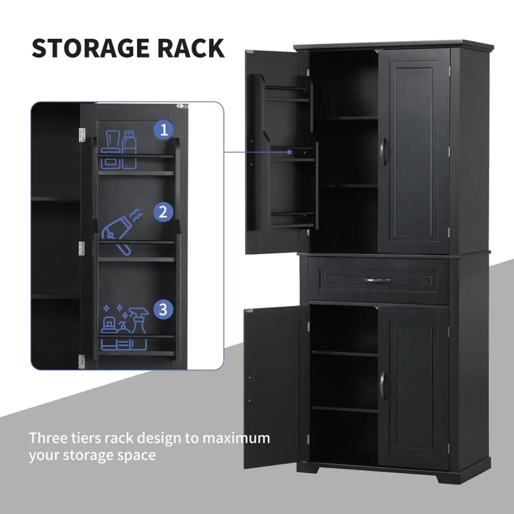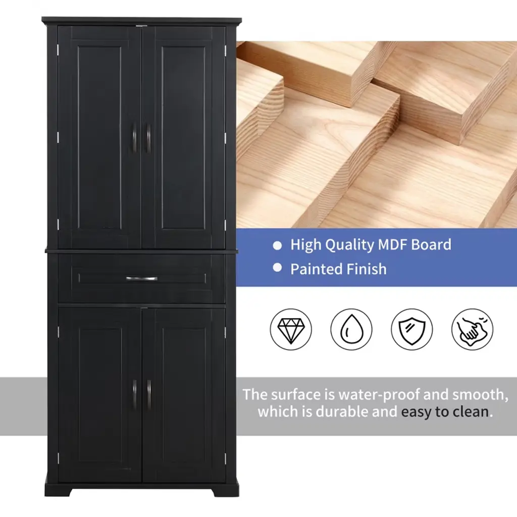 Product Overview:Maximize your vertical space with this tall black bathroom storage cabinet featuring a modern rectangular design and versatile functionality. Constructed from high-quality MDF board with a smooth painted finish, this cabinet offers durability, style, and easy cleaning. Its multi-tier structure includes doors, a drawer, and a storage rack—perfect for keeping your essentials organized and out of sight.Product Features:Durable Construction: Made of high-quality MDF board with a water-resistant painted finish that is easy to clean and built to last.Multiple Storage Options: Features an upper cabinet with three tiers behind doors, a middle drawer, a lower cabinet with an adjustable shelf, and three additional side rack tiers.Adjustable Shelf: The bottom shelf inside the lower cabinet can be adjusted to fit various item sizes, offering flexible storage solutions.Quality Hardware: Equipped with black metal handles and stainless steel hinges for smooth operation and added durability.Anti-Tipping Design: Comes with an anti-tipping device for added safety, allowing you to secure the cabinet to the wall and prevent accidental tipping.Easy to Assemble: Includes detailed instructions and hardware pack for a straightforward installation process.Specifications:Color: BlackMaterial: MDF board, painted finishShape: RectangleCapacity: 22 lbs per shelf; 22 lbs for drawerAdjustable Shelf: Yes (lower cabinet)Number of Drawers: 1Number of Doors: 4Assembly Required: YesPackage Includes: Cabinet, hardware, instruction manualCountry of Origin: VimDimensions: 29.9"" L x 15.7"" W x 72.2"" HSuitable Scenarios:Perfect as a bathroom cabinet for toiletries and towelsUse as a bookcase or office organizerIdeal for hallways, laundry rooms, and storage closetsNotes:Please follow the included instructions carefully during assembly.Use the anti-tip device to secure the cabinet for safe usage.For indoor use only.