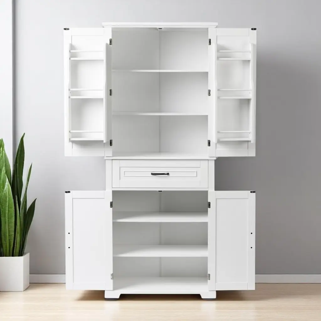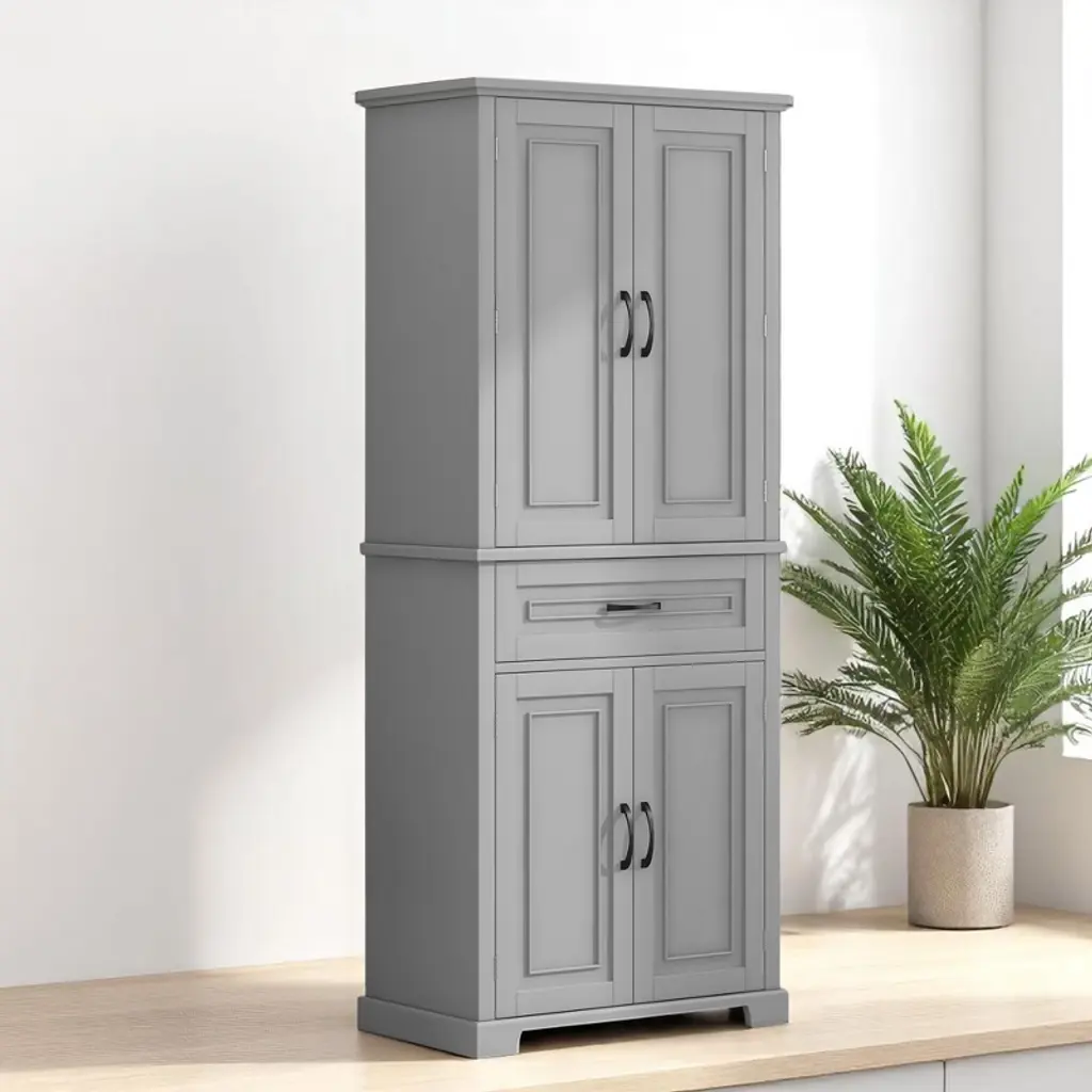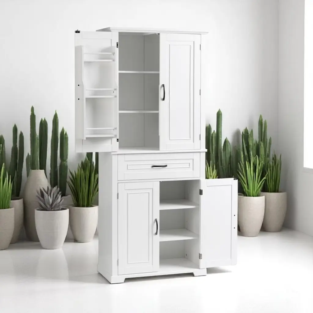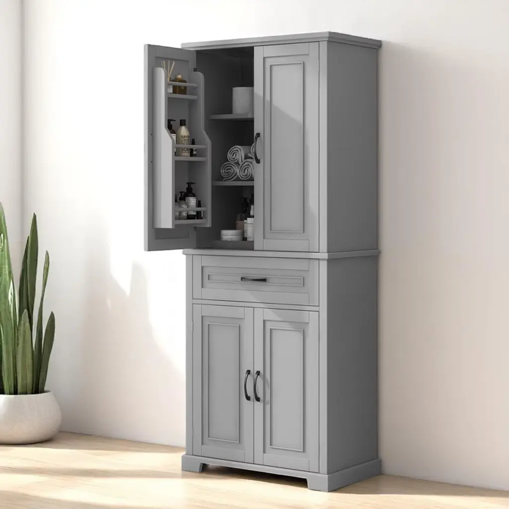 Product Overview:Maximize your vertical space with this tall black bathroom storage cabinet featuring a modern rectangular design and versatile functionality. Constructed from high-quality MDF board with a smooth painted finish, this cabinet offers durability, style, and easy cleaning. Its multi-tier structure includes doors, a drawer, and a storage rack—perfect for keeping your essentials organized and out of sight.Product Features:Durable Construction: Made of high-quality MDF board with a water-resistant painted finish that is easy to clean and built to last.Multiple Storage Options: Features an upper cabinet with three tiers behind doors, a middle drawer, a lower cabinet with an adjustable shelf, and three additional side rack tiers.Adjustable Shelf: The bottom shelf inside the lower cabinet can be adjusted to fit various item sizes, offering flexible storage solutions.Quality Hardware: Equipped with black metal handles and stainless steel hinges for smooth operation and added durability.Anti-Tipping Design: Comes with an anti-tipping device for added safety, allowing you to secure the cabinet to the wall and prevent accidental tipping.Easy to Assemble: Includes detailed instructions and hardware pack for a straightforward installation process.Specifications:Color: BlackMaterial: MDF board, painted finishShape: RectangleCapacity: 22 lbs per shelf; 22 lbs for drawerAdjustable Shelf: Yes (lower cabinet)Number of Drawers: 1Number of Doors: 4Assembly Required: YesPackage Includes: Cabinet, hardware, instruction manualCountry of Origin: VimDimensions: 29.9"" L x 15.7"" W x 72.2"" HSuitable Scenarios:Perfect as a bathroom cabinet for toiletries and towelsUse as a bookcase or office organizerIdeal for hallways, laundry rooms, and storage closetsNotes:Please follow the included instructions carefully during assembly.Use the anti-tip device to secure the cabinet for safe usage.For indoor use only.