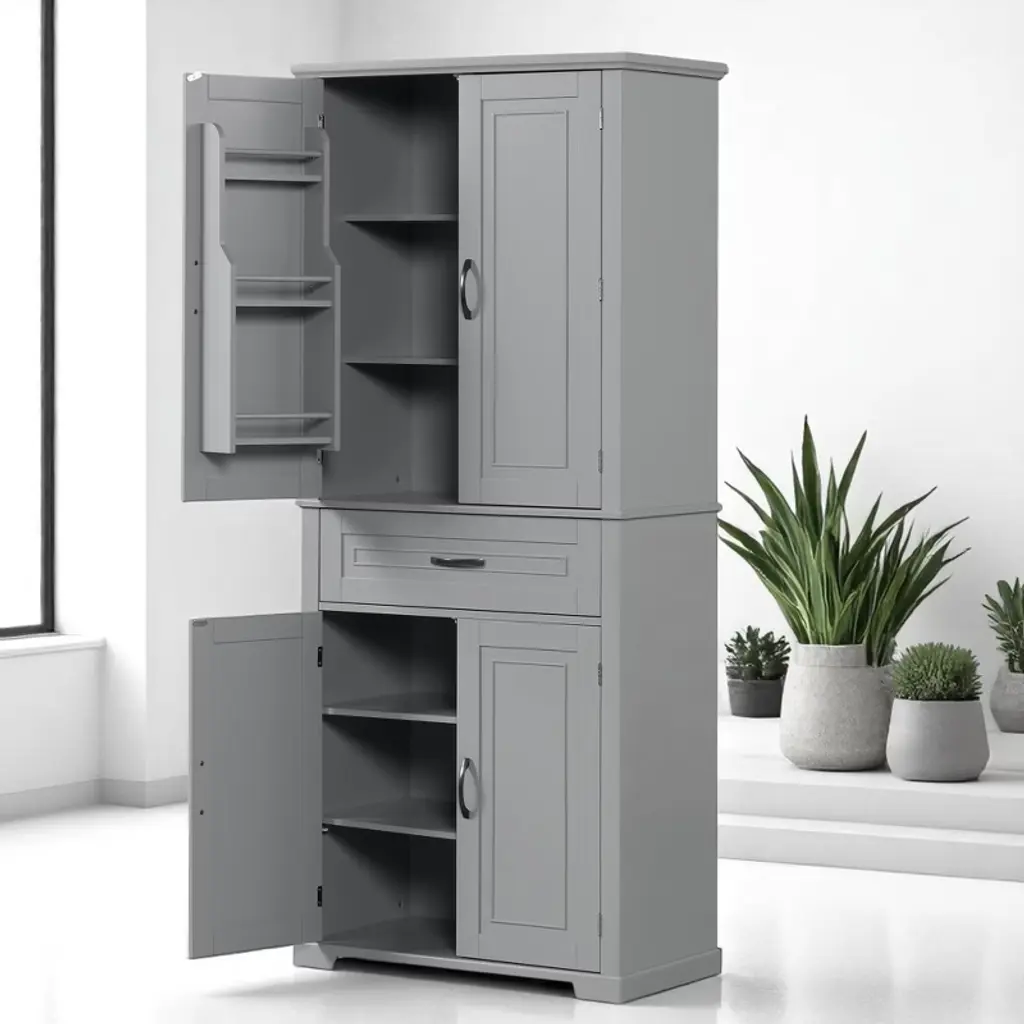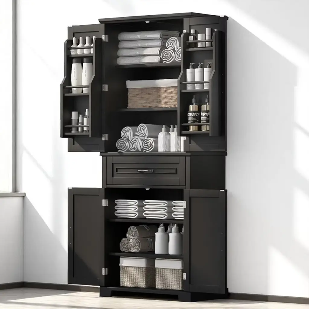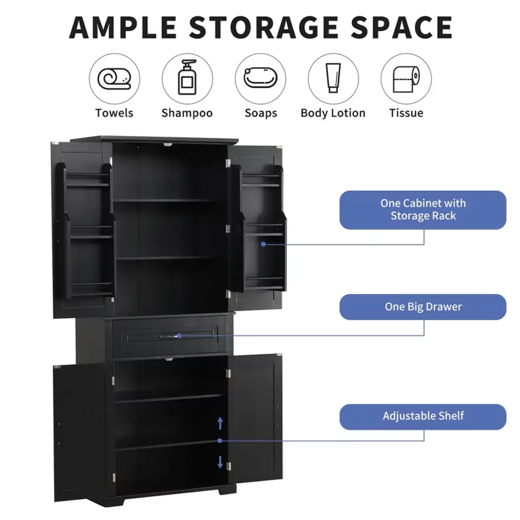 Product Overview:Maximize your vertical space with this tall black bathroom storage cabinet featuring a modern rectangular design and versatile functionality. Constructed from high-quality MDF board with a smooth painted finish, this cabinet offers durability, style, and easy cleaning. Its multi-tier structure includes doors, a drawer, and a storage rack—perfect for keeping your essentials organized and out of sight.Product Features:Durable Construction: Made of high-quality MDF board with a water-resistant painted finish that is easy to clean and built to last.Multiple Storage Options: Features an upper cabinet with three tiers behind doors, a middle drawer, a lower cabinet with an adjustable shelf, and three additional side rack tiers.Adjustable Shelf: The bottom shelf inside the lower cabinet can be adjusted to fit various item sizes, offering flexible storage solutions.Quality Hardware: Equipped with black metal handles and stainless steel hinges for smooth operation and added durability.Anti-Tipping Design: Comes with an anti-tipping device for added safety, allowing you to secure the cabinet to the wall and prevent accidental tipping.Easy to Assemble: Includes detailed instructions and hardware pack for a straightforward installation process.Specifications:Color: BlackMaterial: MDF board, painted finishShape: RectangleCapacity: 22 lbs per shelf; 22 lbs for drawerAdjustable Shelf: Yes (lower cabinet)Number of Drawers: 1Number of Doors: 4Assembly Required: YesPackage Includes: Cabinet, hardware, instruction manualCountry of Origin: VimDimensions: 29.9"" L x 15.7"" W x 72.2"" HSuitable Scenarios:Perfect as a bathroom cabinet for toiletries and towelsUse as a bookcase or office organizerIdeal for hallways, laundry rooms, and storage closetsNotes:Please follow the included instructions carefully during assembly.Use the anti-tip device to secure the cabinet for safe usage.For indoor use only.