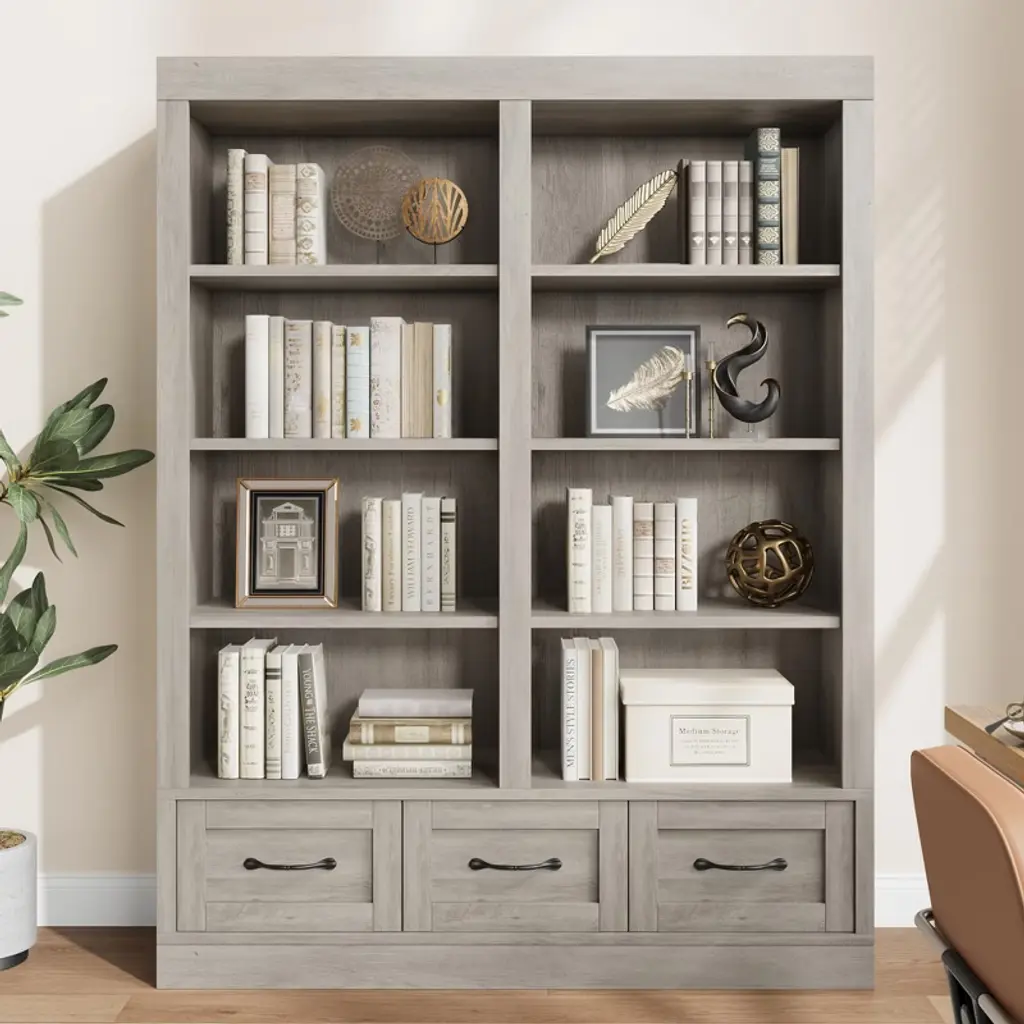 【8 Tier Double Wide Bookshelf】Overall dimensions: 11.8"D x 47.2"W x 64"H.The wooden bookcase is twice as long as standard models and comes with three drawers.. The large capacity of the bookcase can offer plenty of space for organizing books or other items and the open space is convenient for daily use【Sturdy and Stable】This farmhouse tall bookcase combines high-density MDF boards and a well-structured wood frame. The thickened bookshelves ensure stability and durability, allowing them to support heavy books and items without wobbling【Enough Storage Space】 3 drawers for more discreet items and documents. 8 double wide open shelves with baffles for decorative items or items that need to be picked up in time. Not only does the book shelf with drawers expand your storage space and keep your room tidy, but it also makes your life and work easier【Versatile】 This bookcase with drawers not only can be used as a file cabinet in the office but also can be used as a bookshelf in the study. The bookcase cabinet can also be placed in the living room for decorative items, in the kitchen for kitchenware and food. It can even be placed in the school library and classroom as a book corner【Easy Assembly】 The package comes with all the necessary installation tools, and the bookcase has been carefully designed by professional engineers, making the installation process simple and easy. All boards are labeled with serial numbers and come with detailed instructions with pictures to help you easily complete the assembly