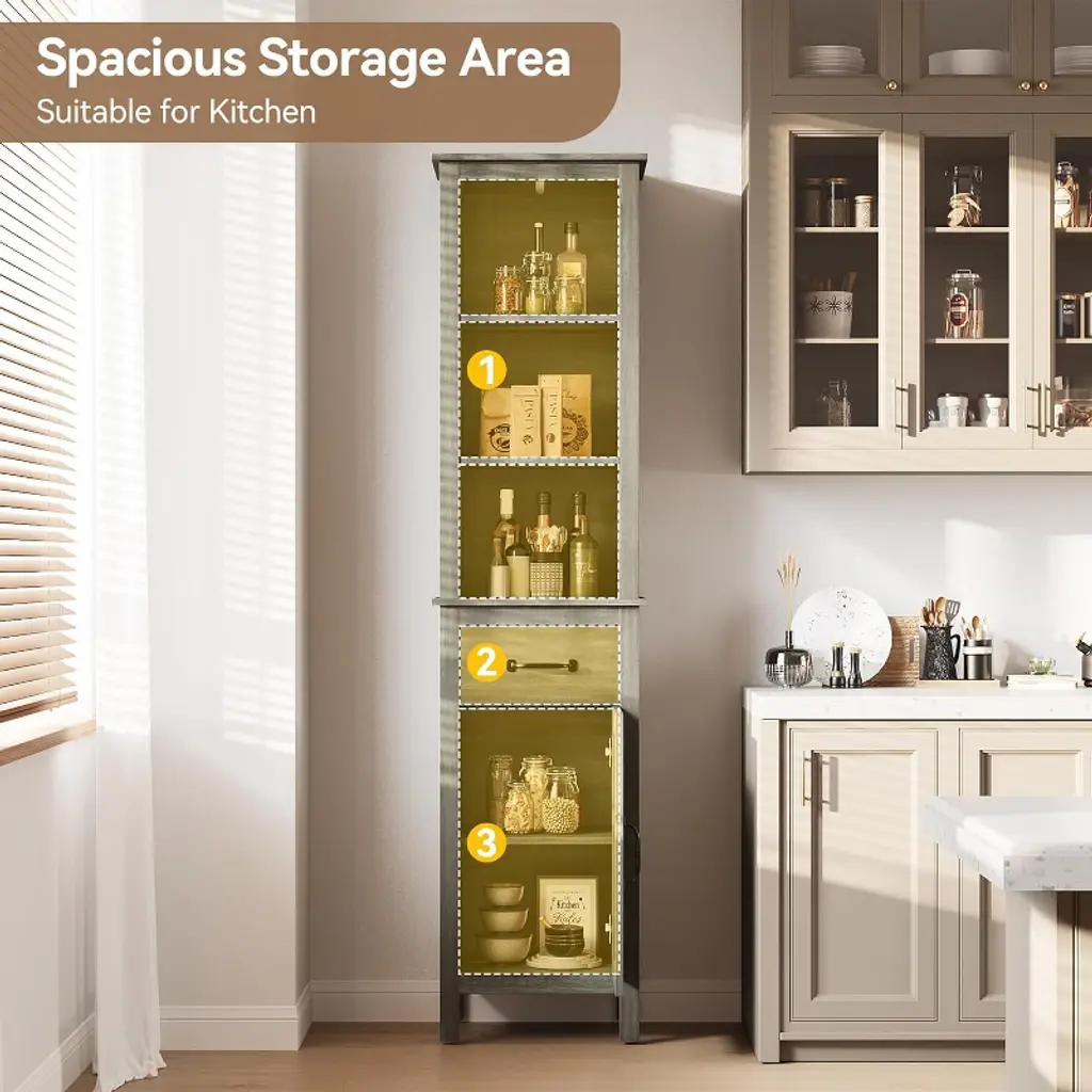 Tall Storage Cabinet - 62.9" Freestanding Linen Tower, Farmhouse Design with 5 Shelves & Drawer, Adjustable Shelf, Waterproof Material, for Bathroom, Living Room, Kitchen
