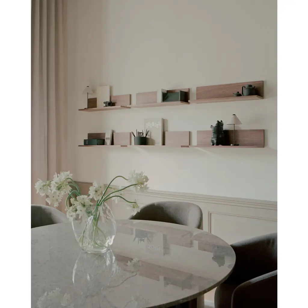 New Works’ Tana wall shelf is a practical wall-mounted open shelf designed with a softly minimalist touch. Crafted from wood veneer, it offers a stylish place to display a lamp, photographs, houseplants or decorative objects. The Tana collection reflects architect Rikke Rützou Arnved’s vision of simple, timeless design. Clean lines and handle-free fronts highlight the natural beauty of the wood, and the wall-mounted structure gives the shelves and tables in the series a light, floating appearance. Whether placed alone or in a group, Tana furniture brings an airy sense of harmony to any interior.