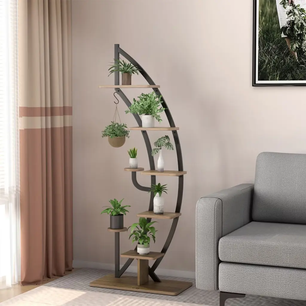 Display Your Potted Plants While Decorating Your Home! Our 6-tier metal flower shelf provides ample space to display your diverse plants and decorations, making your space tidy and clean. You can use it as a display shelf to show your books, collections, photo frames, or trophies in the entryway or living room. And it is designed with a curved shape like a half moon, which can stand out in your home decoration. More than that, it is supported by a heavy-duty powder-coated steel frame, which provides strong support and ensures a large loading capacity. And thanks to the anti-toppling device, there is no need to worry about tipping over and destroying your favorite plants.FeaturesThe 6-tier shelf provides enough space for displaying potted plants The ladder structure helps plants get enough sunlight for growth The top hook allows you to hang flower baskets or different ornamentsSpecifications:Color: Natural+Black Material: Particle Board, MDF Board, Steel Overall Dimensions: 23.5" x 12" x 61" (L x W x H) Weight Capacity of Each Shelf: 50 lbs Weight Capacity of the Top Hook: 11 lbs Net Weight: 33 lbs Package Includes: 2 x Metal Flower Shelf 1 x User's Manual