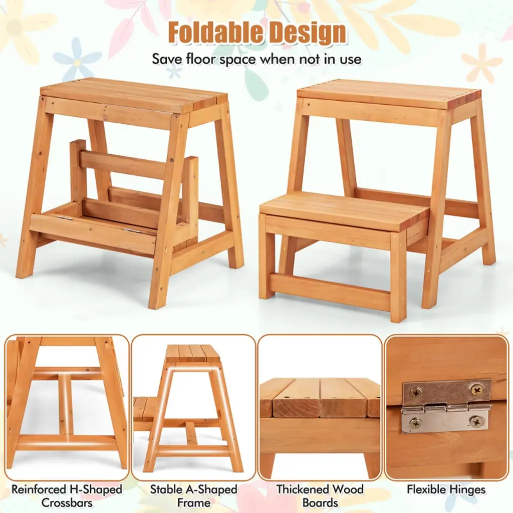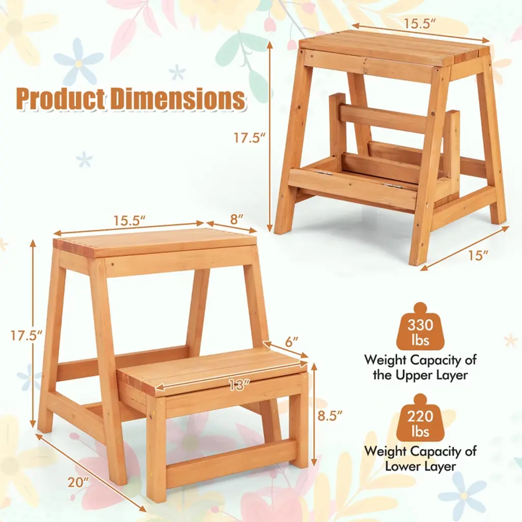 A Versatile & Reliable Solution for Various Household Tasks! Our 2-tier folding step stool can be a versatile and sturdy solution for plant enthusiasts. Crafted of 100% solid fir wood and coated with safe and healthy painting, it ensures a reliable and sturdy display platform for your lovely plants. The top tier can load up to 330 lbs and the bottom tier can load up to 220 lbs. Thanks to its strong loading capacity, this versatile 2-step ladder can be used as a flowerpot stand or wood stool. Whether you need to reach high shelves, clean windows, hang paintings, change light bulbs, or display potted plants, it could cater to different needs. And it can be easily folded, saving floor space when not in use.FeaturesCrafted of sturdy fir wood, natural and safe, not easy to deform Ensures strong loading capacity, upper layer: 330 lbs, lower layer: 220 lbs The wood is coated with waterproof painting, ensure long-term outdoor useSpecifications:Color: Natural Material: Fir Wood Overall Dimension of Step Stool: 20" x 15.5" x 17.5" (W x D x H) Folding Dimension: 15.5" x 15" x 17.5" (L x W x H) Weight Capacity of the Upper Layer: 330 lbs Weight Capacity of the Lower Layer: 220 lbs Net Weight: 7 lbs Package includes: 1 x 2-Tier Step Stool 1 x User's Guide