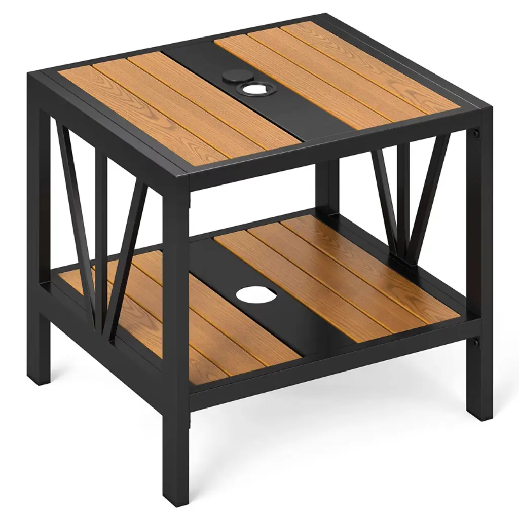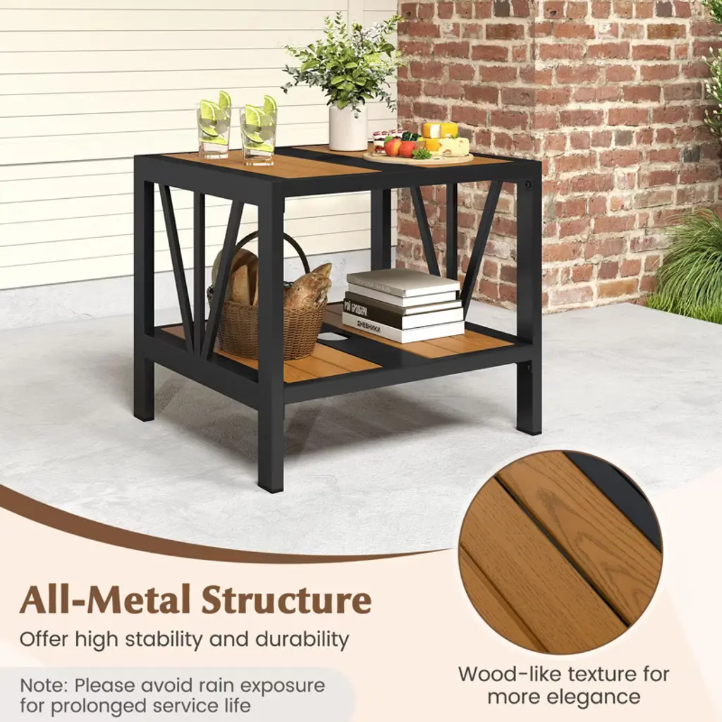 Improve your outdoor relaxing experience with this versatile 2-tier outdoor side table. Equipped with a convenient 1.57" umbrella hole and an additional fixing hole at the bottom, this end table functions as a useful umbrella stand. The 2-tier storage design keeps essentials like snacks, drinks, and magazines within easy reach. Moreover, the robust all-metal construction is designed for long-lasting use and strong support. The tabletop and shelf of the side table boasts wood-like texture for more elegance. Make this distinctive yet essential piece a focal point in your backyard, poolside, or patio for enhanced relaxation and aesthetics.FeaturesCompatible for a patio umbrella (not included) for more relaxation An umbrella base is required but not included Totally made of heavy-duty metal for high stabilitySpecifications:Color: Black, Natural Material: Metal Overall Dimensions: 20.5" x 18" x 18" (L x W x H) Net Weight: 40 lbs Weight Capacity of Tabletop: 110 lbs Weight Capacity of Storage Shelf: 55 lbs Package Includes: 2 x Patio Side Table 1 x Instruction