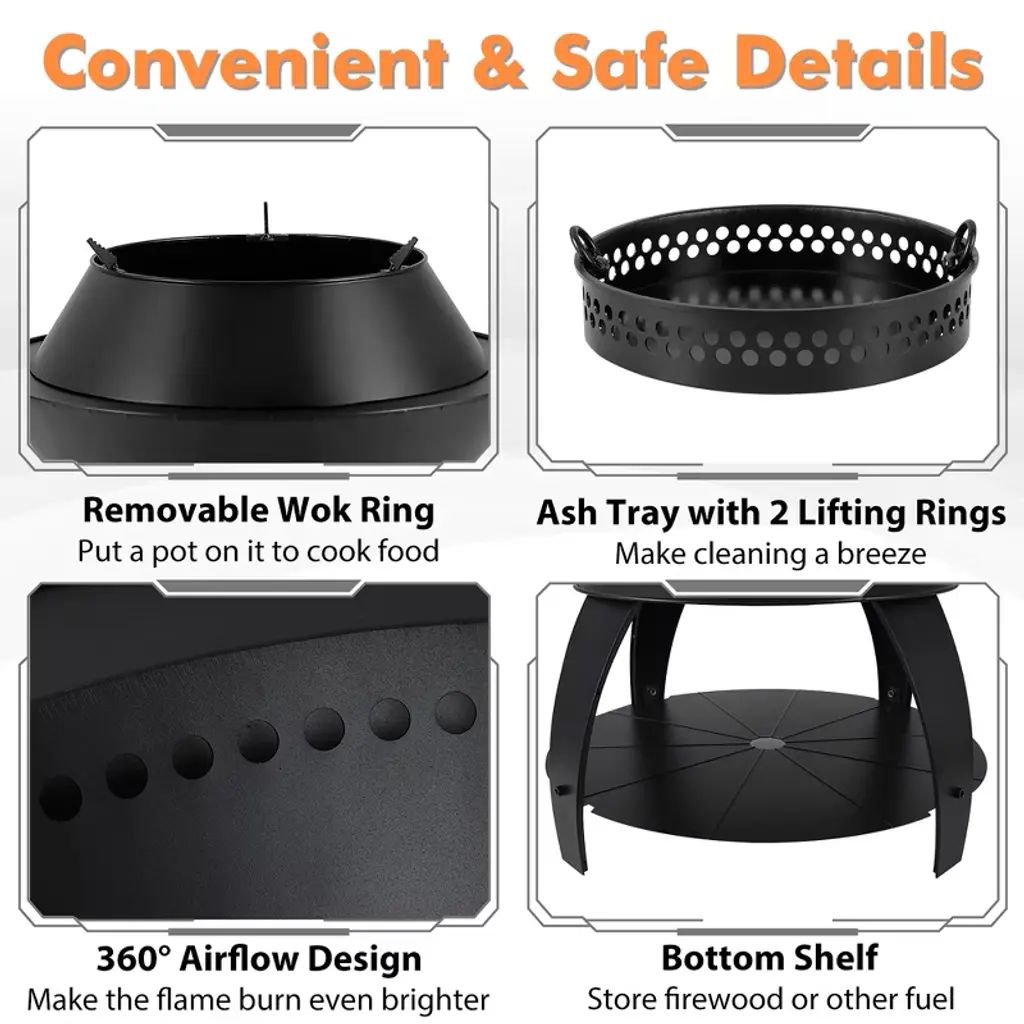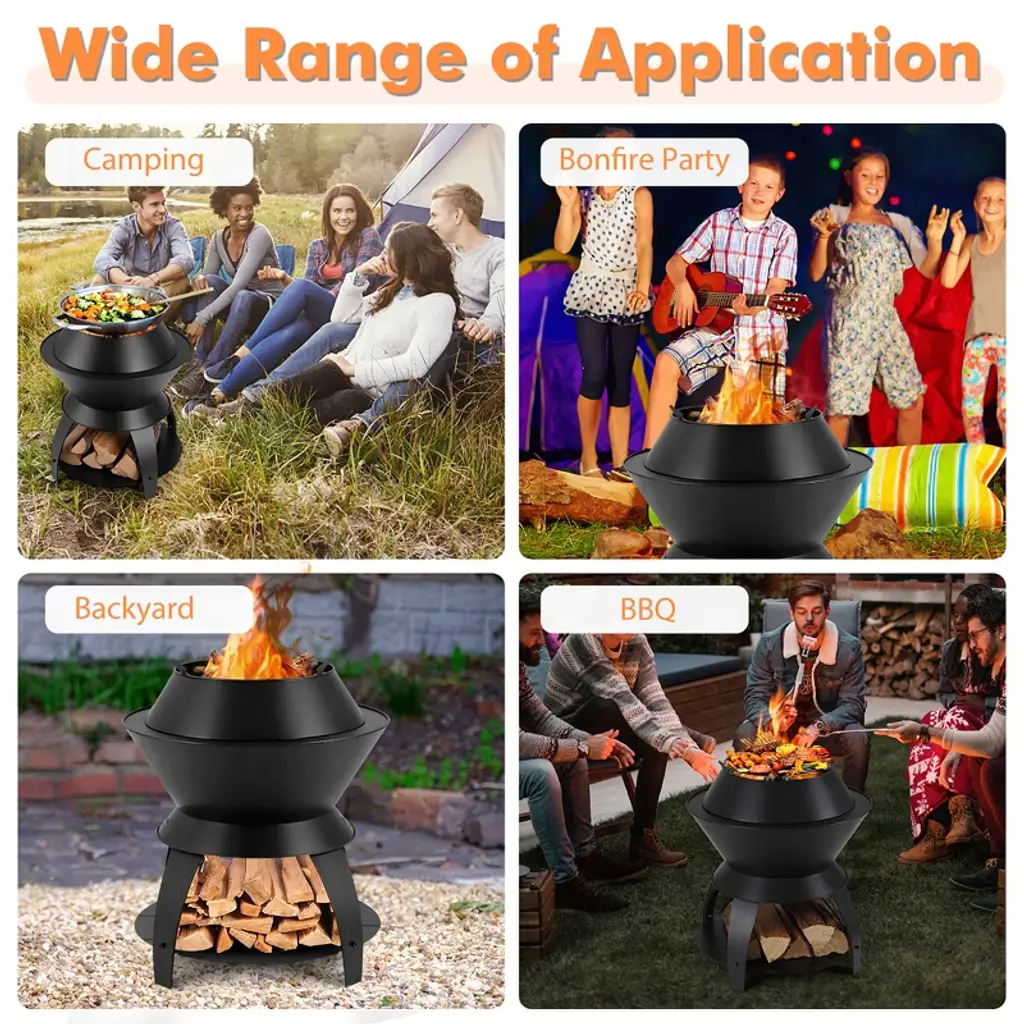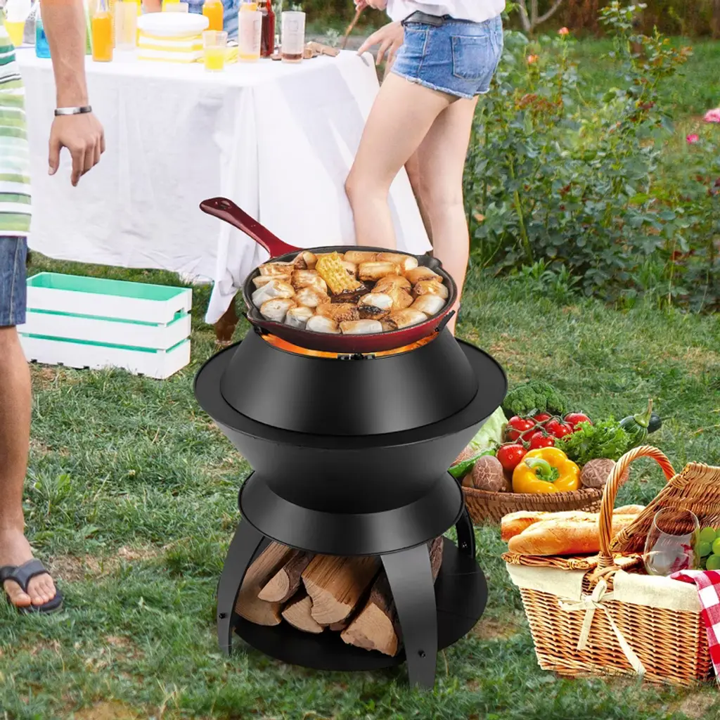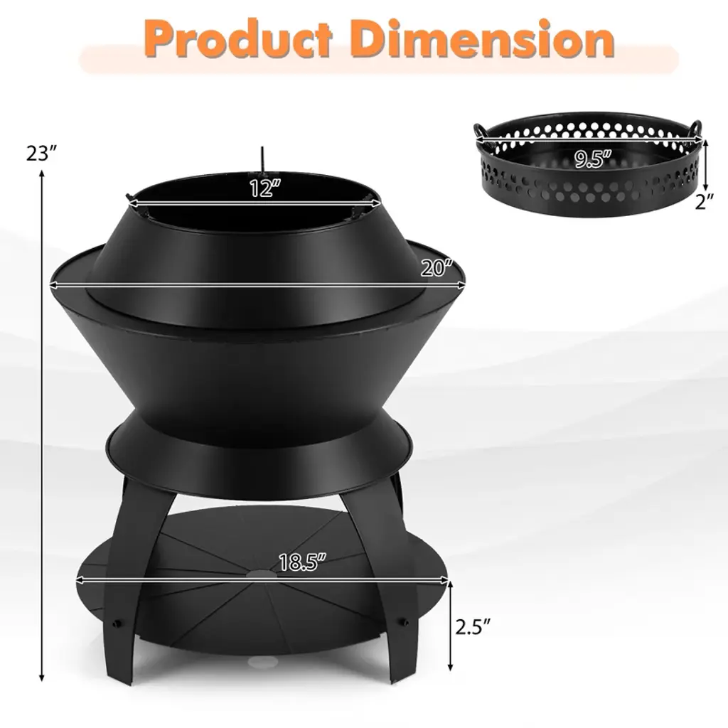 Discover the epitome of outdoor enjoyment with this cutting-edge fire pit, expertly crafted for a smokeless and efficient burn. The innovative design promotes dual-stage combustion, ensuring you get the most warmth from minimal wood use. Tailored for versatility, this 3-in-1 fire pit serves as a camp stove with its top pot holder, a cozy campfire, or a BBQ grill for delightful gatherings. Constructed of robust Zn-Fe alloy and supported by sturdy legs, the fire pit is built to endure long burns. You're spoilt for choice with fuel options, including pellets, wood and charcoal. Also, cleanup is a breeze with its handy ash tray. Elevate your outdoor adventures with the convenience and durability of this unparalleled fire pit.FeaturesEfficient air-circulation leads to first burn and second burn with less smoke Top pot holder can be detached for more usages Perfect as a camp stove, camp fire pit or BBQ grill (grill not included)Specifications:Color: Black Material: Zn-Fe Alloy Overall Dimension: 20" x 23" (Dia x H) Dimension of Ash Tray: 9.5" x 2" (Dia x H) Net Weight: 17.5 lbs Package Includes: 1 x Patio Fire Pit 1 x Instruction