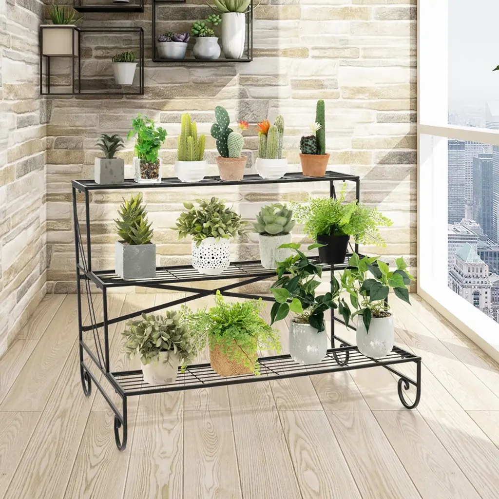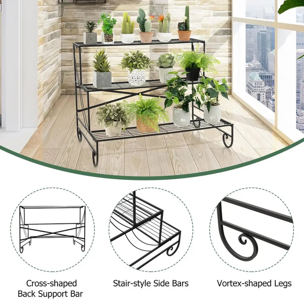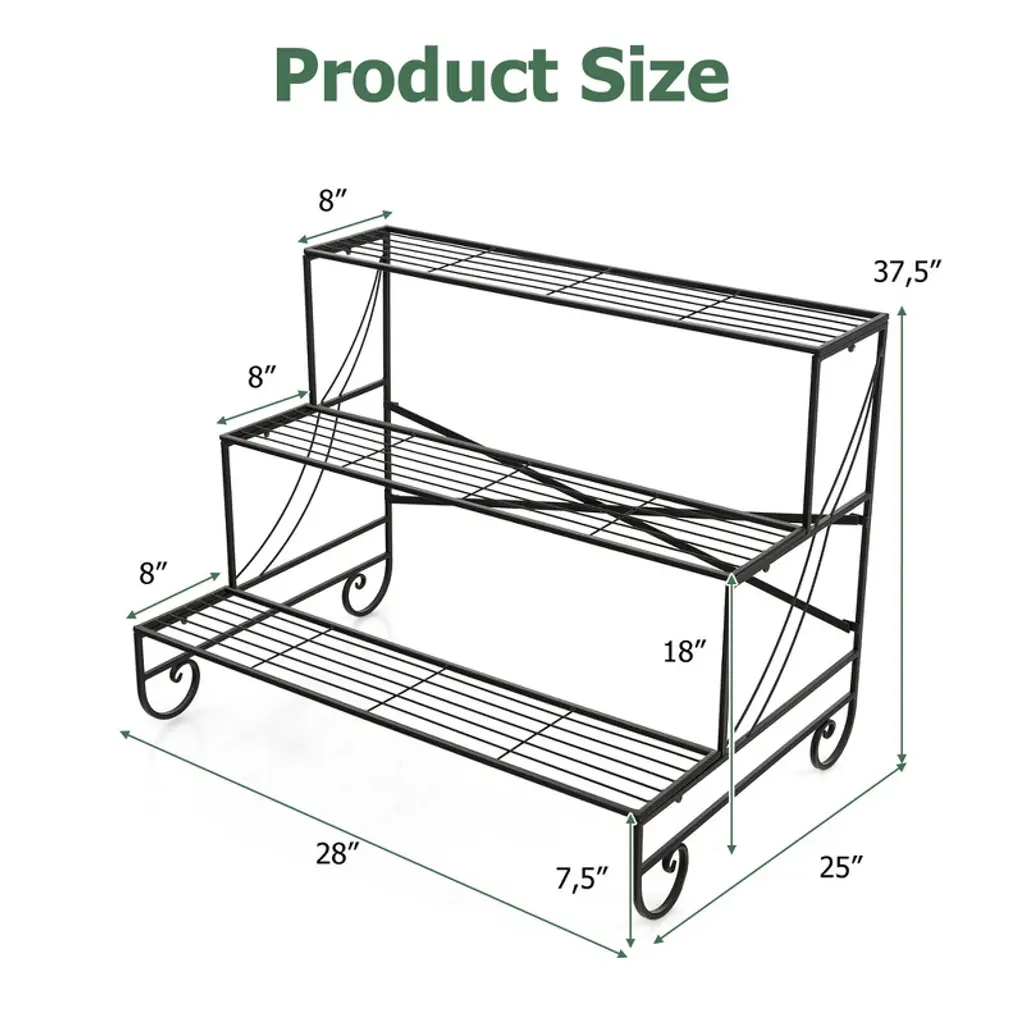 Create a fancy and neat garden with the metal plant stand! This utility metal plant stand features 3 layers of mesh to display your beloved plants and bring a touch of greenery to your garden and interior living space. In addition, the 3 shelves form a ladder shape to ensure that the plants on each level are bathed in sunlight. What's more, the grid design of the shelf helps to drain excess water, allowing the plants to grow healthily. Powder-coated heavy metal makes this three-layer plant stand sturdy and long-lasting. What's more, the combination of classic all-black frame and elegant vortex legs makes this flower stand very decorative to complement your garden, balcony, corridor.FeaturesStrong metal frame is stable and not easily deformed Reinforced x-shape back bar adds overall stability Anti-rust finish makes the plant stand support for long useSpecifications:Color: Black Material: Metal Overall Dimension: 28"x 25"x 37.5"(W x D x H) Each Shelf Size: 28"x 8" (W x D) Net Weight: 12 lbs Maximum Weight Capacity(Each layer) : 33 lbs Package Includes: 1 x 3 Tier Plant Stand 1 x Instruction