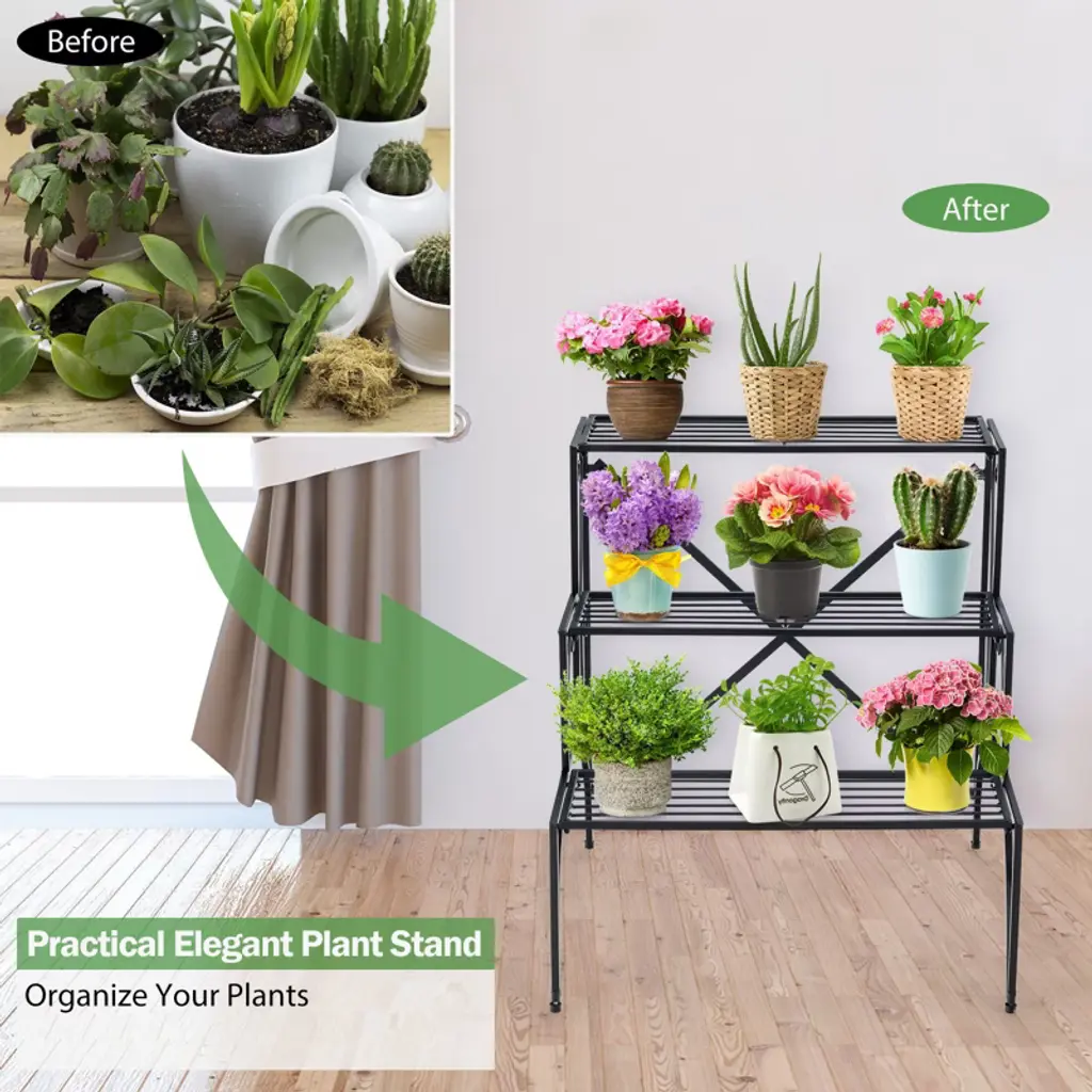 This is one of our plant racks to sort your plants out of the clutter. This plant rack has 3 layers with large capacity design, each layer can hold 22lbs of weight, can hold different plants, of course, but also garden tools, water bottles, photo albums, decorations, etc. The vertical design allows the plants to receive more sunlight. Made of iron, rectangular design, stable structure, waterproof and easy to clean. Adjustable floor pads can accommodate uneven floors while protecting your floor. The simple design of this shelf makes it suitable for a family in a variety of environments, terraces, bedrooms and gardens are all good places to place.Features3 layer plant stand, provide more storage spaceThe vertical design provides more sunlight to the plantsMade from iron, the structure is stableAdjustable floor pads can both accommodate uneven floors and protect your floorClean up your plants in your houseBesides potted plants, you can also put tools, water bottles, photo albums and decorationsPerfect for balconies, gardens, coffee shops and bedroomsSpecifications: Color: Black Material: Iron Product Dimension: 24" x 25" x 27"(W x D x H) Weight Capacity of Each Shelf: 22 lbs Net Weight: 11 lbs Package includes: 1 x 3-tier Metal Plant Stand 1 x User's Manual