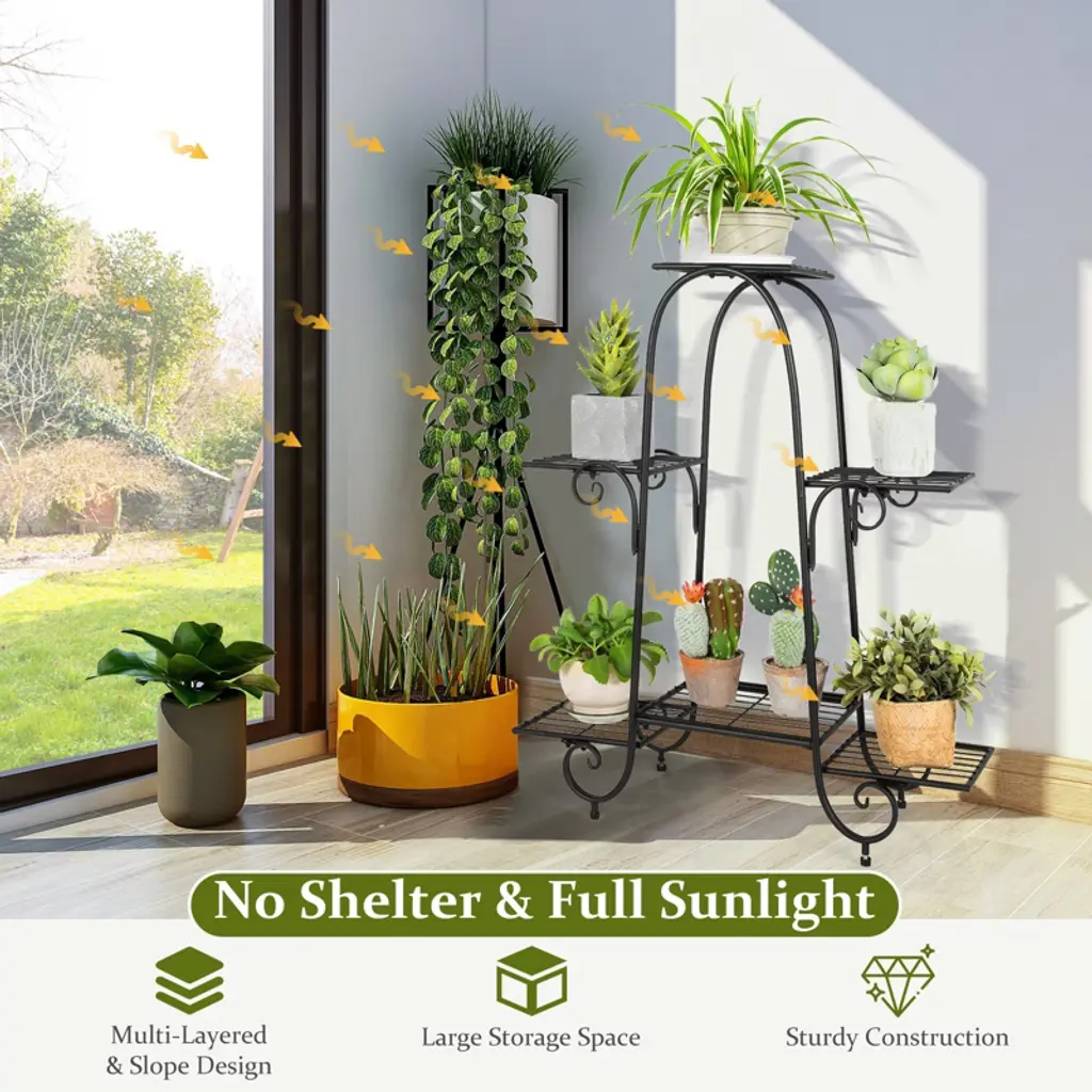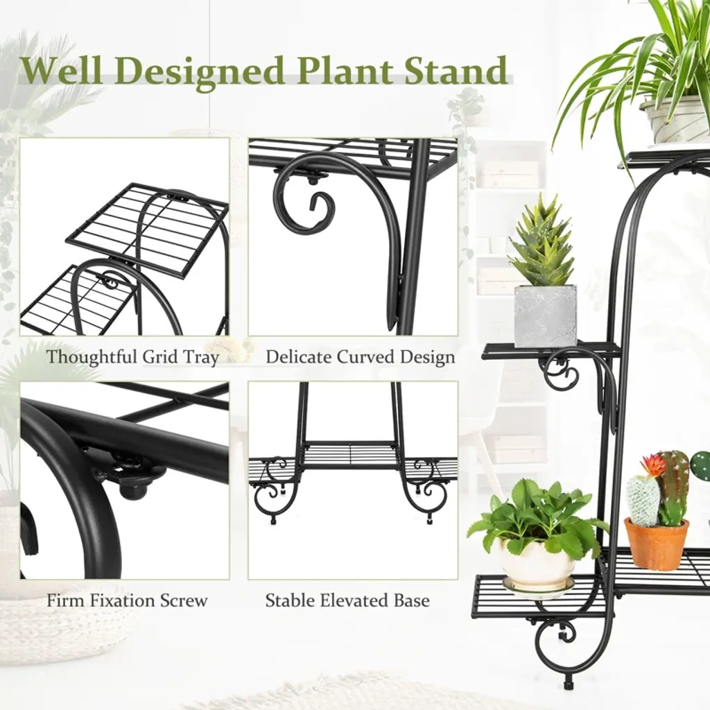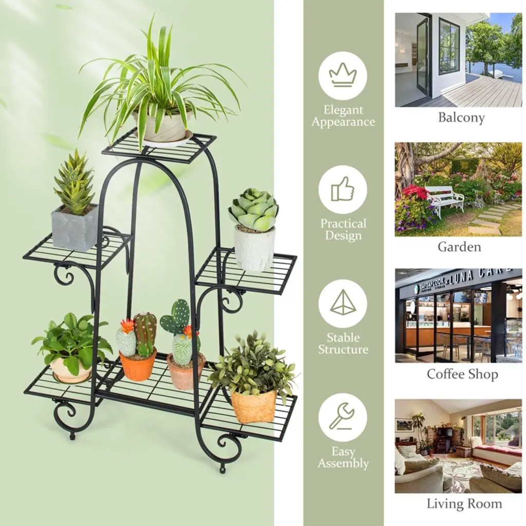 This is a multi-layer plant stand, in order to let the plants more exposed to the sun, this flower rack is your good choice. High quality flower stands made of powder-coated steel are stable in structure and each can bear 22lbs of weight. Protective and adjustable foot pads at the bottom allow the pergola to accommodate uneven floors and protect your floor. Besides regard as flower rack besides, you also can use store other article, photograph frame, adornment, receive box is right choice. The simple shape of this flower rack will make your life better for your garden, patio, deck and living room.FeaturesClean up your plants in your house6 tiers Plant Stands, provide more storage spaceThe structure is stable and each floor can withstand 22lbsProtective and adjustable footpads can be adapted to uneven groundConstructed of powder-coated metal tubes, sturdy, rust-resistantPerfect for balconies, gardens, coffee shops and bedroomsSimple installationSpecifications: Color: Black Materials: Iron Product Dimensions: 30" x 10.5" x 34" (W x D x H) Net Weight: 6.5lbs Size of Square Tray: 9" x 9" ( L x W ) Maximum Weight of Each Tray: 22 lbs Package includes: 1x 6-Pot Metal Plant Stand 1x User's Manual
