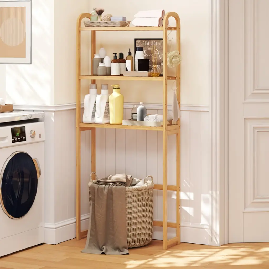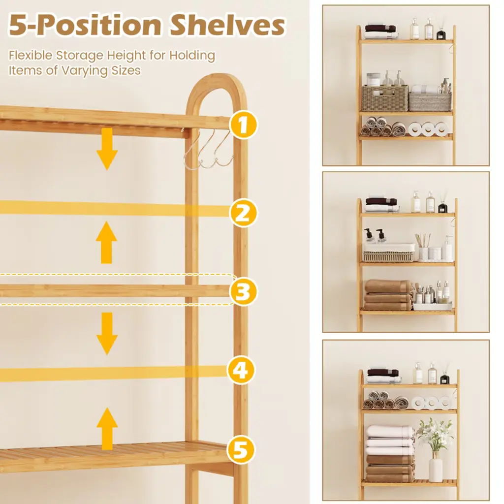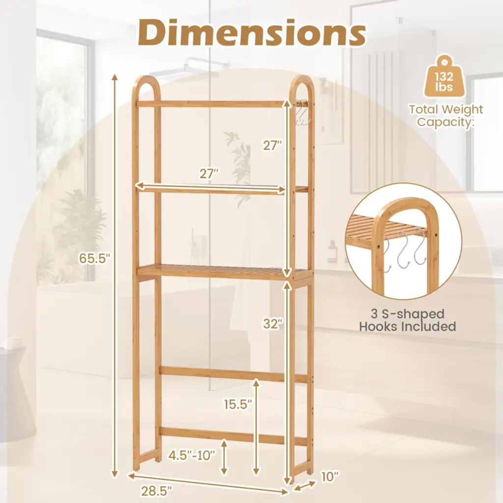 Transform your bathroom with the bamboo over-the-toilet storage shelf, meticulously designed to blend functionality with style. Crafted from natural bamboo, it is robust and enhances your space with its timeless elegance. The organizer rack offers a 3-tier open shelving system, and each shelf can be adjusted to 5 different heights, allowing you to neatly store various items and easily access them. For added practicality, it includes 3 movable hooks, perfect for hanging things from robes to washcloths. The flexible design accommodates bathroom layouts, with adjustable shelving that fits seamlessly around water pipes or other fixtures.Features3-tier open shelving maximizes vertical space 5 adjustable shelf positions fit items of different sizes 3 adjustable positions for water pipe accommodationSpecifications:Color: Natural Material: Bamboo Overall Dimensions: 28.5" x 10" x 65.5" (W x D x H) Bottom Bar Height: 4.5"-10" Total Weight Capacity: 132 lbs Net Weight: 13 lbs Package includes: 1 x Over the Toilet Storage Shelf 3 x Hooks 1 x User Guide