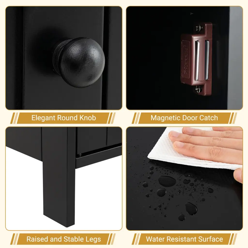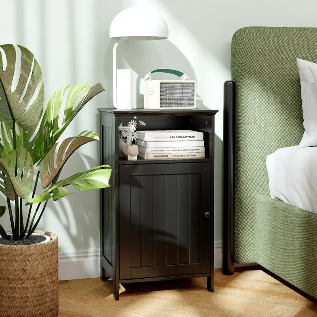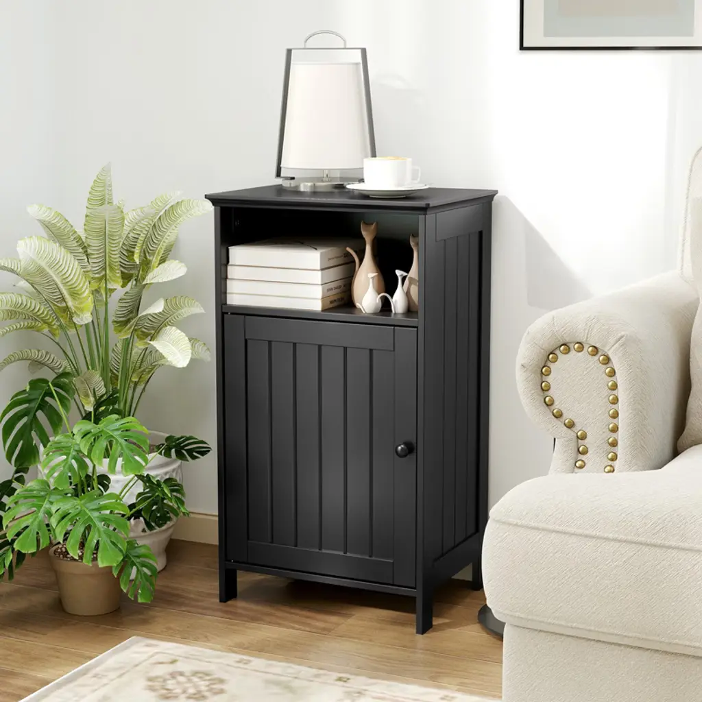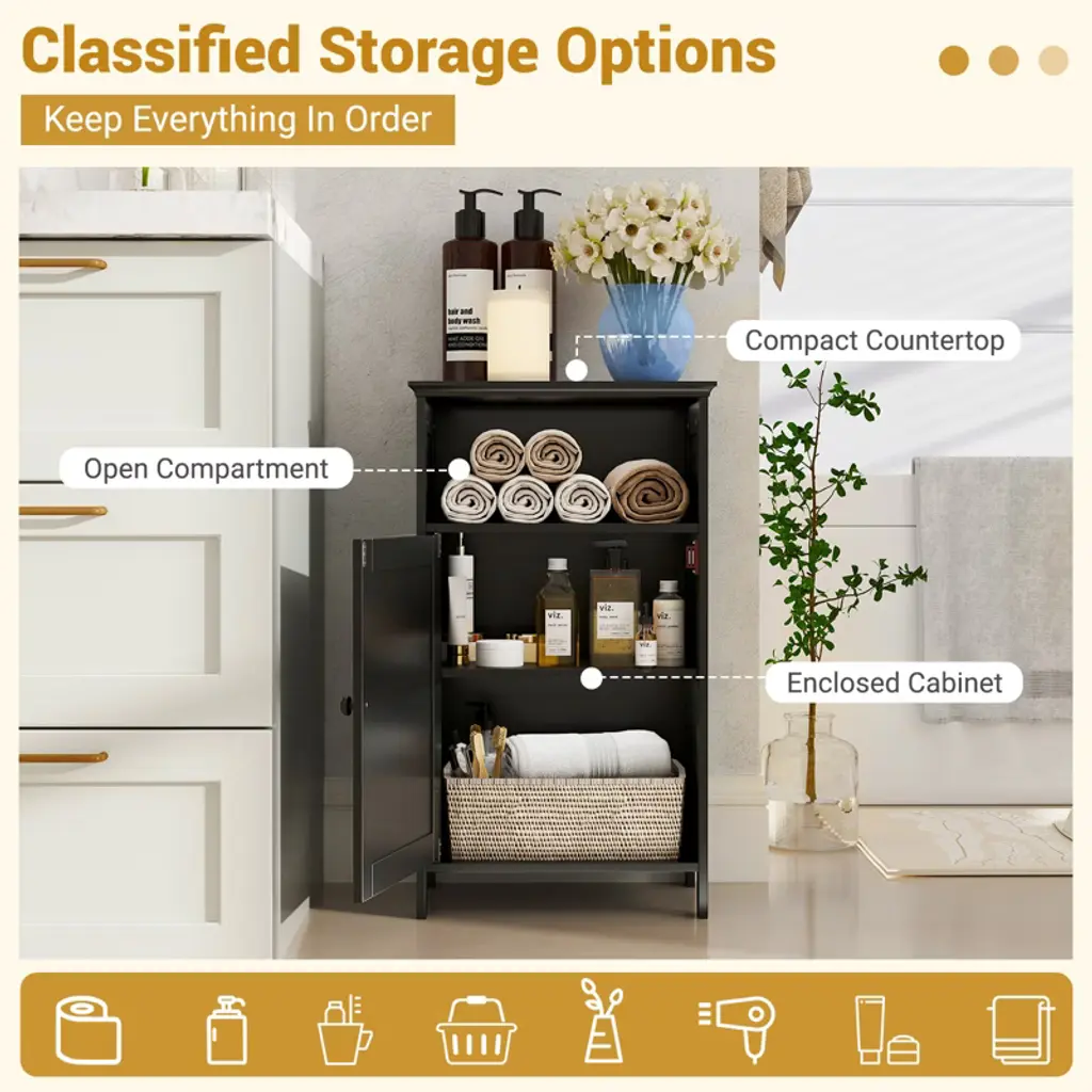 Keep everything in order with this single door floor cabinet! The selected materials ensure the durability and sturdiness. Besides, the open shelf holds those often-used items for easy access while the enclosed cabinet keeps things for privacy. Additionally, you are able to remove or adjust the inner shelf according to different heights of objects. Safety is paramount! Therefore, the narrow bathroom storage organizer is equipped with an anti-toppling device for firm attachment to the wall. The exquisite knob allows you to open or close the door easier. Furthermore, the vertical storage design enables this side storage cabinet to fit well in the corner.FeaturesOpen and closed storage areas for different storage choices 3-level adjustable shelf for objects of varying heights Anti-toppling device for safety and steadinessSpecifications:Color: Black Material: P2 MDF Overall Dimension: 16" x 12" x 27.5" (W x D x H) Net Weight: 15.5 lbs Weight Capacity of Top Panel: 44 lbs Weight Capacity of Each Shelf: 22 lbs Package Includes: 1 x Floor Cabinet 1 x Instruction