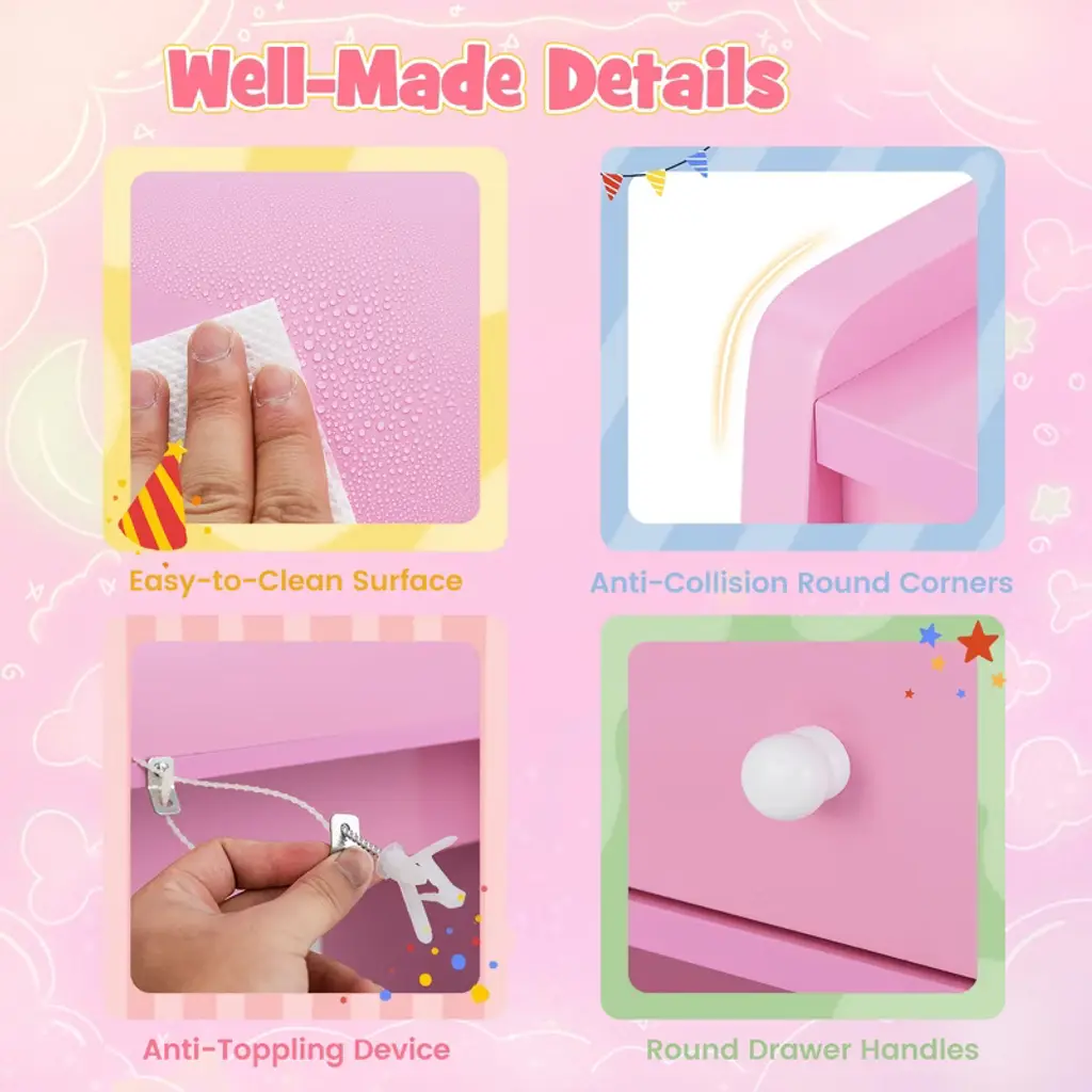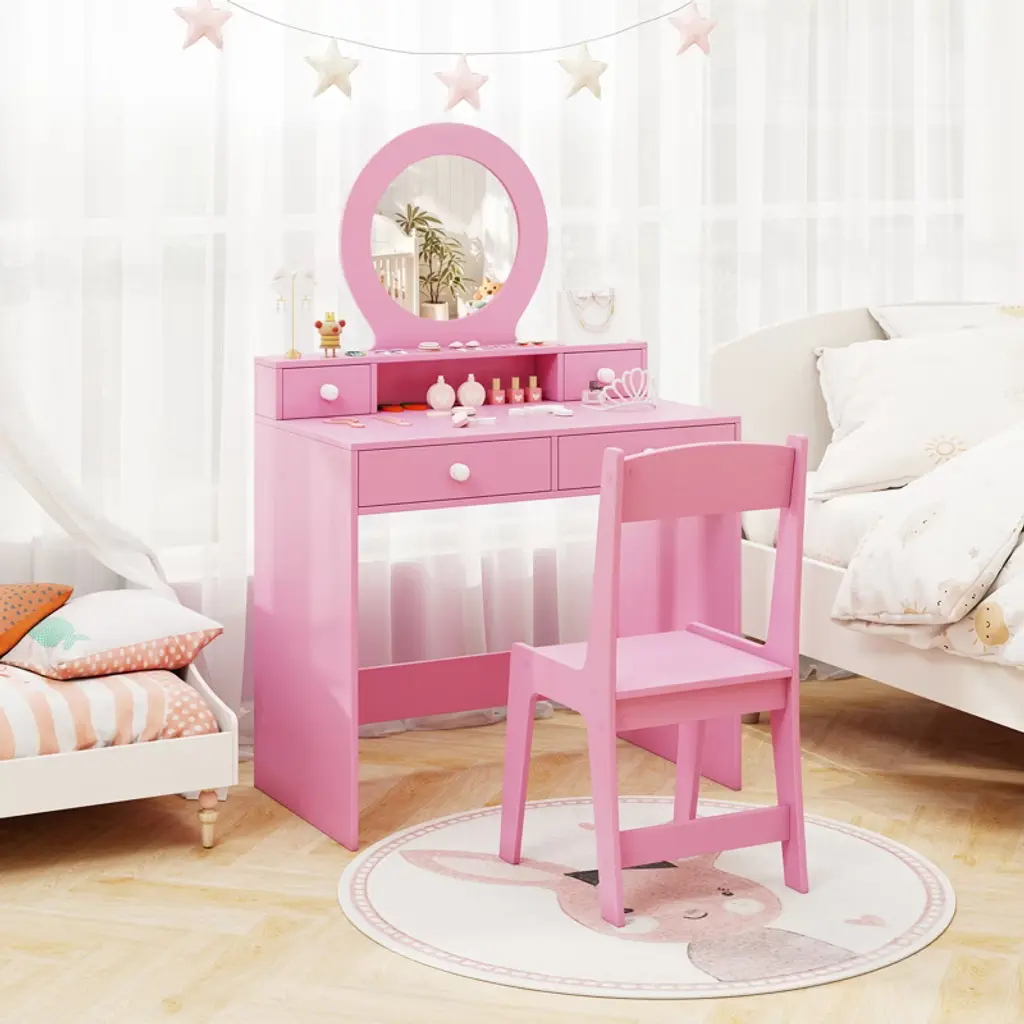 Elevate your child's playtime with this kids dressing table. With child-safe features like a shatterproof acrylic mirror and rounded corners, safety is ensured. The princess vanity set comes with ample storage including shelf and drawers for organization. Stability is a priority with an anti-toppling device. This versatile desk and chair set makes a perfect gift for any occasion, providing a safe and enjoyable space for your child to dress up, read, write, draw, and more.FeaturesAmple storage space with an open shelf and drawers Enhanced safety with shatterproof acrylic mirror Can be attached to the wall with included anti-toppling device Avoids injuries with anti-collision round cornersSpecifications:Color: White / Pink Material: MDF, Acrylic Mirror Table Dimension: 27.5" x 15.5" x 43.5" (L x W x H) Chair Dimension: 14" x 12" x 25.5" (L x W x H) Seat Dimension: 11" x 11" x 12.5" (L x W x H) Mirror Diameter: 11" Tabletop Height: 24" Weight Capacity of Tabletop: 110 lbs Weight Capacity of Chair: 165 lbs Suitable Age: 3, years old Net Weight: 35 lbs Package includes: 1 x Vanity Table 1 x Chair 1 x User Guide