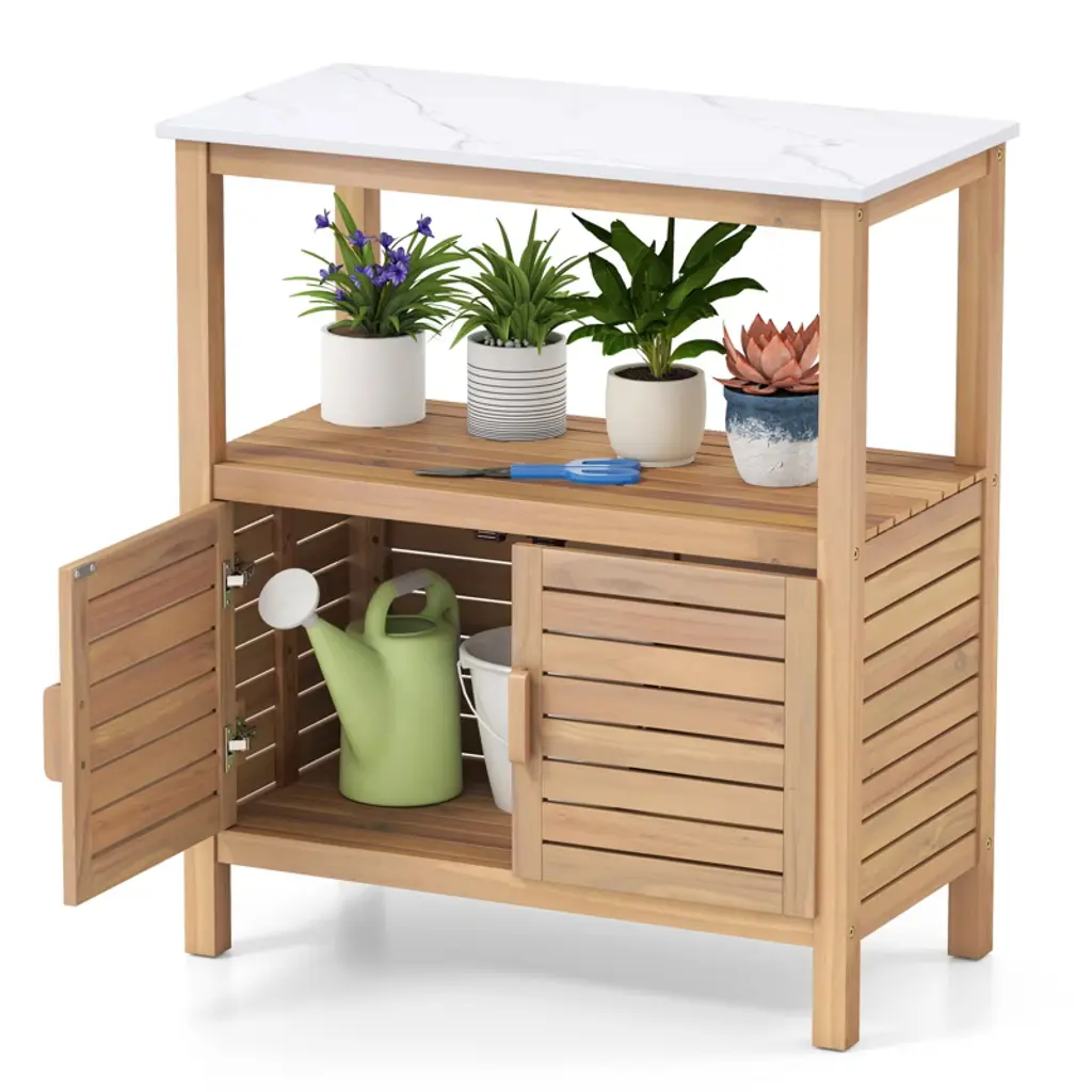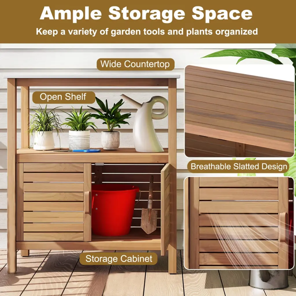 Upgrade gardening experience with this wooden potting bench! Crafted from acacia wood, this work bench not only boasts reliable construction but also adds a touch of rustic charm to your outdoor space. The garden potting bench features an open shelf and a louvered cabinet, providing plenty of space to store soil, pots, and gardening tools, helping you keep your workspace organized. No need to bend over or squat! The ergonomic height of the bench makes it easy to manage plants as well. Set up this potting bench in your favorite garden spot and enjoy countless hours tending to your plants in comfort and style.FeaturesSelected acacia wood combines high strength and long service life Wide countertop and open shelf at ideal height for convenient potting Storage cabinet to keep a variety of garden tools and plants organizedSpecifications:Color: Natural Materials: Acacia Wood, Resin Product Size: 31.5" x 16" x 35.5" (W x D x H) Dimensions of Shelf: 31" x 15" x 12.5" (L x W x H) Interior Size of Cabinet: 30" x 14.5" x 14" (L x W x H) Weight Capacity of Countertop: 155 lbs Weight Capacity of Shelf: 55 lbs Net Weight: 46 lbs Package Includes: 1 x Garden Potting Bench 1 x User Guide