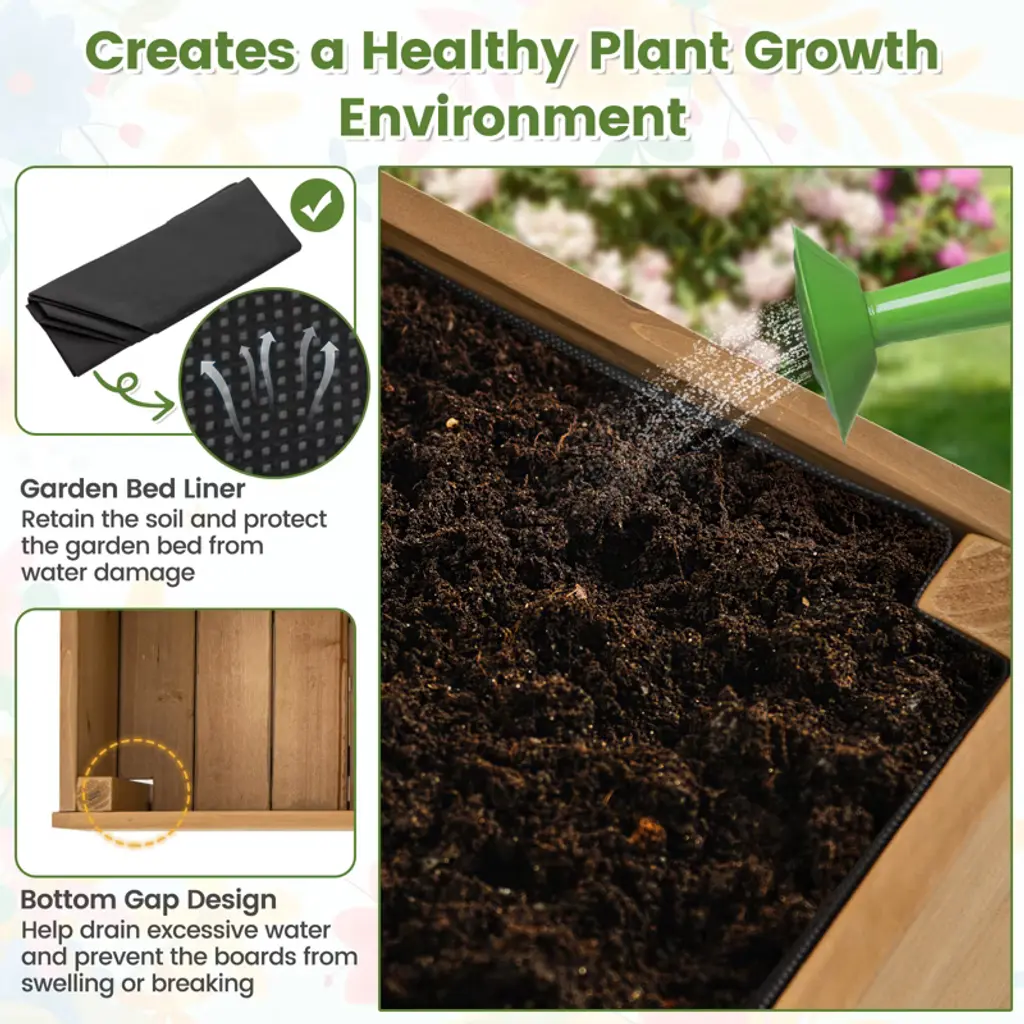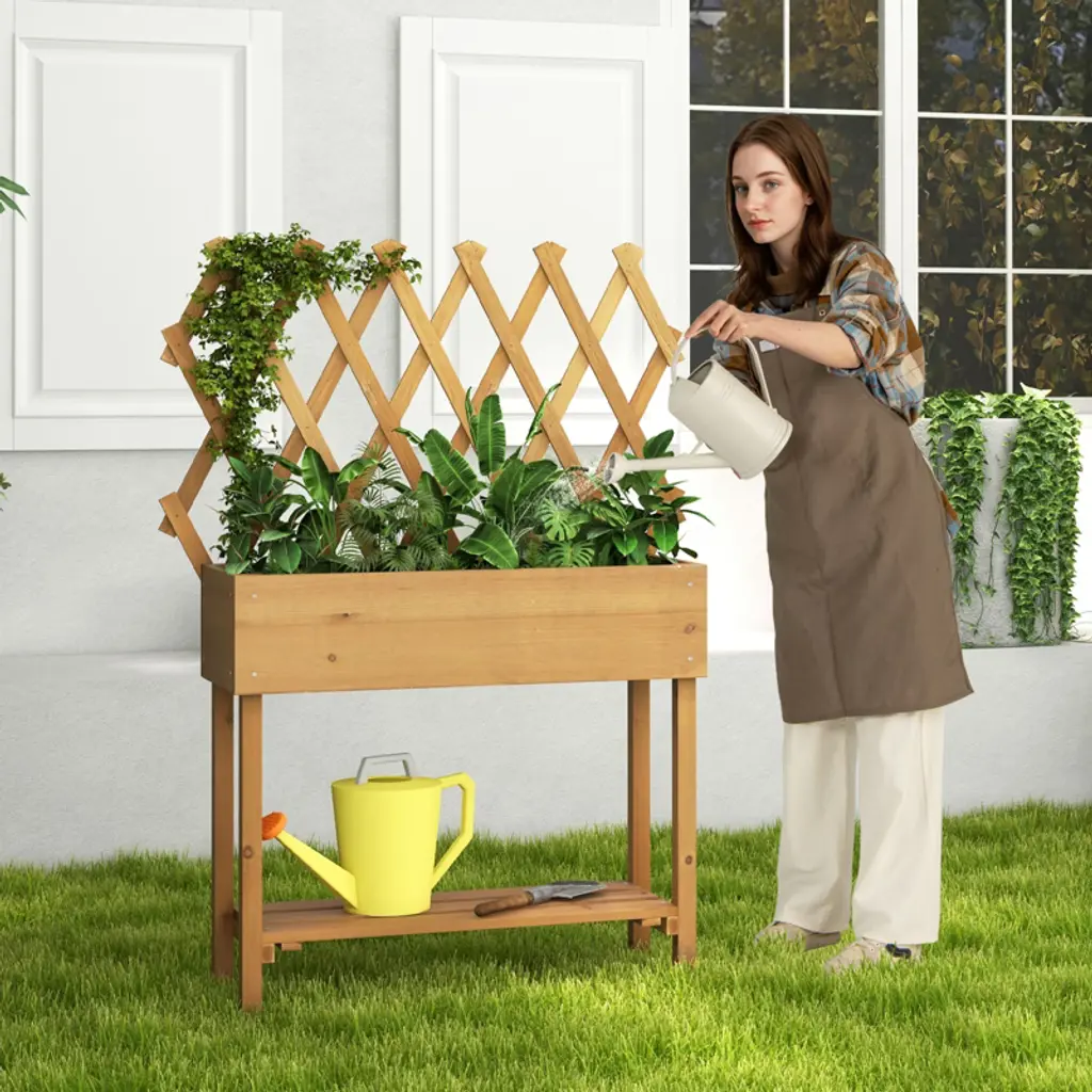 Creates a Healthy Plant Growth Environment! Our wooden raised garden bed with trellis measures 36” x 12” x 51” (L x W x H) and the planter box measures 30” x 11” x 7.5” (L x W x H). The large planter box is suitable for a variety of plants to thrive, such as flowers, herbs, vegetables, fruits, while the climbing trellis provides support for climbing plants. Besides, it comes with gaps on the bottom and a fabric liner, which can facilitate the drainage of excess water and keep plants and roots breathable. Other than that, it is crafted with 100% natural fir wood, which is deformation-resistant, weather-resistant, and long-lasting, so this garden bed would be a perfect choice for any indoor and outdoor gardening.FeaturesThe large planter box provides enough space for various plants to grow betterThe trellis is suitable for growing climbing plants, or hanging light strings, decorationsThe bottom shelf makes it easy to fetch gardening tools, watering pots, flowerpots, etcMade of natural fir wood, sturdy and long-lasting enough, not easy to deformWith delicate craftsmanship, it features a smooth and burr-free surfaceThe bottom gap design ensures good water drainage and well ventilationSpecifications: Color: Natural Material: Fir Wood, Liner Fabric Overall Dimensions: 36” x 12” x 51” (L x W x H) Size of the Planter Box: 30” x 11” x 7.5” (L x W x H) Height of the Planter Box: 30” Interior Size of the Planter Box: 29” x 10” x 6” (L x W x H) Size of the Bottom Shelf: 26.5” x 10” (L x W) Height of the Bottom Shelf: 78” Weight Capacity of the Planter Box: 66 lbs Weight Capacity of the Bottom Shelf:44 lbs Net Weight:13.5 lbs Package Includes: 1 x Wooden Raised Garden Bed 1 x User’s Manual