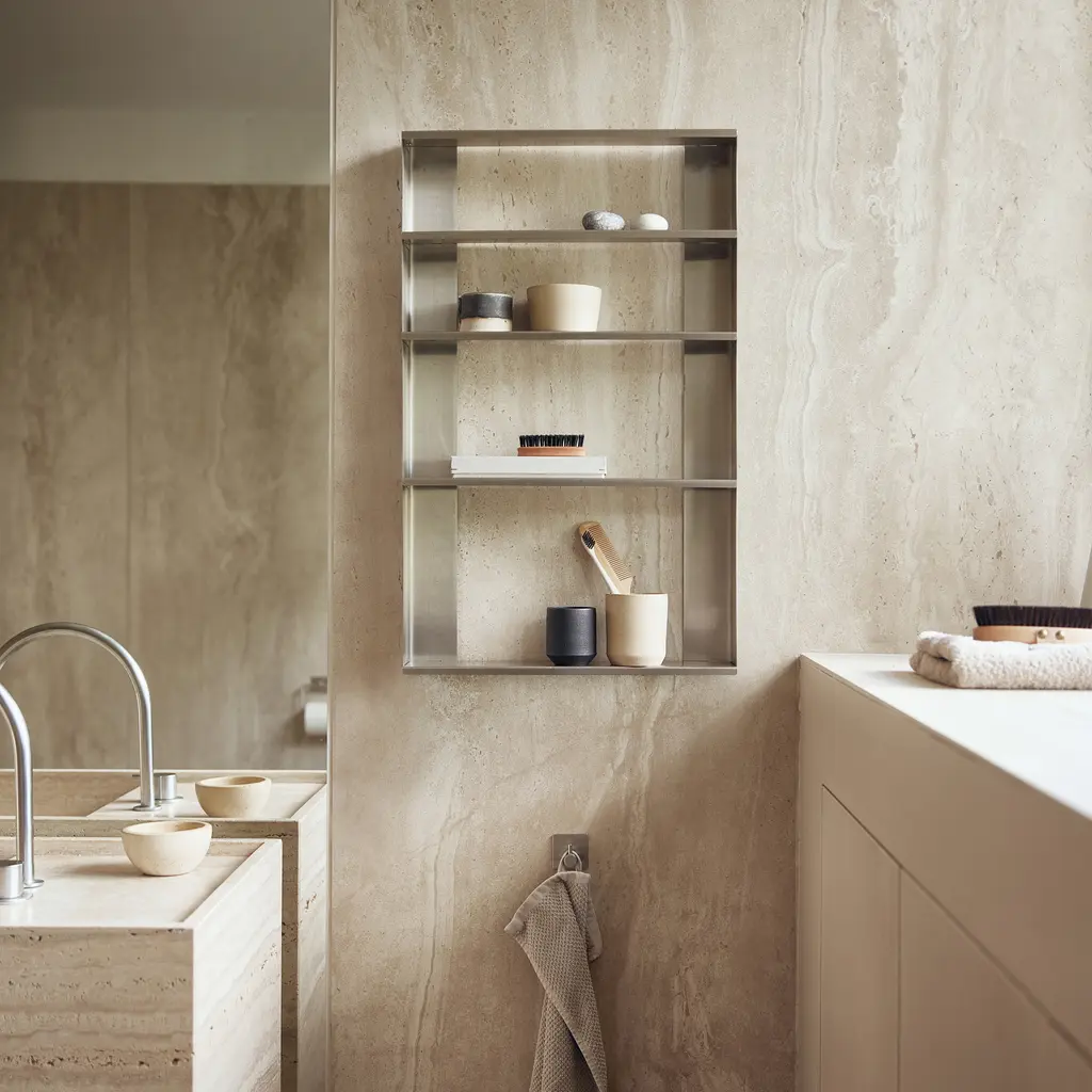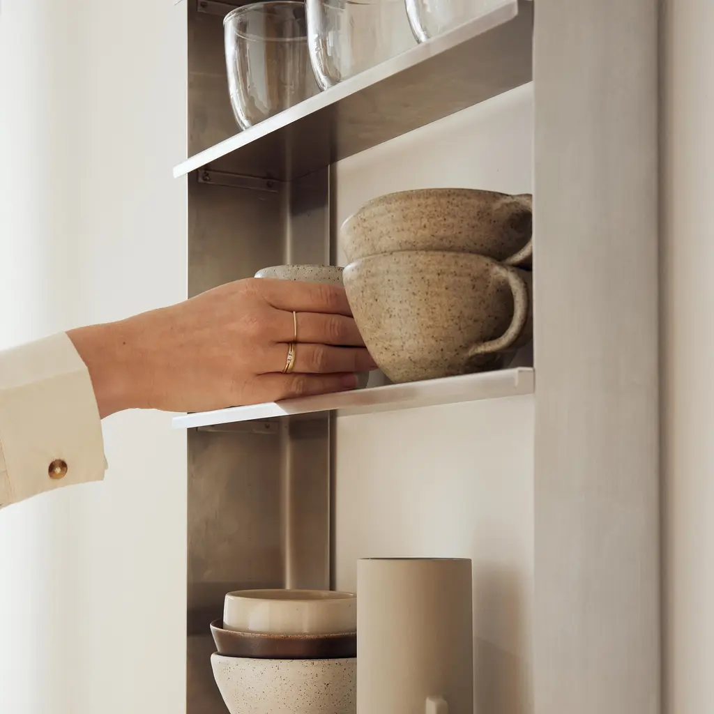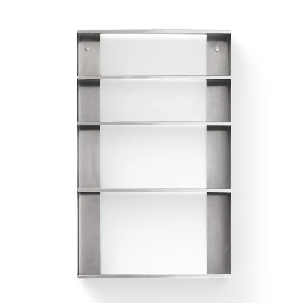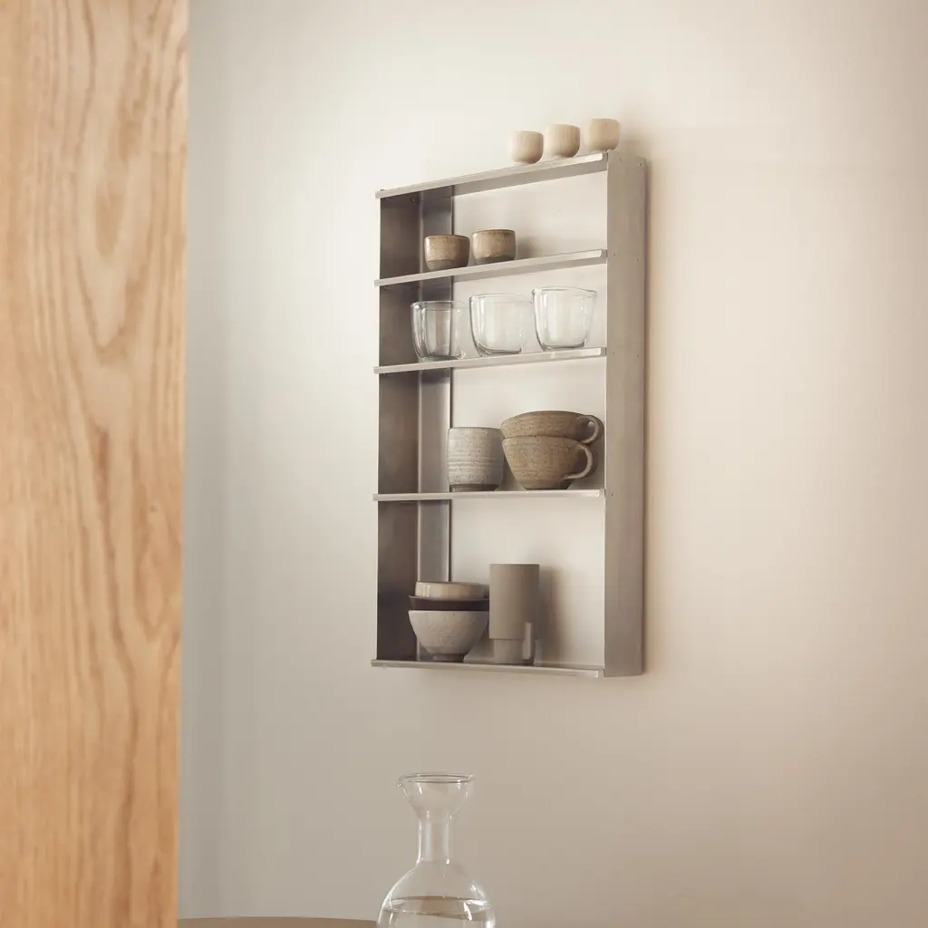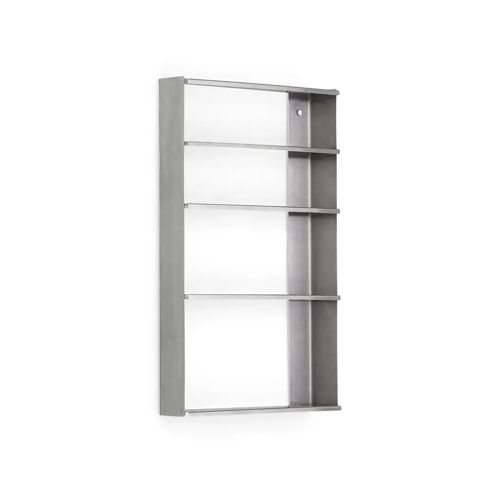A slender, yet capacious shelf unit, ideal for offering practical storage solutions in areas including kitchens, bathrooms, offices, corridors, or living areas. This unit is constructed with rear angle brackets, ensuring robust stability while retaining a streamlined and unobstructed design. Each shelf is designed with a subtly curved front edge, accentuating the fine details of the individual pieces and providing a gentle, tactile experience with the raw steel profiles. Thanks to its limited depth, this versatile unit serves as a stylish spot to display beloved items and conveniently store everyday necessities.