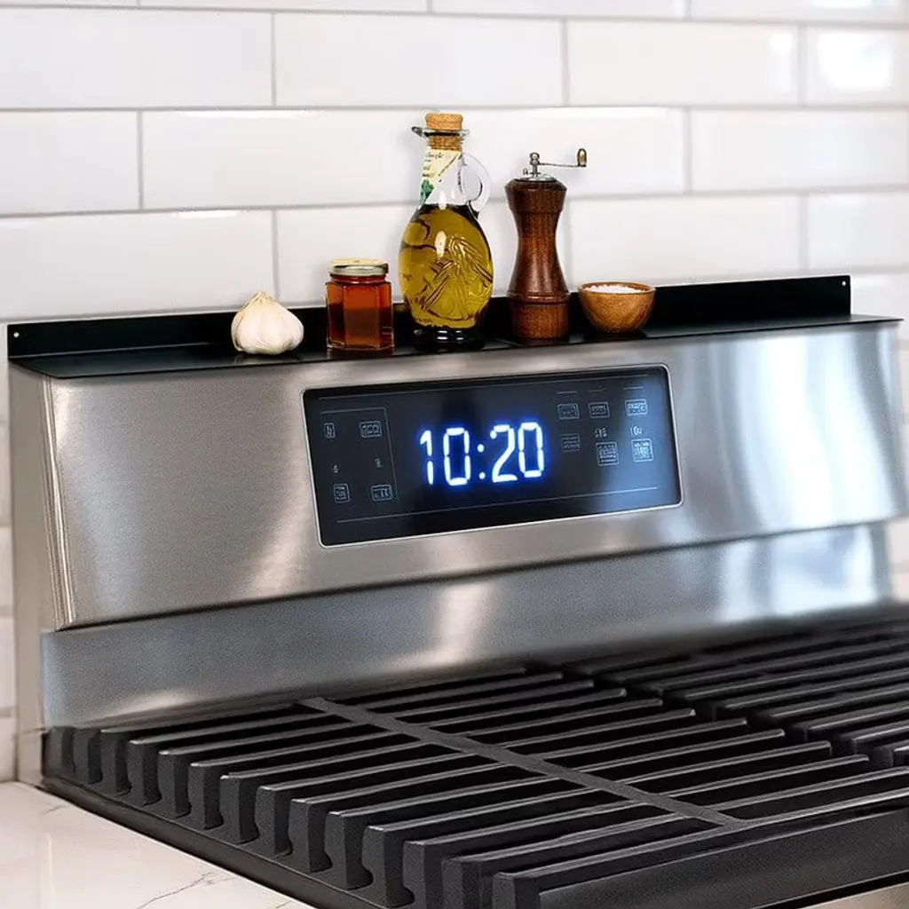 Magnetic 2-Pc Instant Stovetop Shelves snap right in place, creating extra room to organize spices, utensils and more. This set of 2 combines to fit most flat and curved ranges, and they are easy to clean. Back rail prevents items from falling behind the stove. Made of: Stainless steel Measurements: 15"W x 3-1/2"D x 1-1/8"H, each