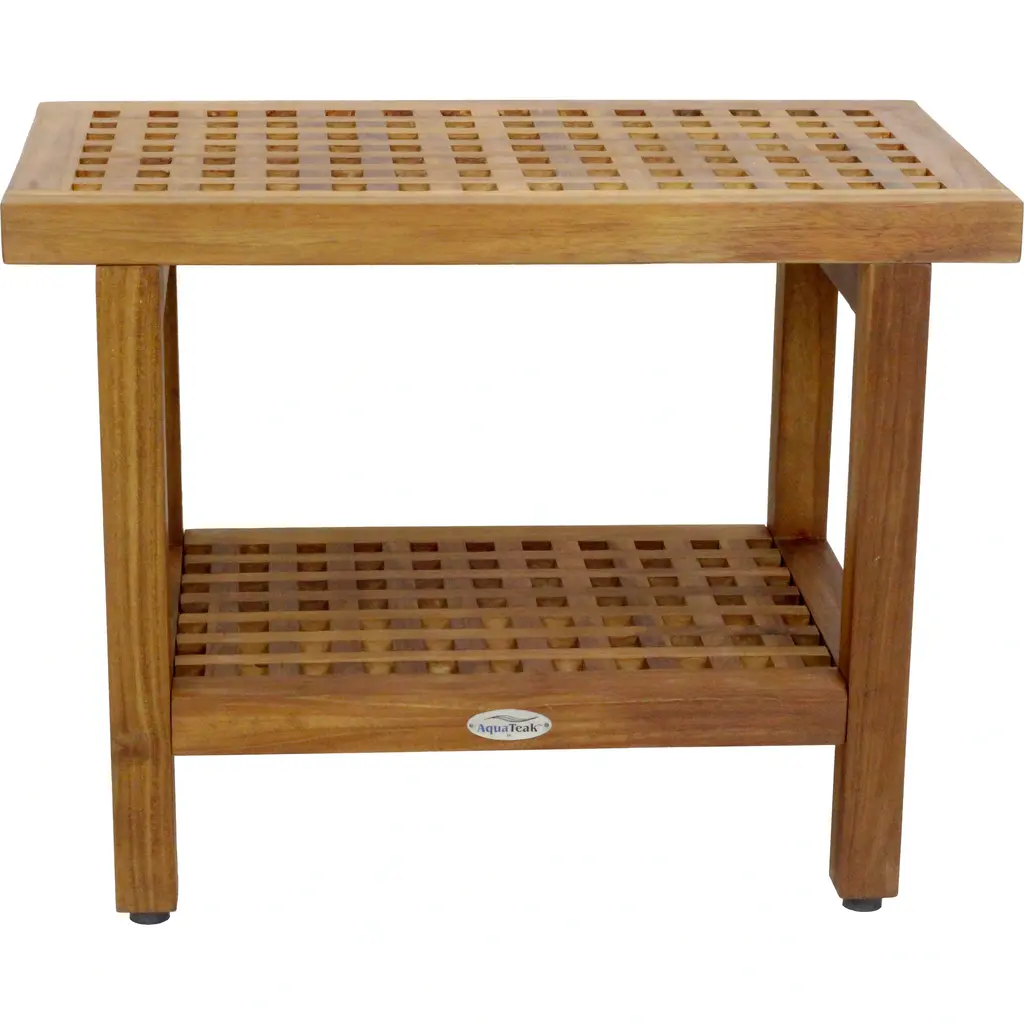 Elevate your space with this grated teak bench! This grate style teak shower seat is perfect for your shower or anywhere in your bathroom. The handcrafted solid teak shower stool will add a natural elegance to your home and is both durable and naturally water resistant. Wonderful water drainage Extra support at base Sturdy (Some Assembly Required) Ideal as a teak bath bench or outdoor accent piece, the convenient design is highly versatile, and can be used almost anywhere. Your teak shower stool also comes with all stainless steel hardware and includes rubber padded feet for safety and stability in any location.