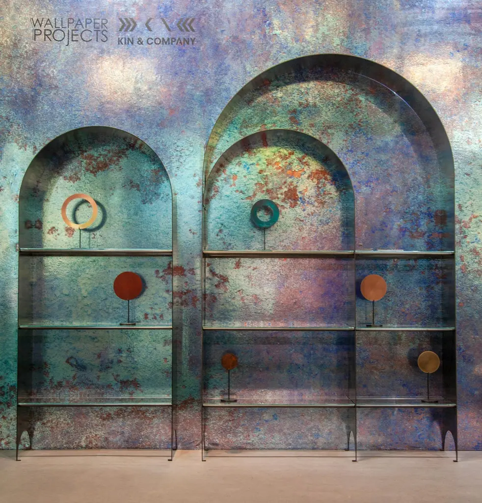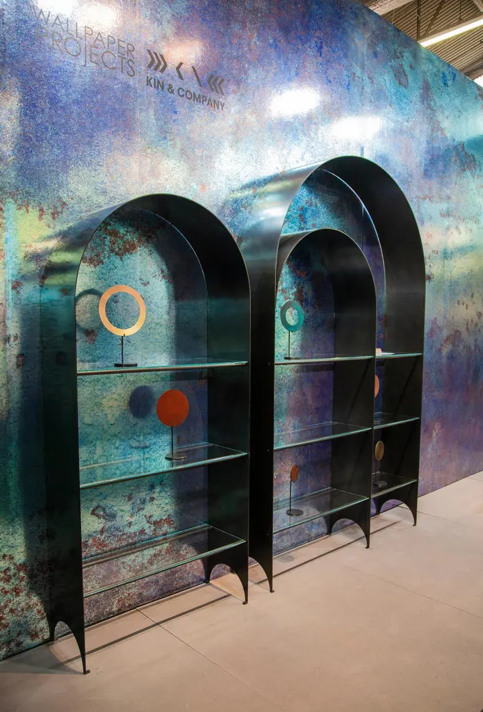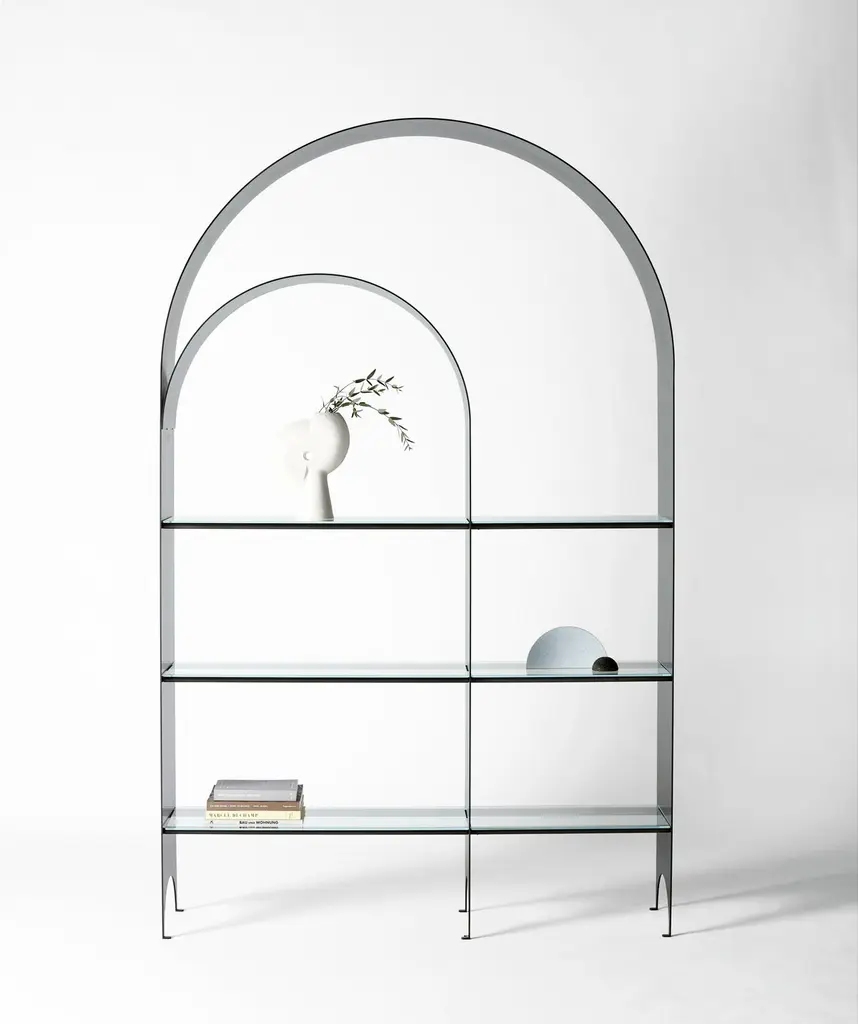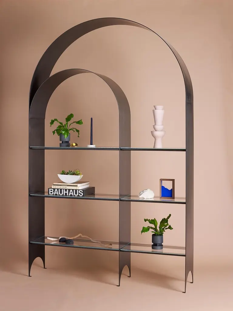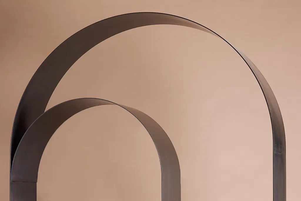 The thin shelf is the newest addition to the thin series, a collection exploring the potential of rigid yet pliant steel plates. The blackened steel arch of the Thin Shelf delicately extends upward from the floor tracing a double line along the wall. From different viewpoints the diaphanous shelves appear as either robust archways or razor-thin lines.