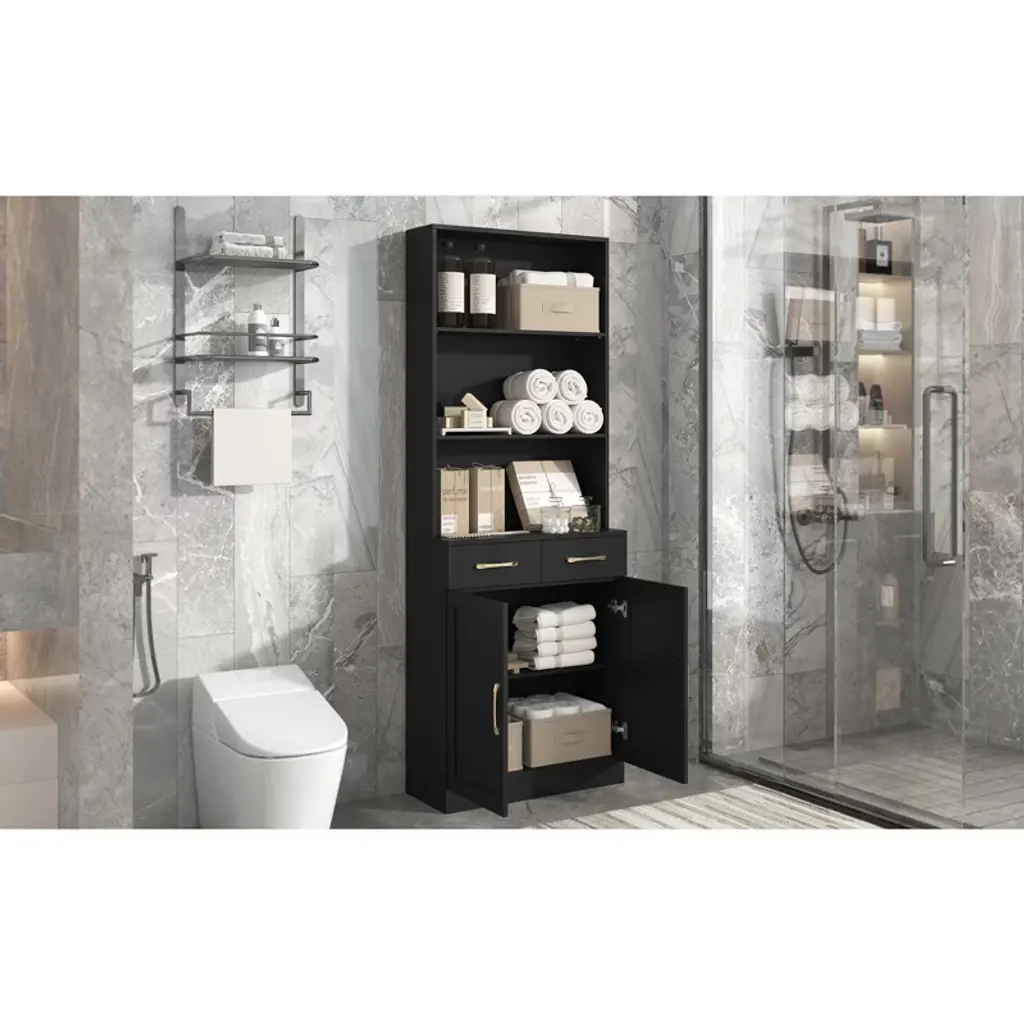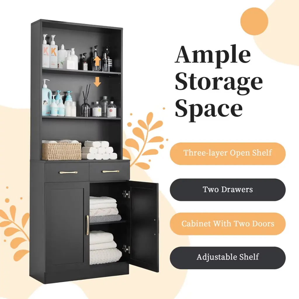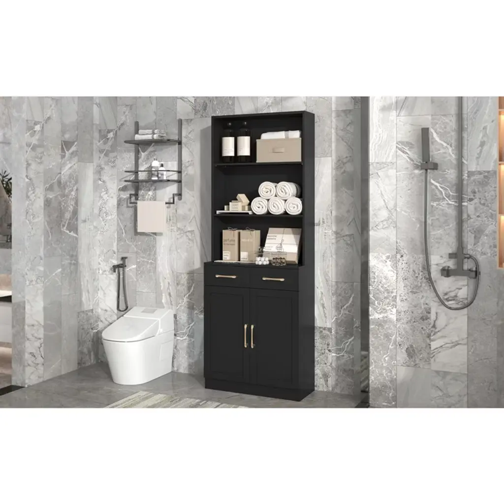 Bathroom Storage Cabinet, Cabinet with Two Doors and Drawers, Adjustable Shelf, Three-layer Open Shelf, MDF Board, Black. More Information Color Black Material MDF board Shape Rectangle Capacity 10lbs/adjustable shelf; 22lbs/shelf; 10lbs/drawer; 100lbs /in total Adjustable Shelf Yes Number of Drawers 2 Number of Doors 2 Anti-toppling Device Yes Package Include Cabinet, hardware, instruction Assembly Required Yes Country of Origin China Certificate CARB P2