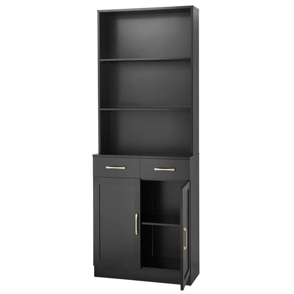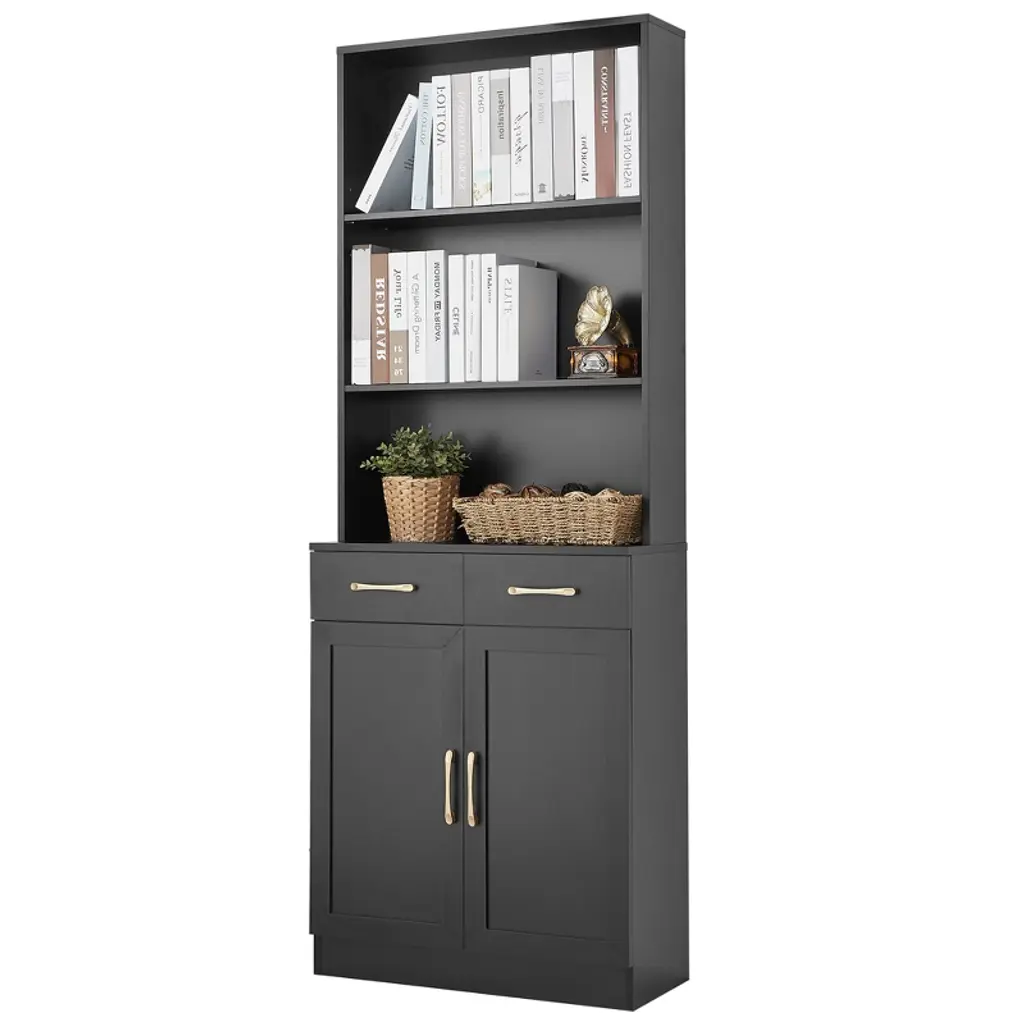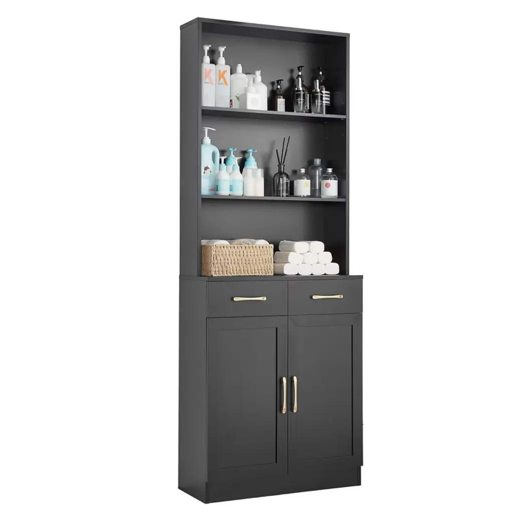 Bathroom Storage Cabinet, Cabinet with Two Doors and Drawers, Adjustable Shelf, Three-layer Open Shelf, MDF Board, Black. More Information Color Black Material MDF board Shape Rectangle Capacity 10lbs/adjustable shelf; 22lbs/shelf; 10lbs/drawer; 100lbs /in total Adjustable Shelf Yes Number of Drawers 2 Number of Doors 2 Anti-toppling Device Yes Package Include Cabinet, hardware, instruction Assembly Required Yes Country of Origin China Certificate CARB P2