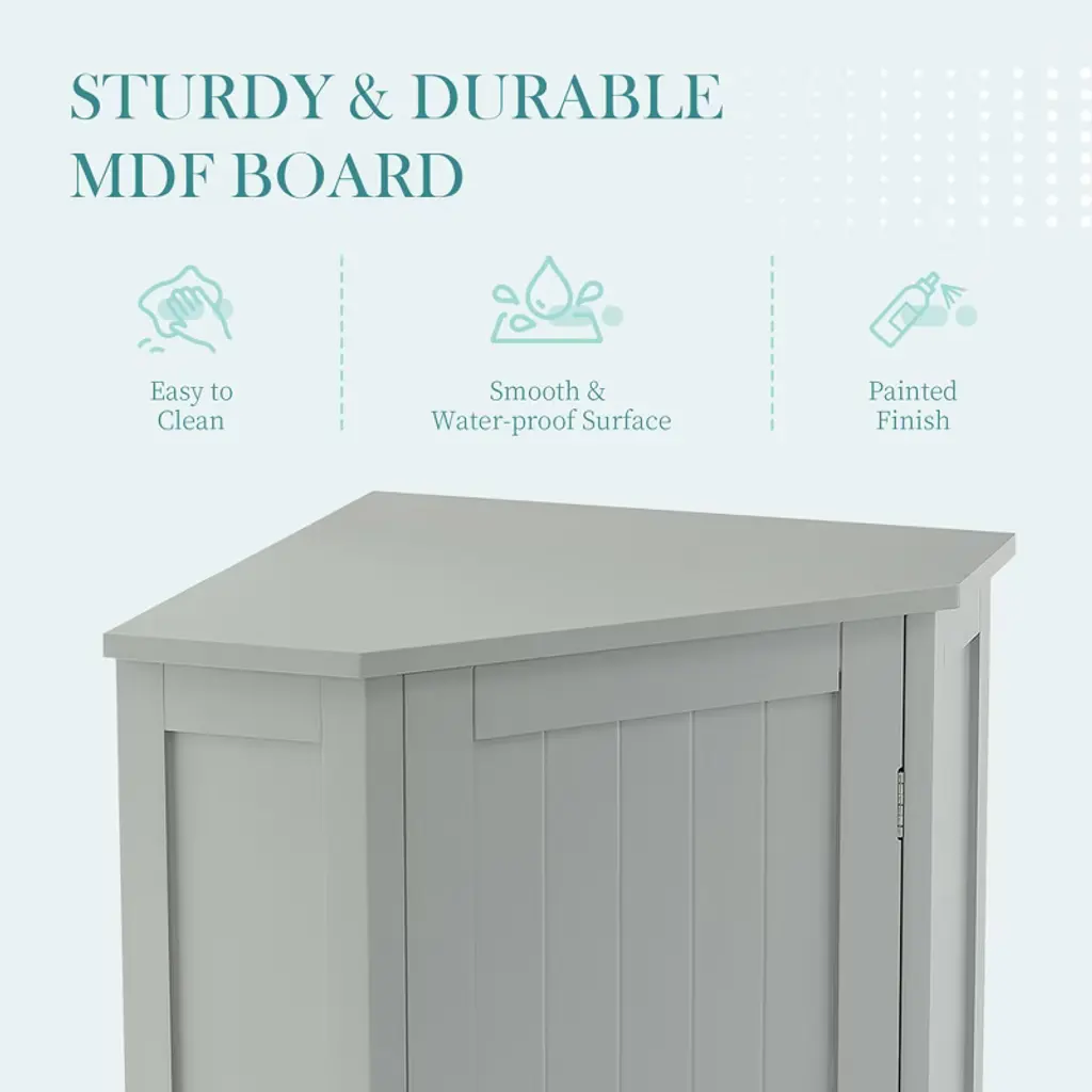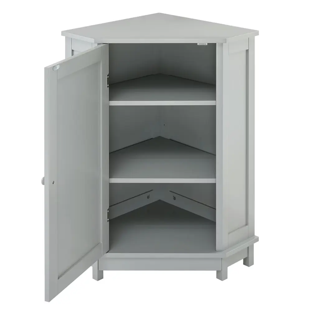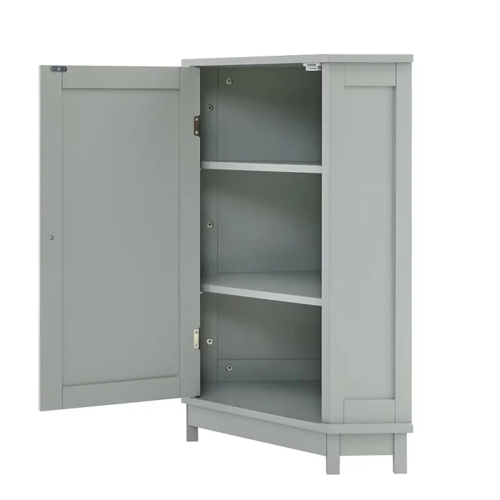 Maximize your bathroom storage with this stylish corner cabinet that blends seamlessly with any decor. Its simple yet modern design creates an eye-catching focal point while providing practical organization for towels, toiletries and cleaning essentials. Crafted from durable MDF board with a neutral grey finish, this space-saving cabinet features three adjustable shelves to accommodate items of varying heights. The versatile middle shelves can be customized to store taller bottles or stack folded linens, making it the perfect functional addition to any bathroom space.