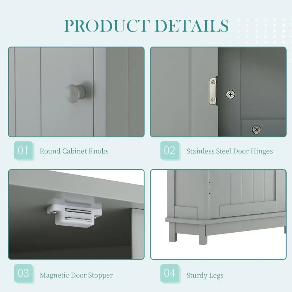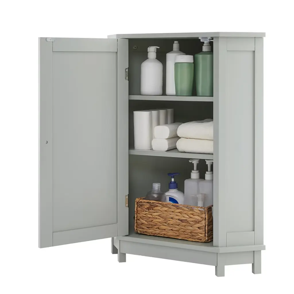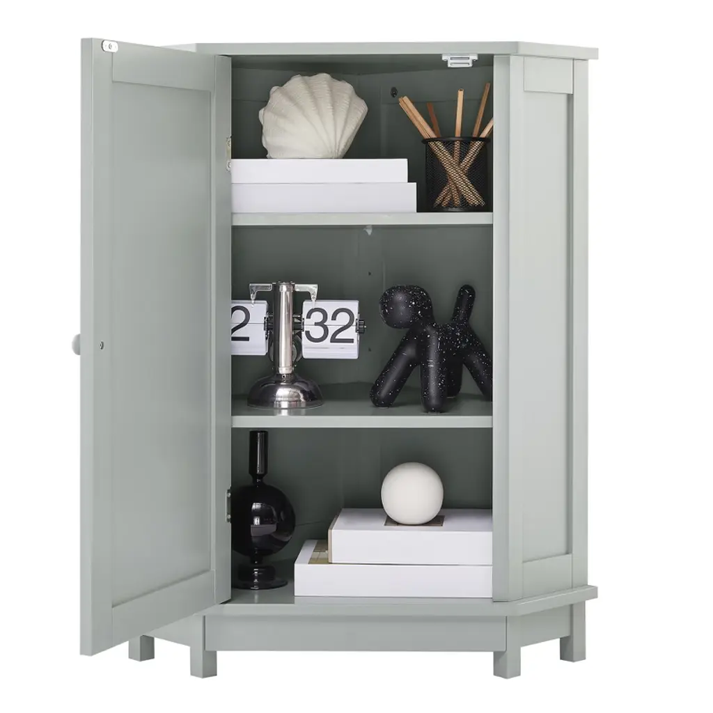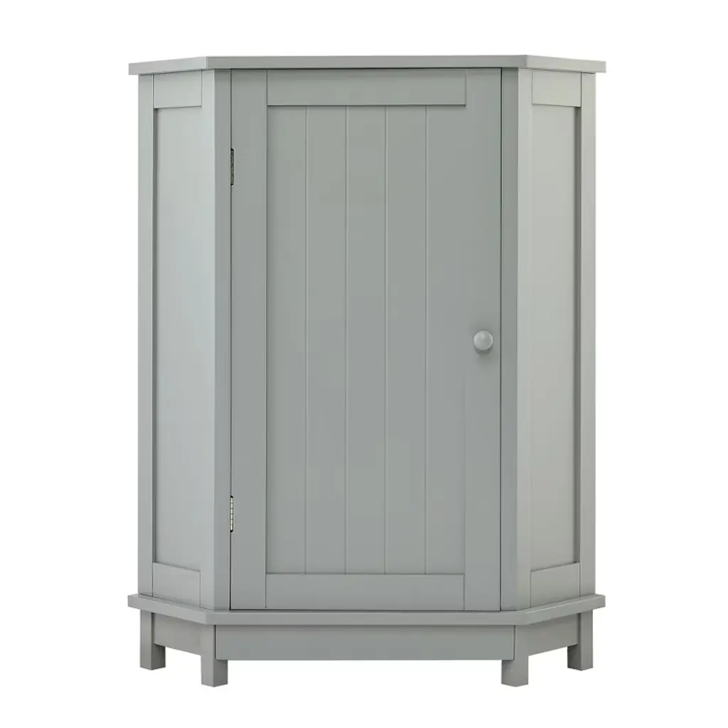 Maximize your bathroom storage with this stylish corner cabinet that blends seamlessly with any decor. Its simple yet modern design creates an eye-catching focal point while providing practical organization for towels, toiletries and cleaning essentials. Crafted from durable MDF board with a neutral grey finish, this space-saving cabinet features three adjustable shelves to accommodate items of varying heights. The versatile middle shelves can be customized to store taller bottles or stack folded linens, making it the perfect functional addition to any bathroom space.